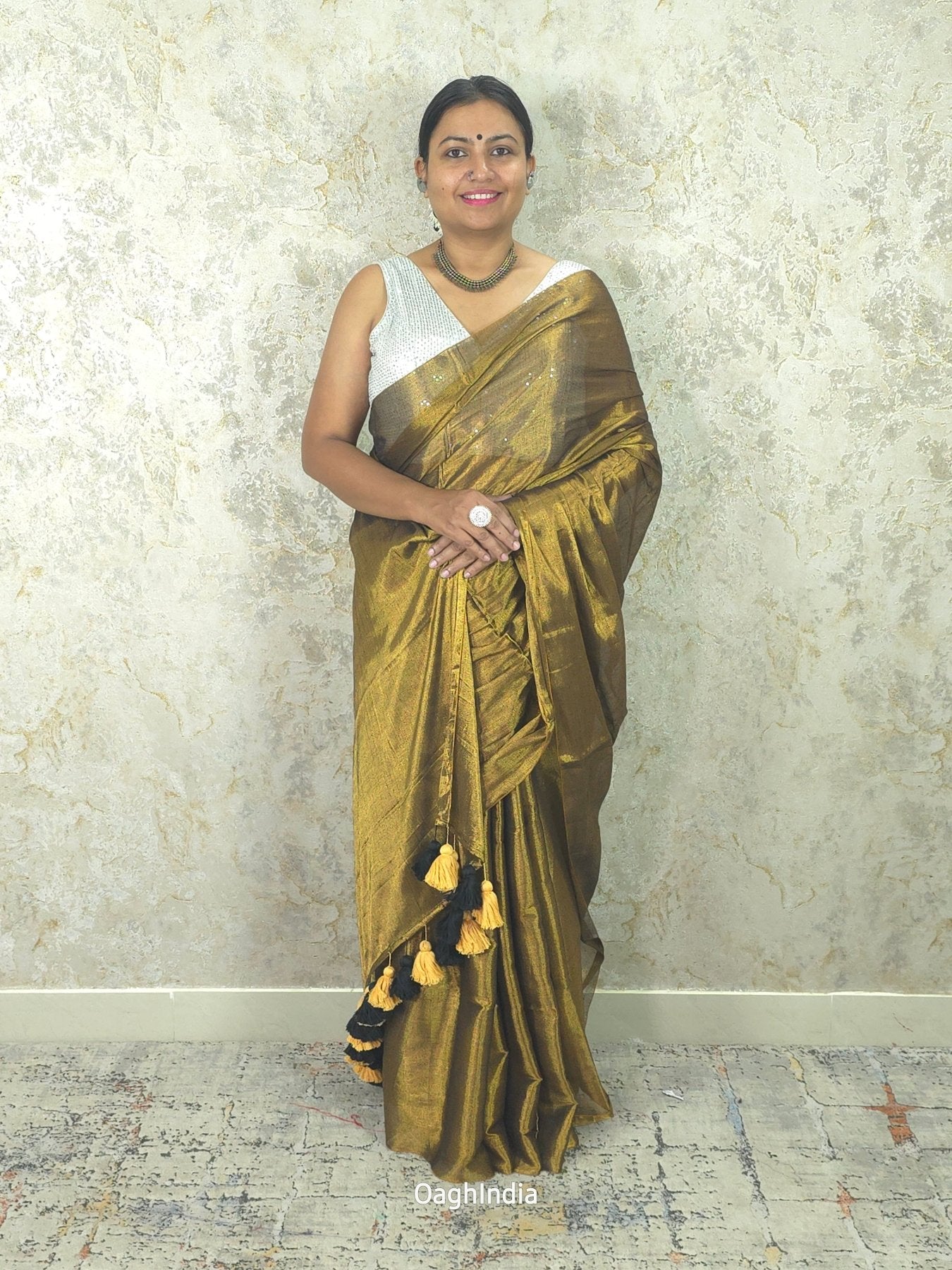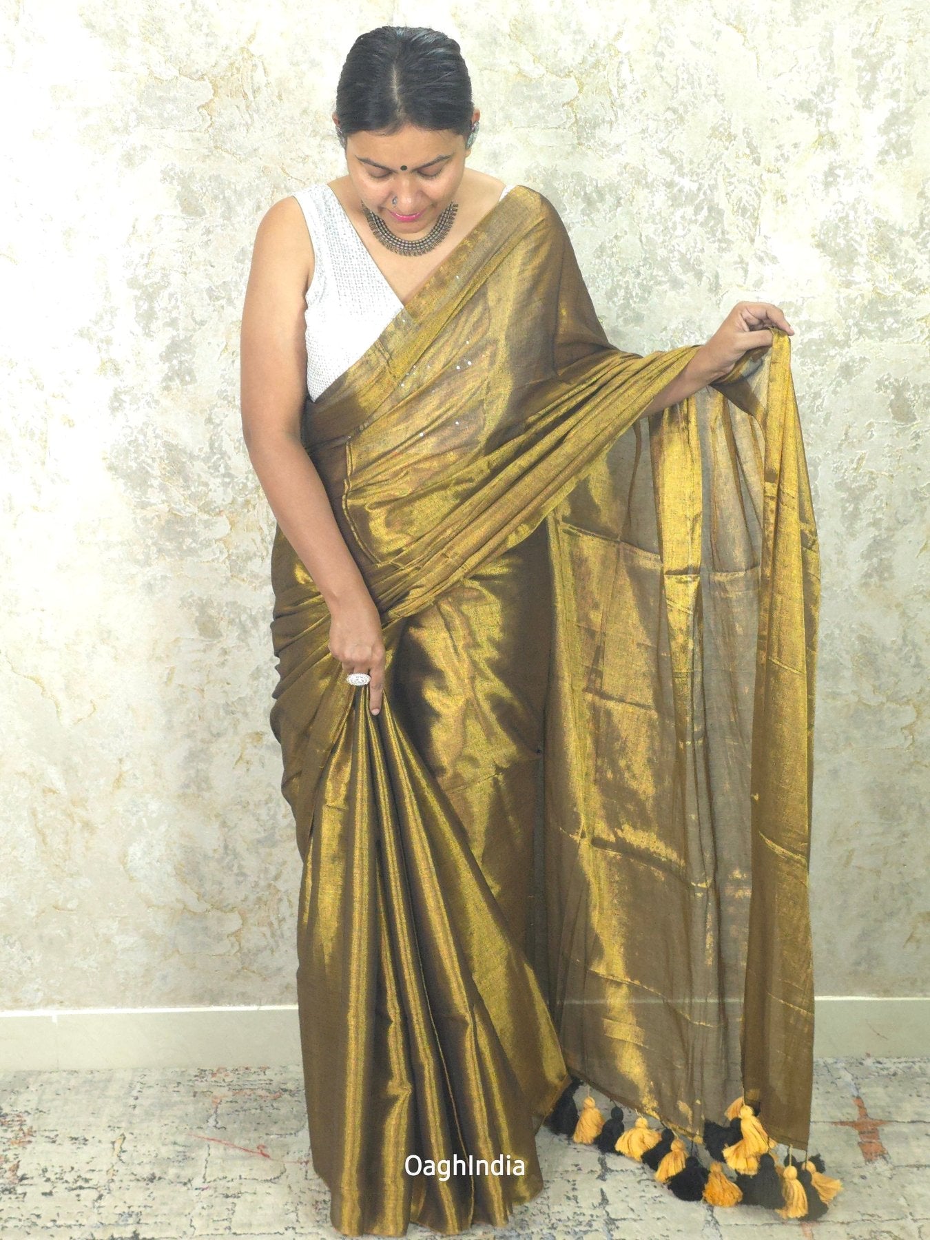 This tissue saree comes with big tassels attached on the Pallu stitched perfectly.