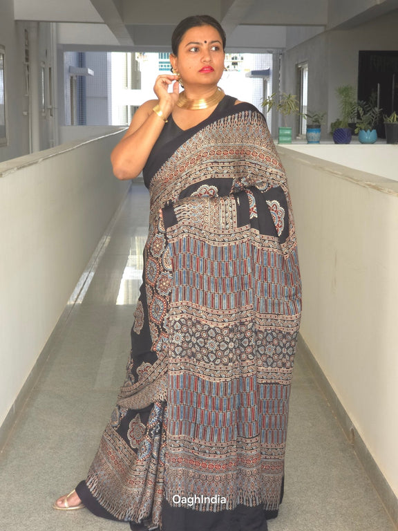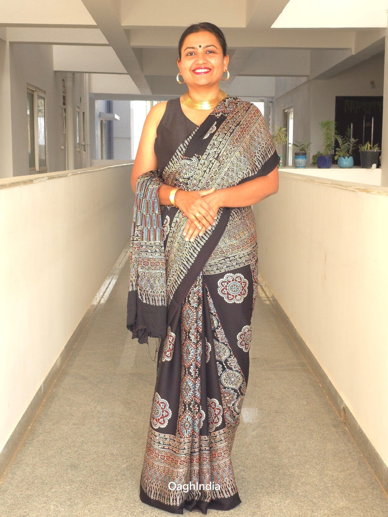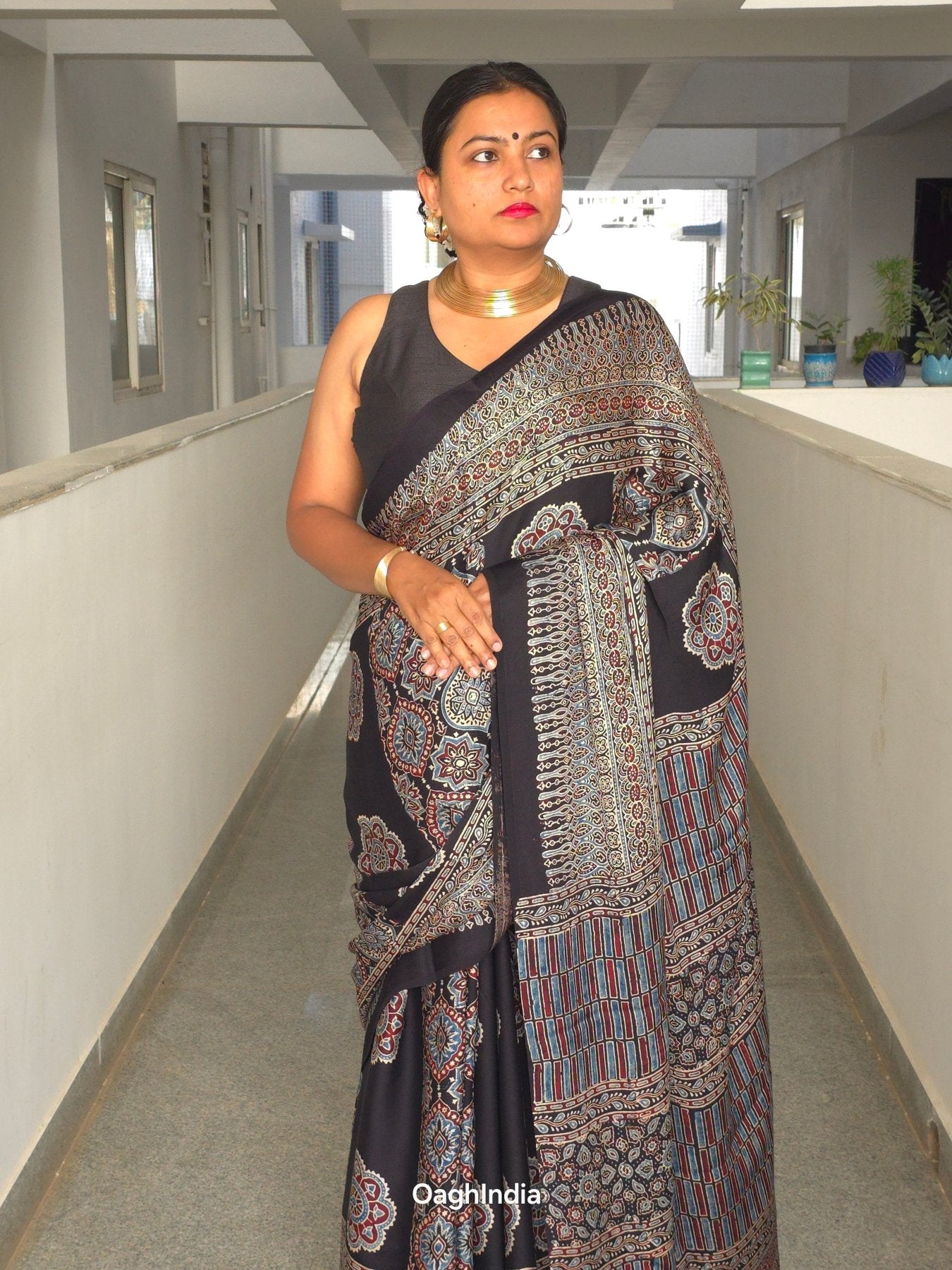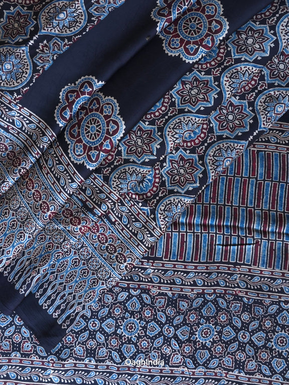 Discover the timeless allure of Ajrakh Modal Sarees, a testament to the rich heritage of Ajrakh handblock printing. Originating from the ancient craft traditions of Gujarat and Rajasthan, Ajrakh artistry is celebrated for its intricate geometric patterns and natural dyes, crafted using traditional techniques passed down through generations.