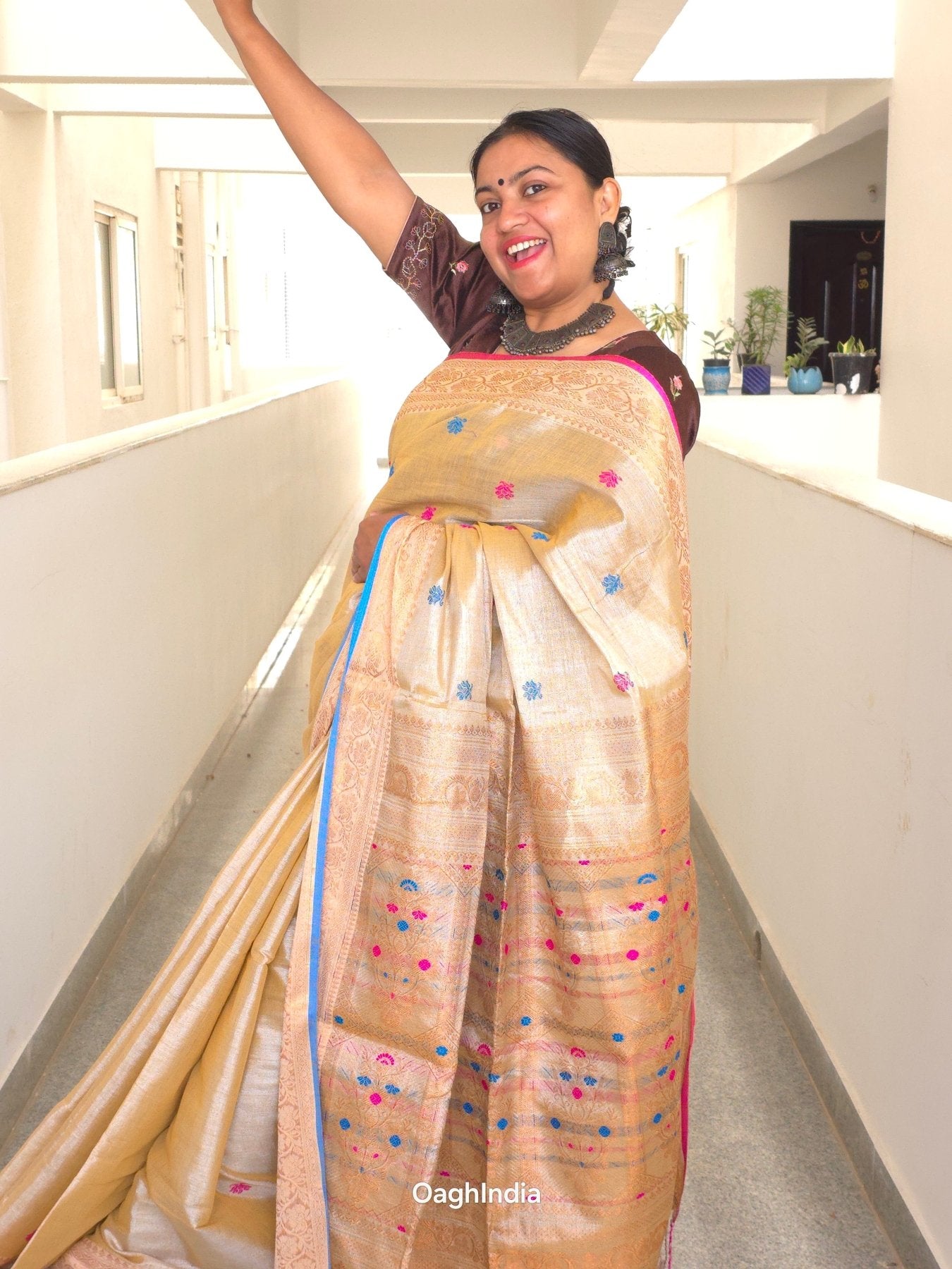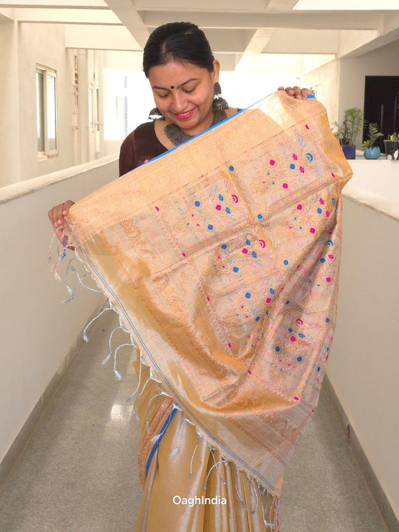 Step into the world of timeless elegance with our Tissue Kanjivaram Saree from Oagh India's Heeramandi-inspired collection. This saree embodies the rich heritage and opulence of traditional Indian craftsmanship. Crafted with meticulous attention to detail, it brings together the shimmer of metallic tissue with the intricate beauty of Kanjivaram weaving.