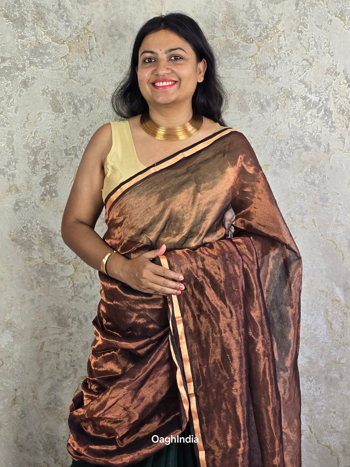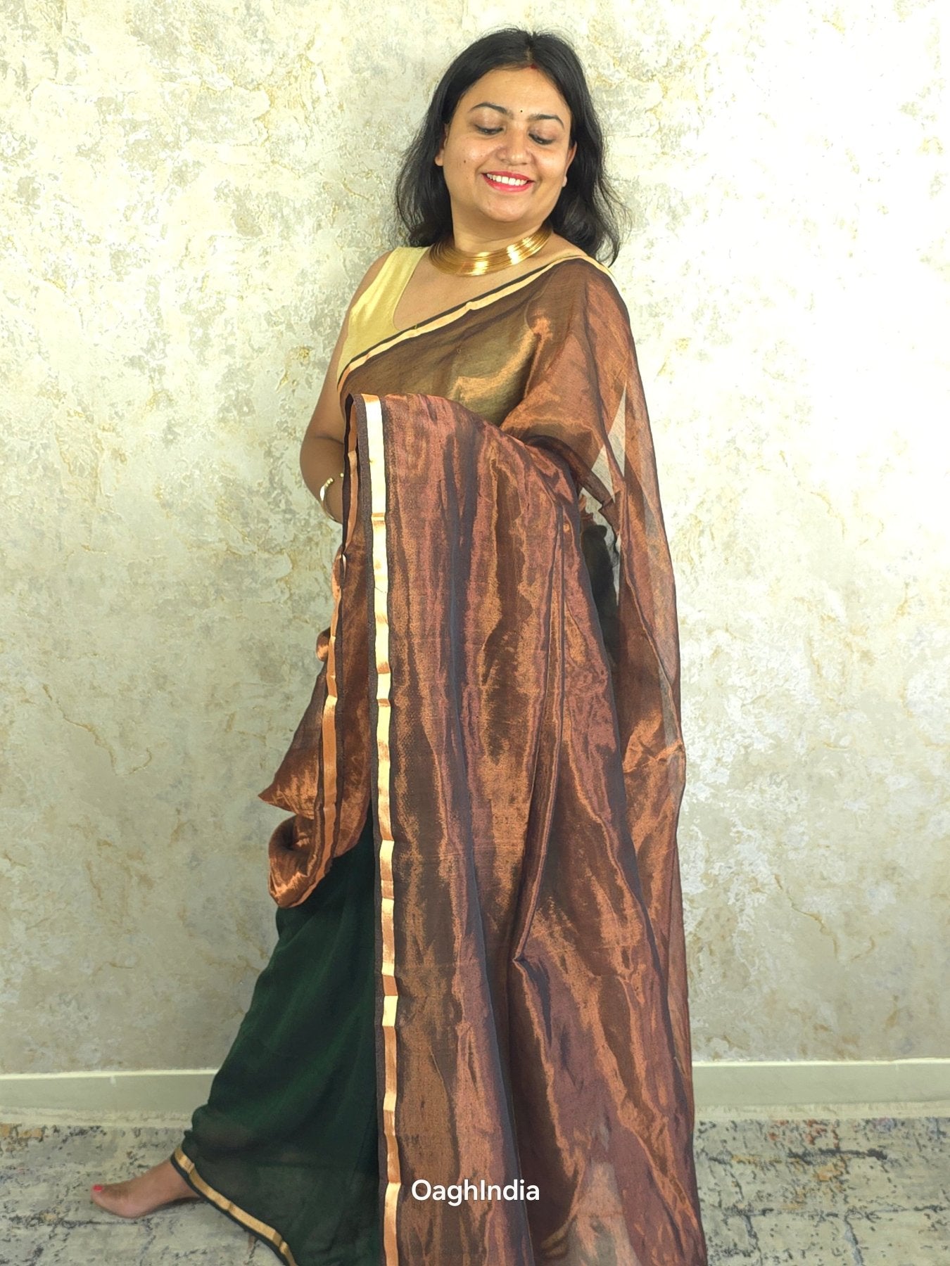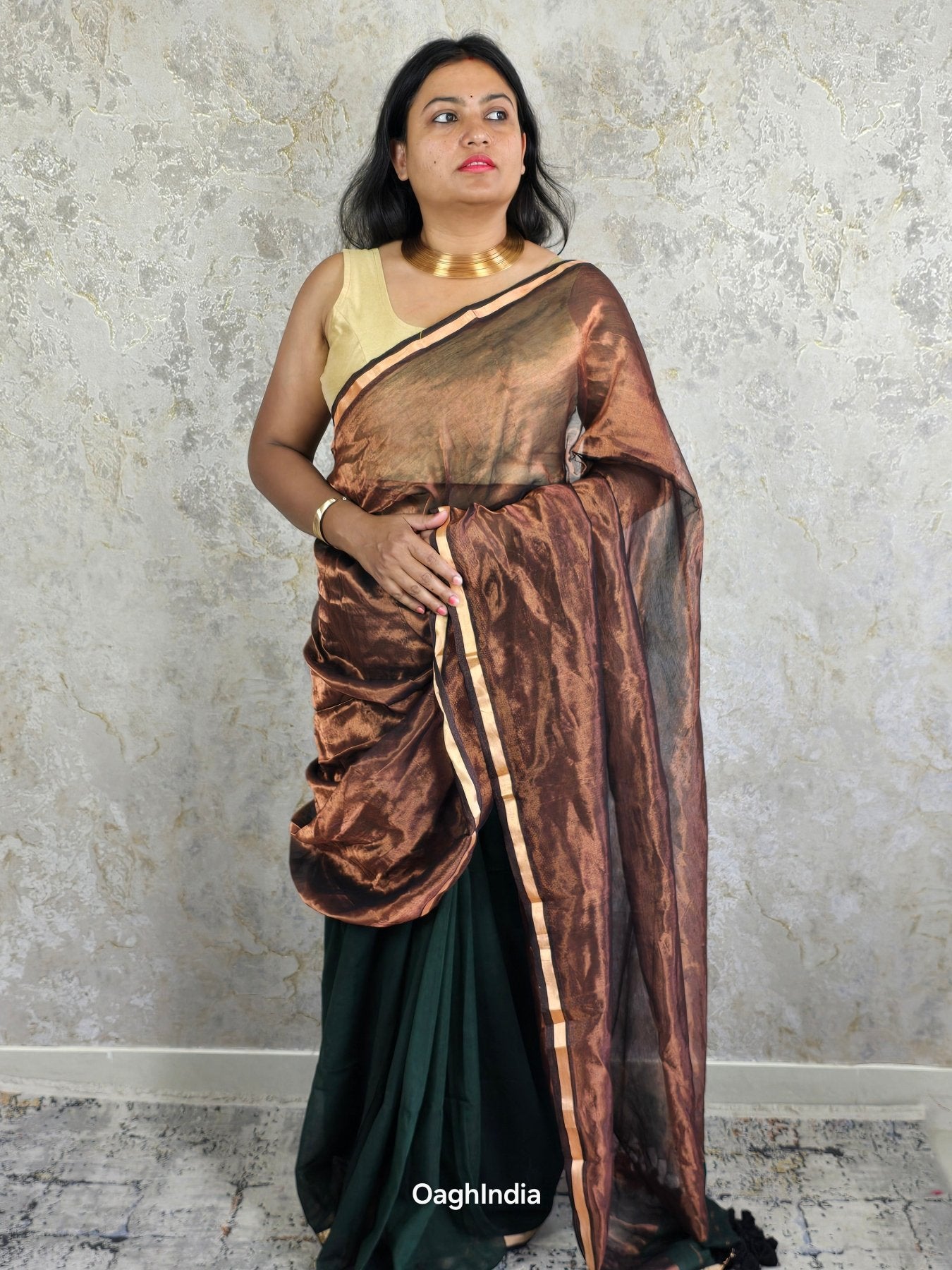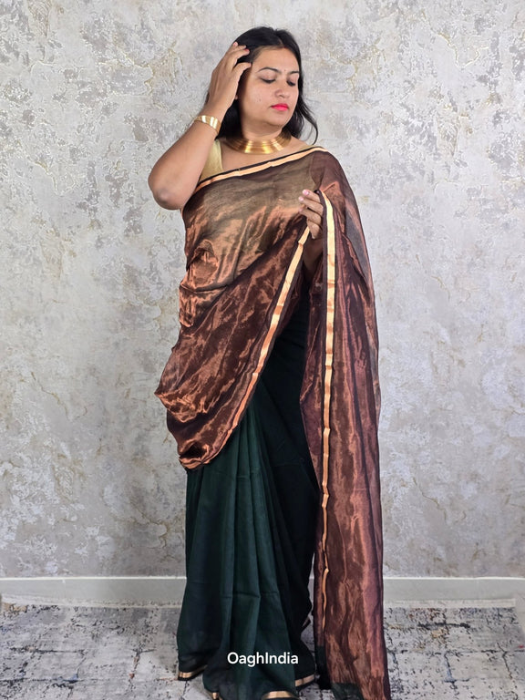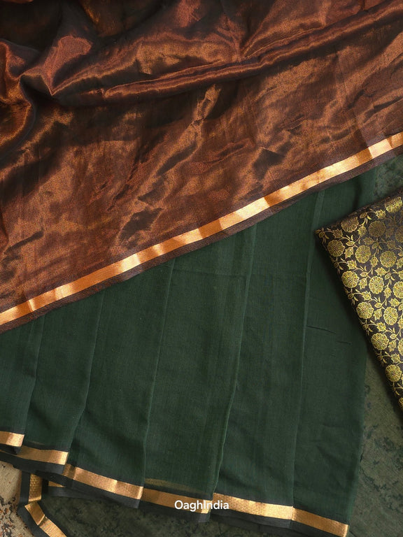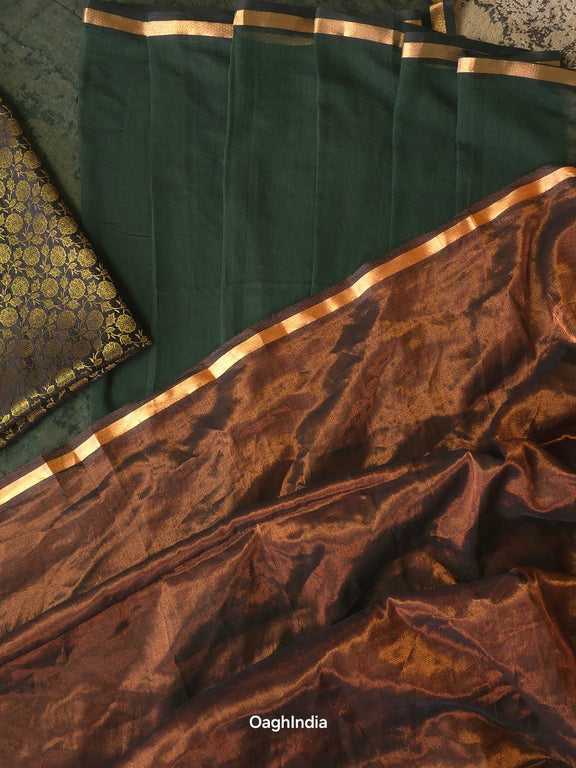 Dark Chocolate is where timeless grace meets modern ease. Crafted with soft dark green mul cotton on the body, this saree drapes like a dream, gently contouring your silhouette for a flattering, slimming effect. The rich copper tissue pallu, finished with a lustrous golden border, adds just the right amount of shimmer. Perfect for evenings when you want to make a statement with effortless sophistication.