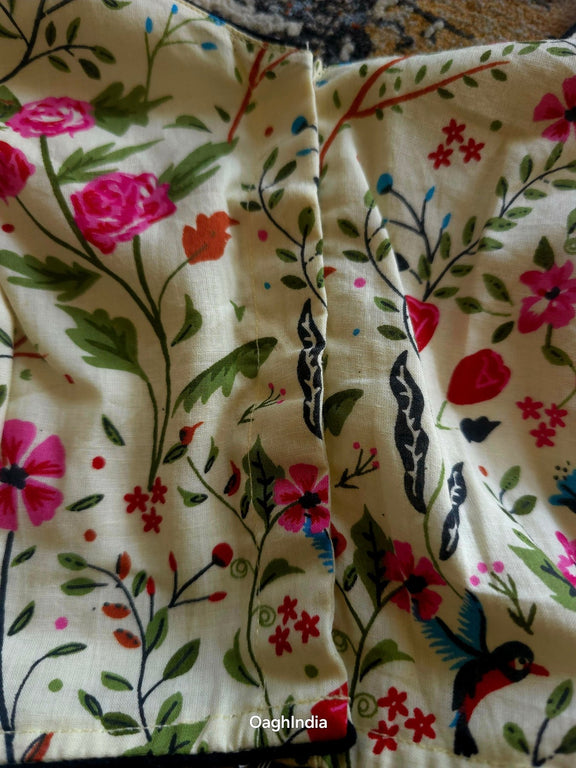 Add a touch of timeless elegance to your wardrobe with this super soft cotton blouse piece. Featuring a delicate beige base, it is beautifully adorned with vibrant pink roses, charming pink and blue flowers, and lush green leaves that bring a refreshing floral appeal. The fabric is lightweight, breathable, and gentle on the skin, ensuring all-day comfort.