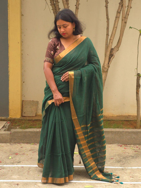 Available in a solid color, the luxurious body of the saree drapes beautifully, exuding an aura of grace and refinement. The copper border adds a touch of sophistication, while minimal work on the pallu enhances the saree's subtle charm. Perfect for the modern woman who values elegance and tradition, this saree is a versatile piece suitable for any occasion.