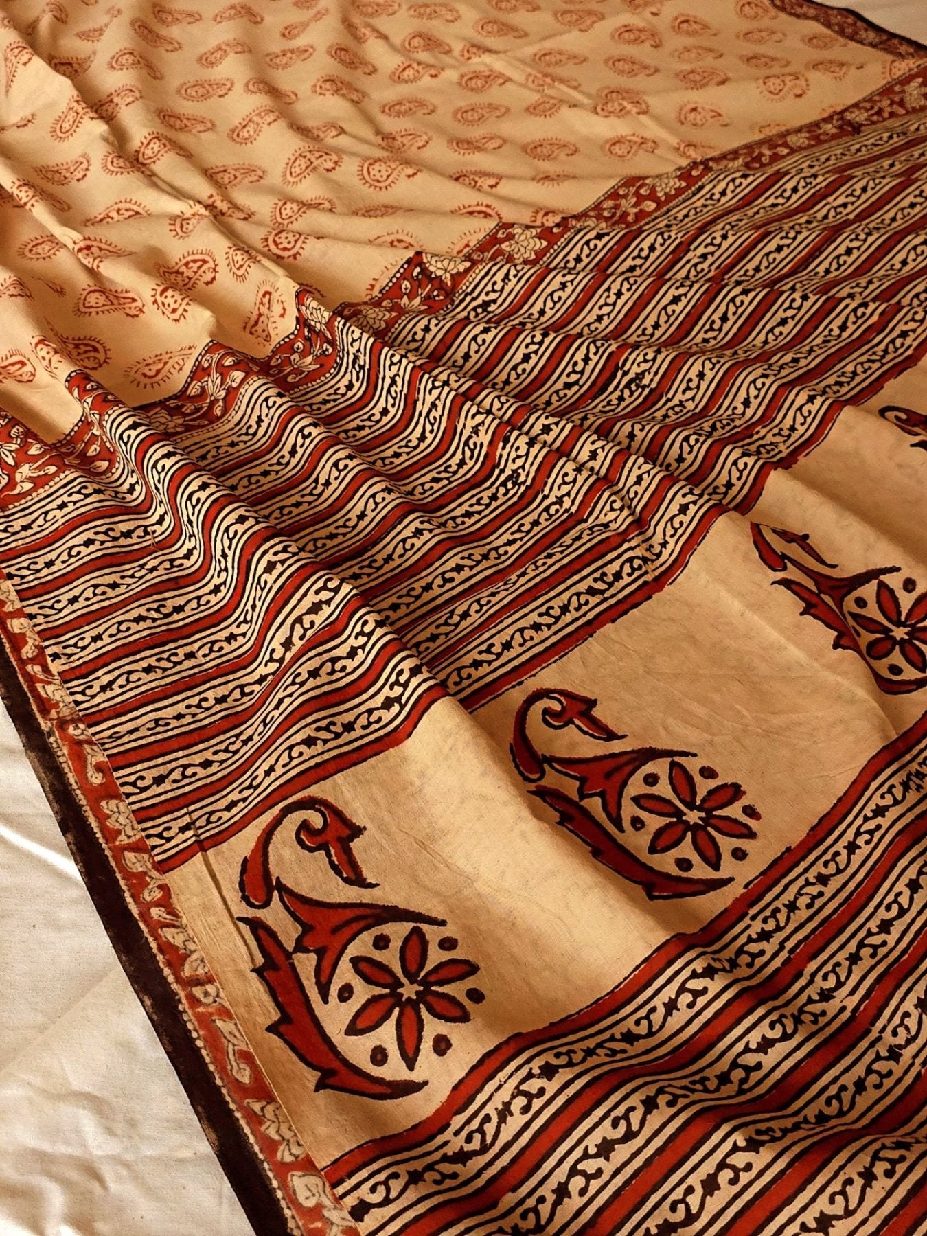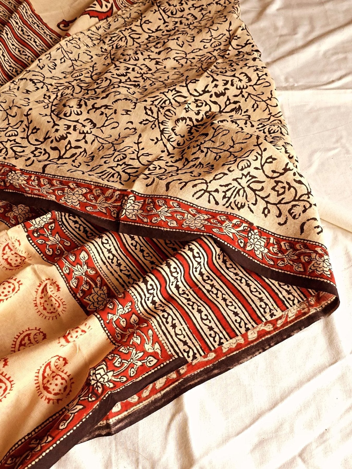 Colour: Beige base with rust red, black, and natural dye prints