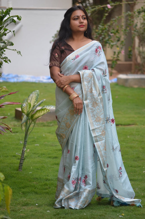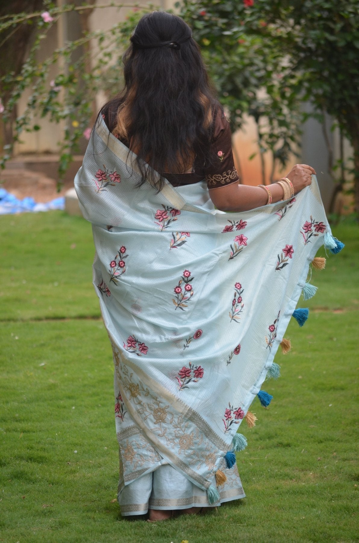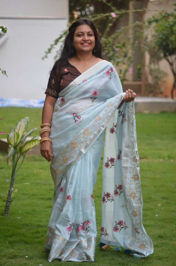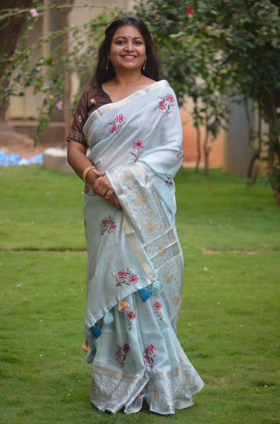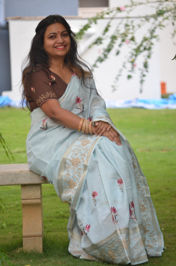 The sheer fabric of Kota Doriya, combined with elaborate embroidery, creates a stunning visual appeal, making these sarees a versatile choice for both casual and festive wear. The embroidery work adds a touch of elegance, enhancing the saree’s ethereal beauty.