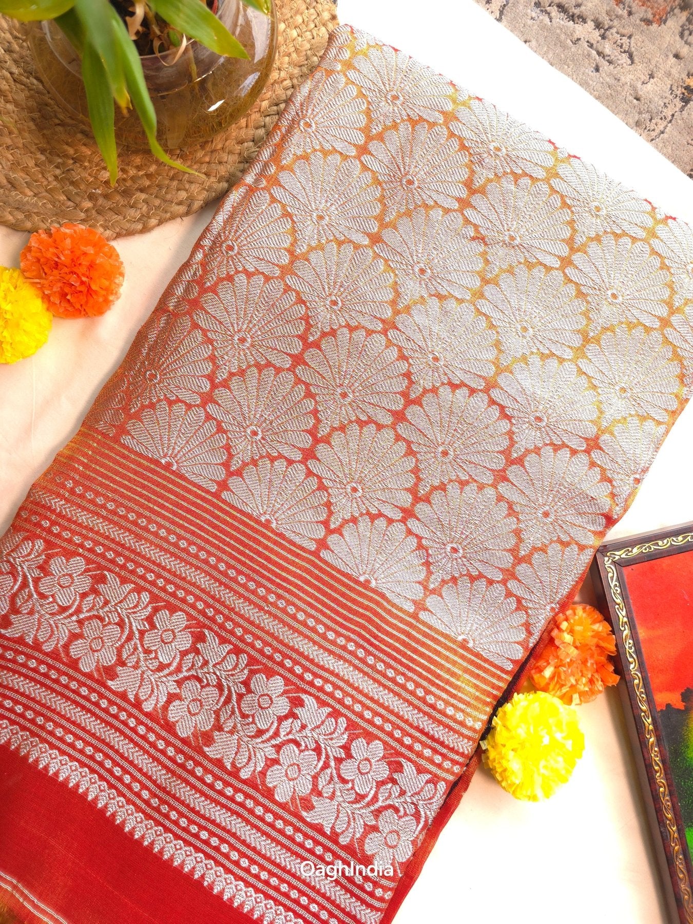 Step into the world of timeless elegance with our Tissue Kanjivaram Saree from Oagh India's Heeramandi-inspired collection. This saree embodies the rich heritage and opulence of traditional Indian craftsmanship. Crafted with meticulous attention to detail, it brings together the shimmer of metallic tissue with the intricate beauty of Kanjivaram weaving.