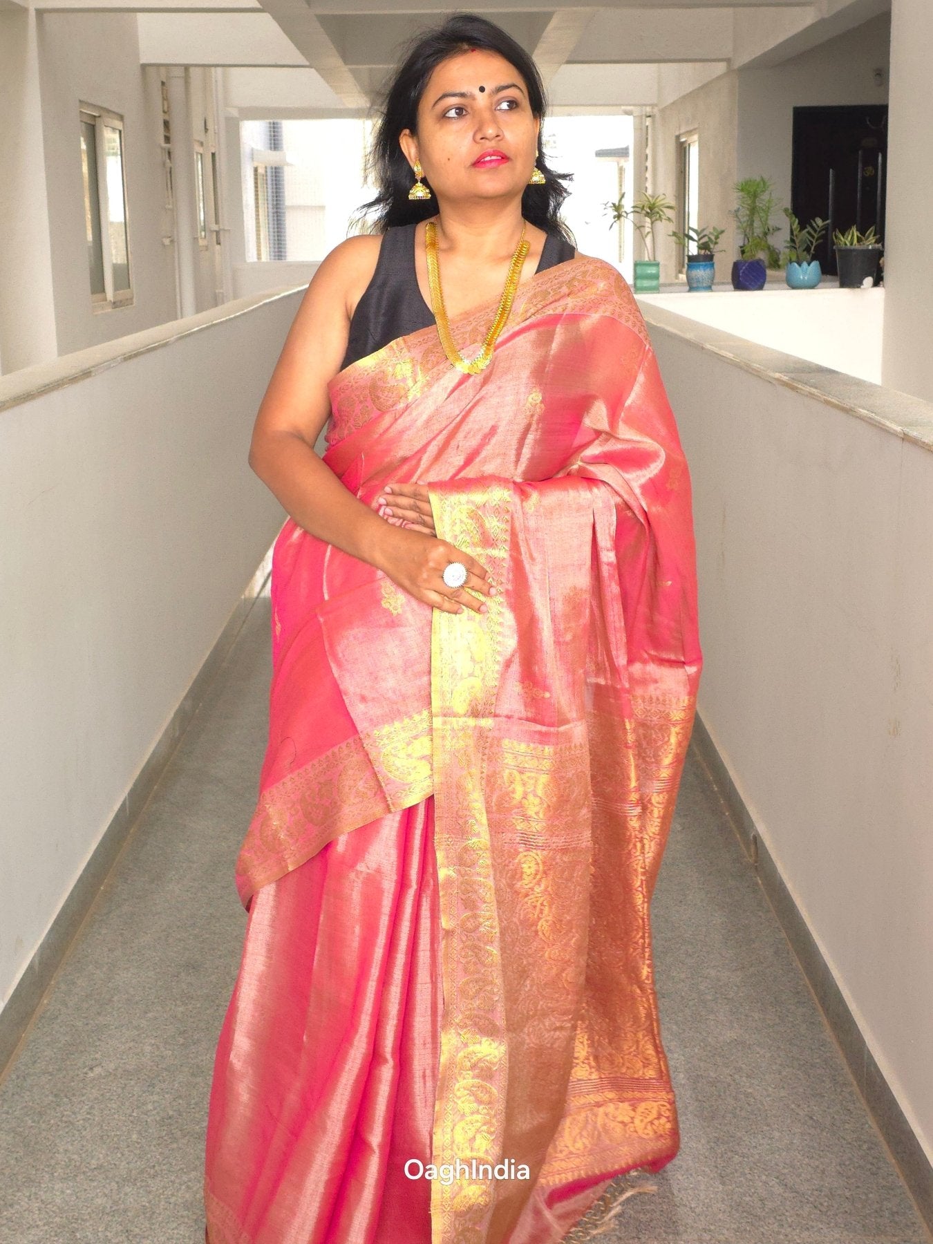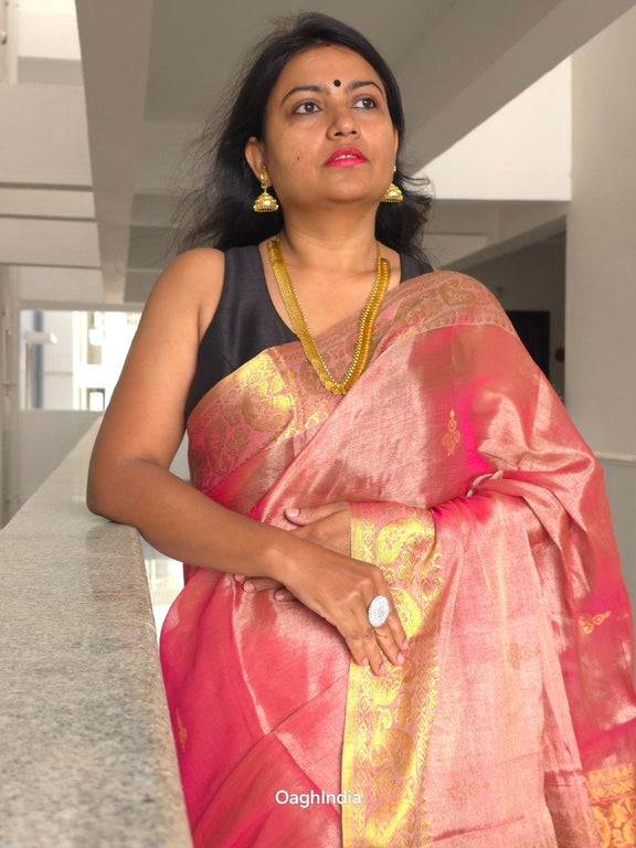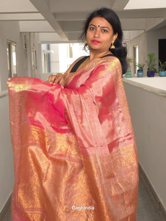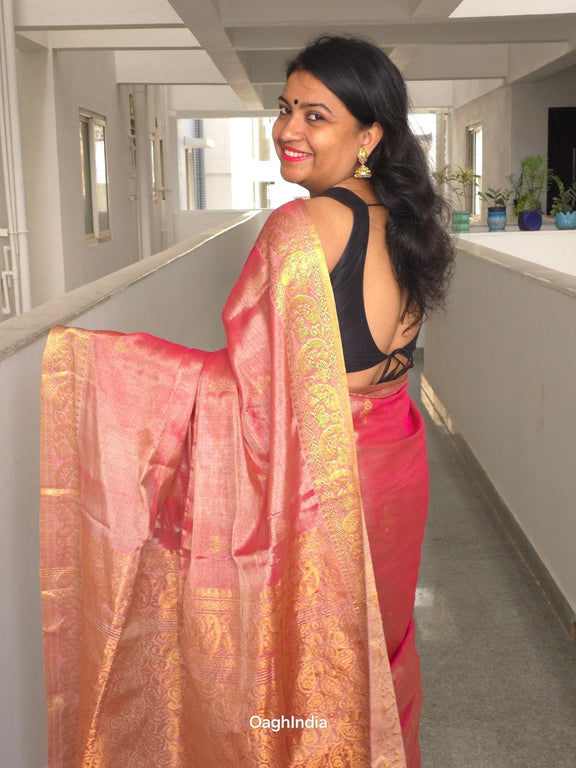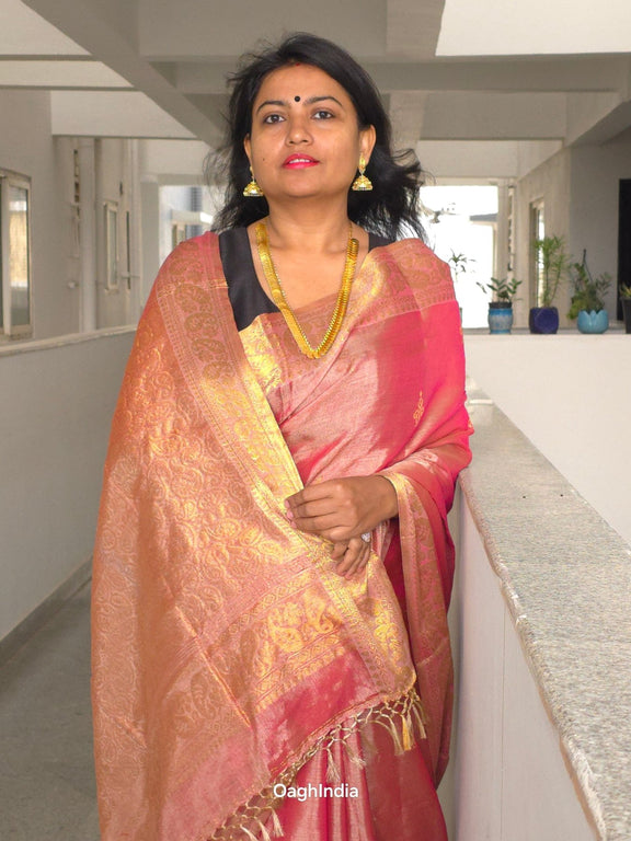 Step into the world of timeless elegance with our Tissue Kanjivaram Saree from Oagh India's Heeramandi-inspired collection. This saree embodies the rich heritage and opulence of traditional Indian craftsmanship. Crafted with meticulous attention to detail, it brings together the shimmer of metallic tissue with the intricate beauty of Kanjivaram weaving.