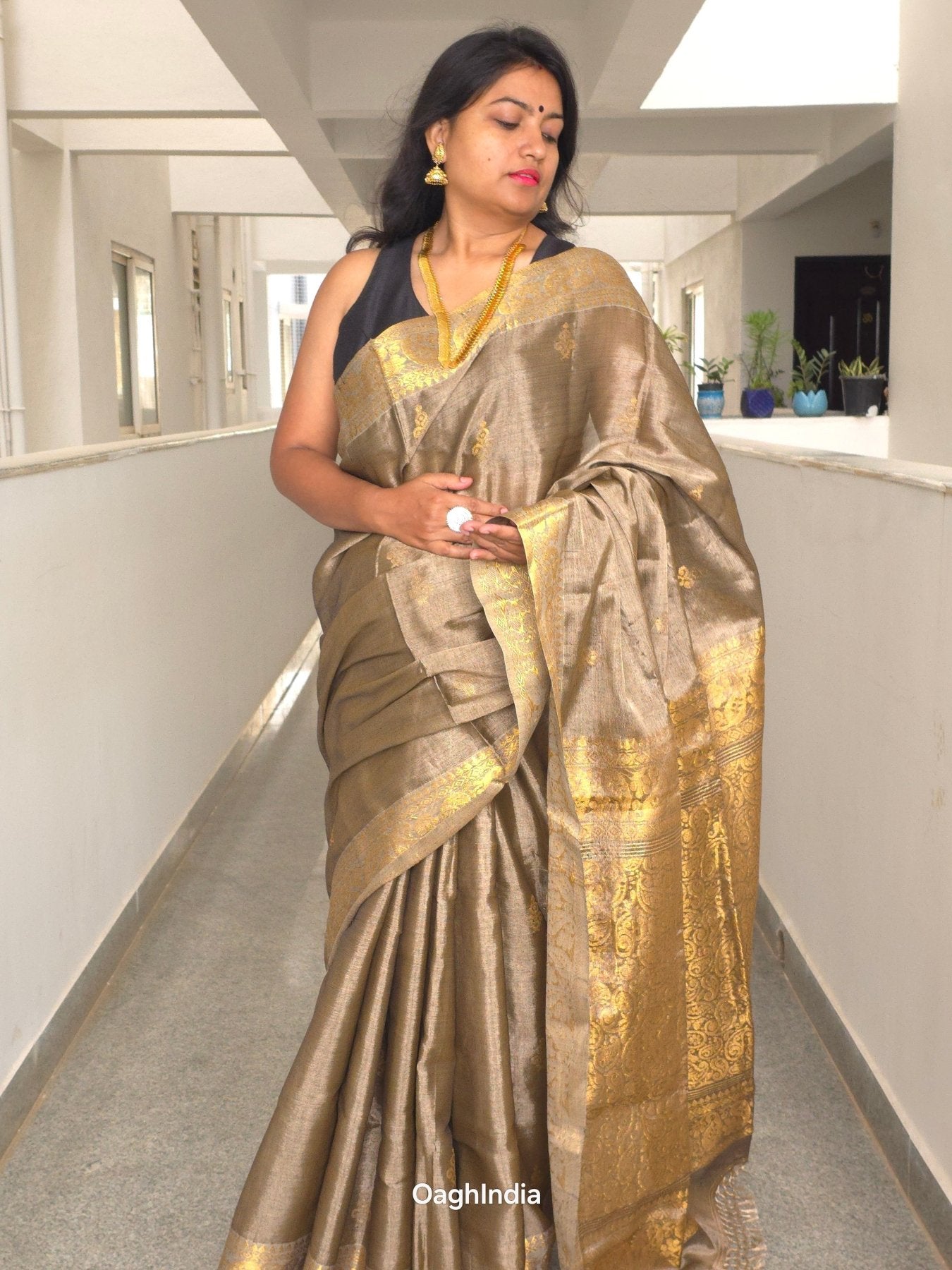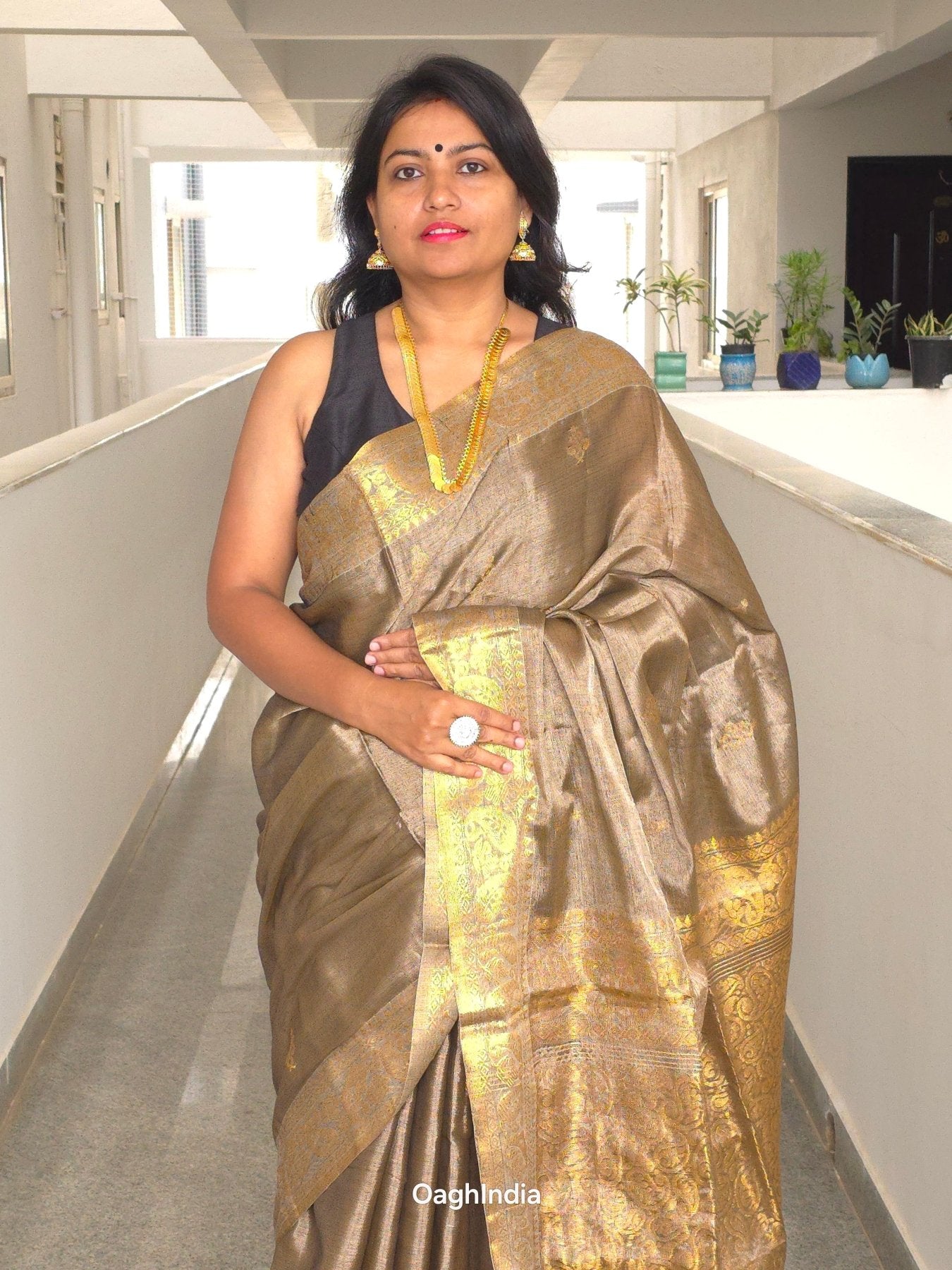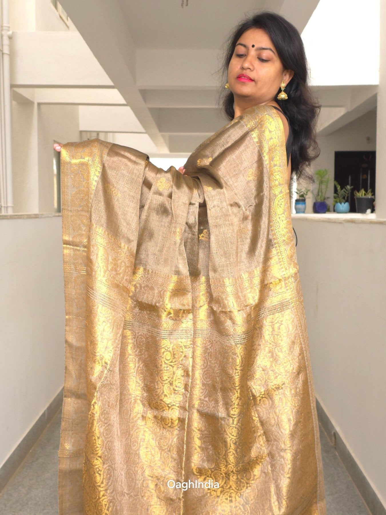 Step into the world of timeless elegance with our Tissue Kanjivaram Saree from Oagh India's Heeramandi-inspired collection. This saree embodies the rich heritage and opulence of traditional Indian craftsmanship. Crafted with meticulous attention to detail, it brings together the shimmer of metallic tissue with the intricate beauty of Kanjivaram weaving.