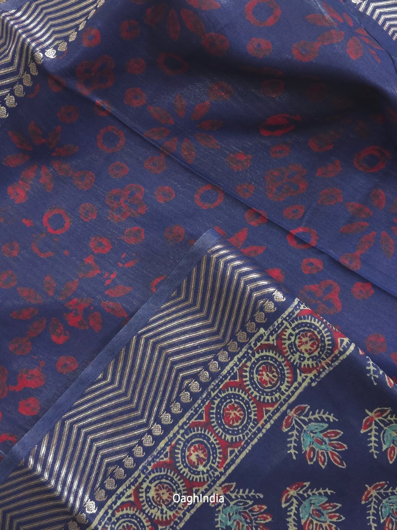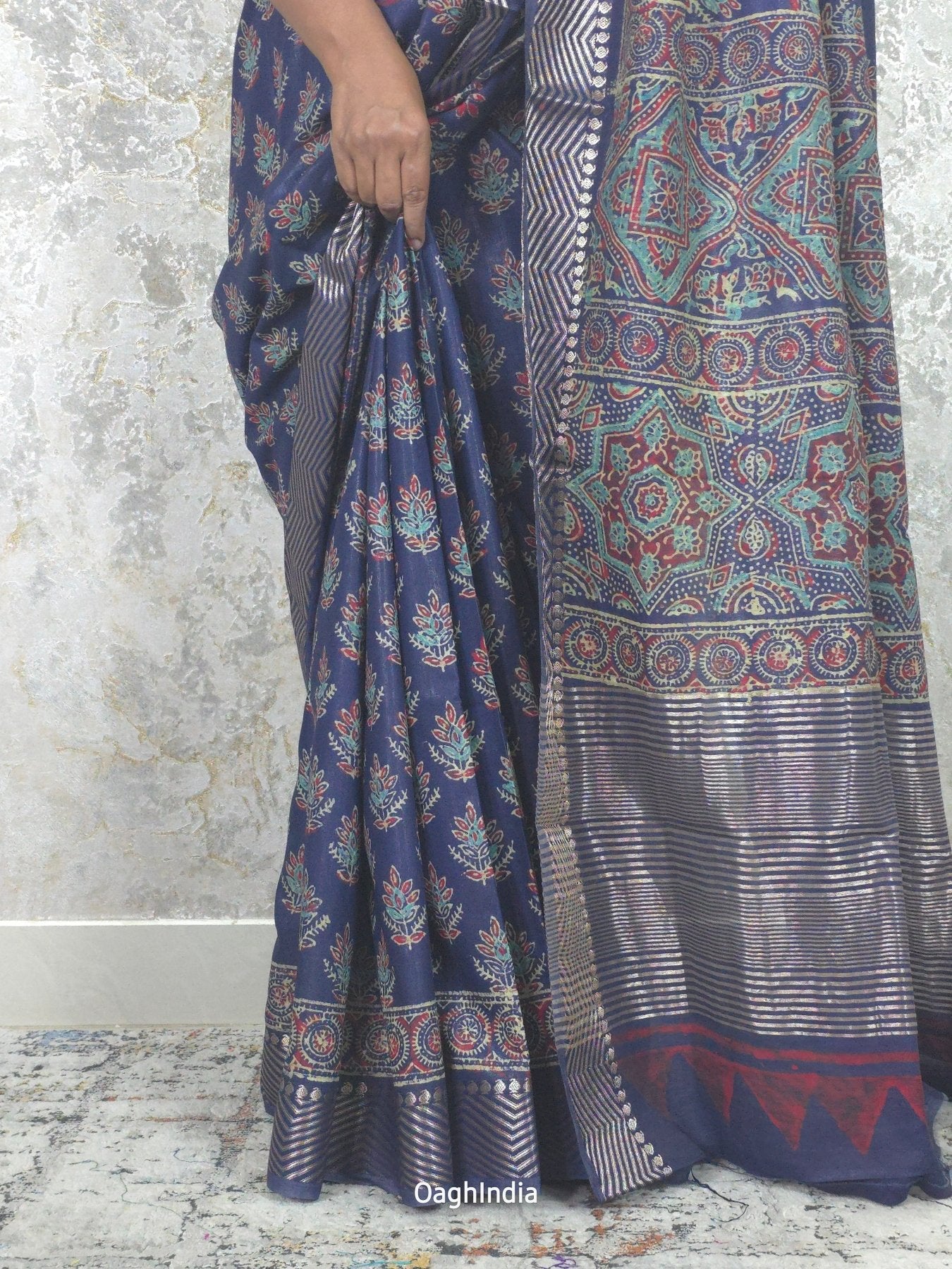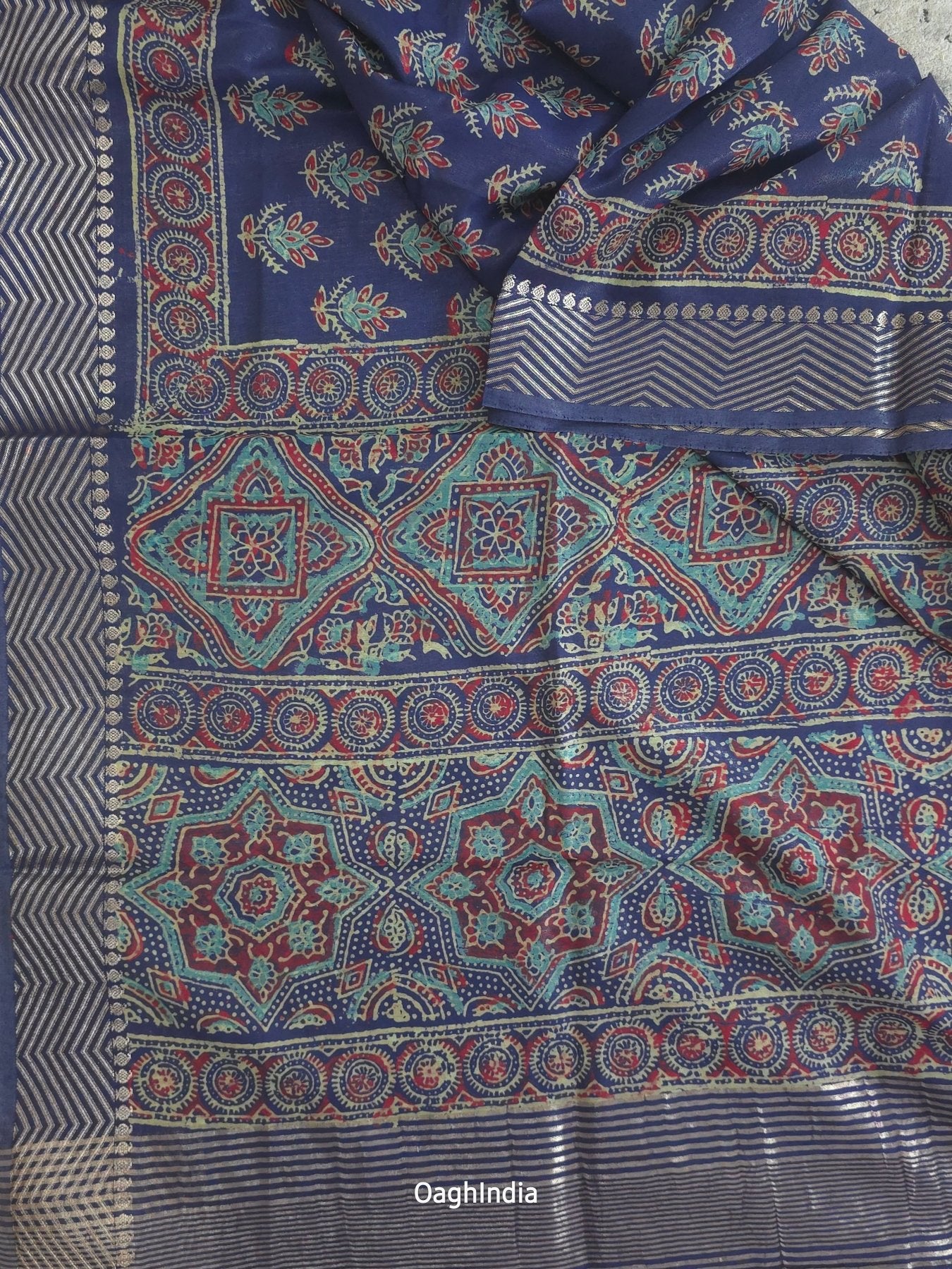 IRA : Ajrakh Handblock print Semi Crepe Saree(Nepthol Blue)