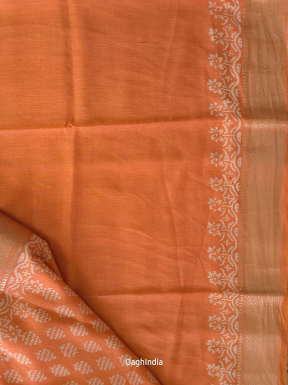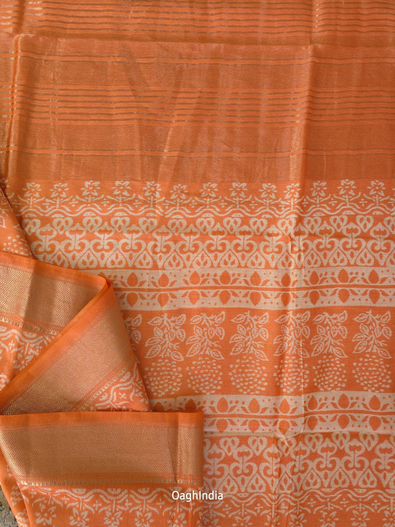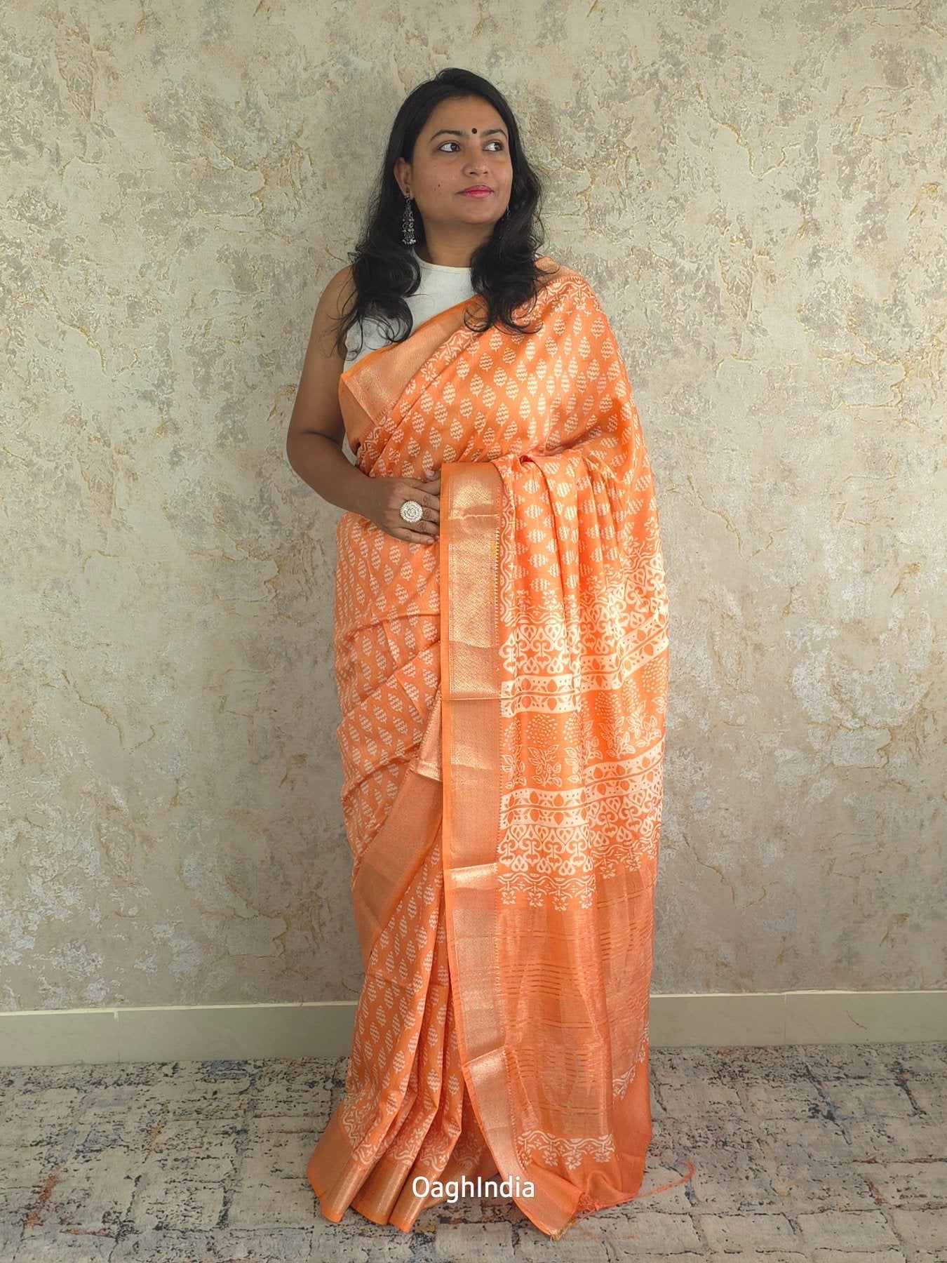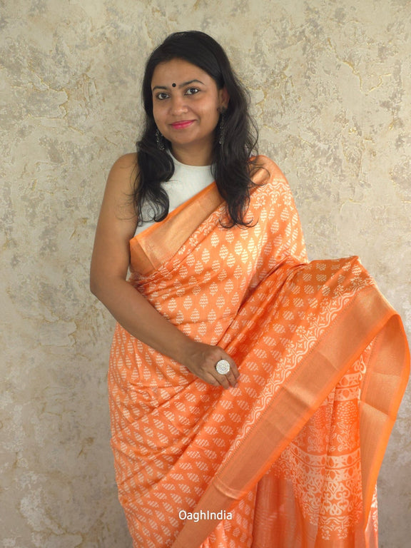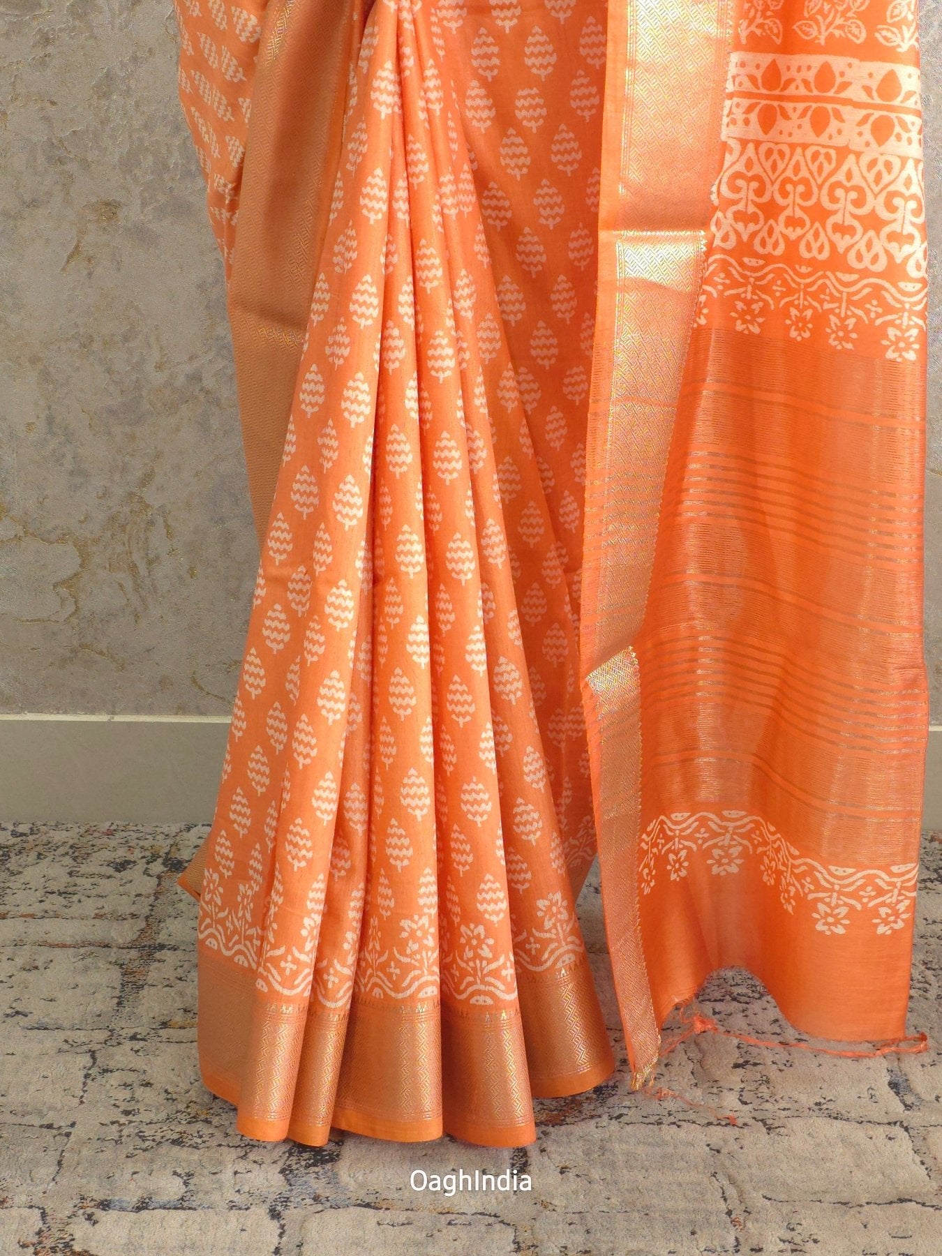 The colors are bright and cheerful, with beautiful handblock prints all over, making it pop! There’s also this shiny zari border and a little sparkle on the pallu that makes it look just festive enough. It’s perfect for when you want to look a little fancy, but still feel comfortable and relaxed.