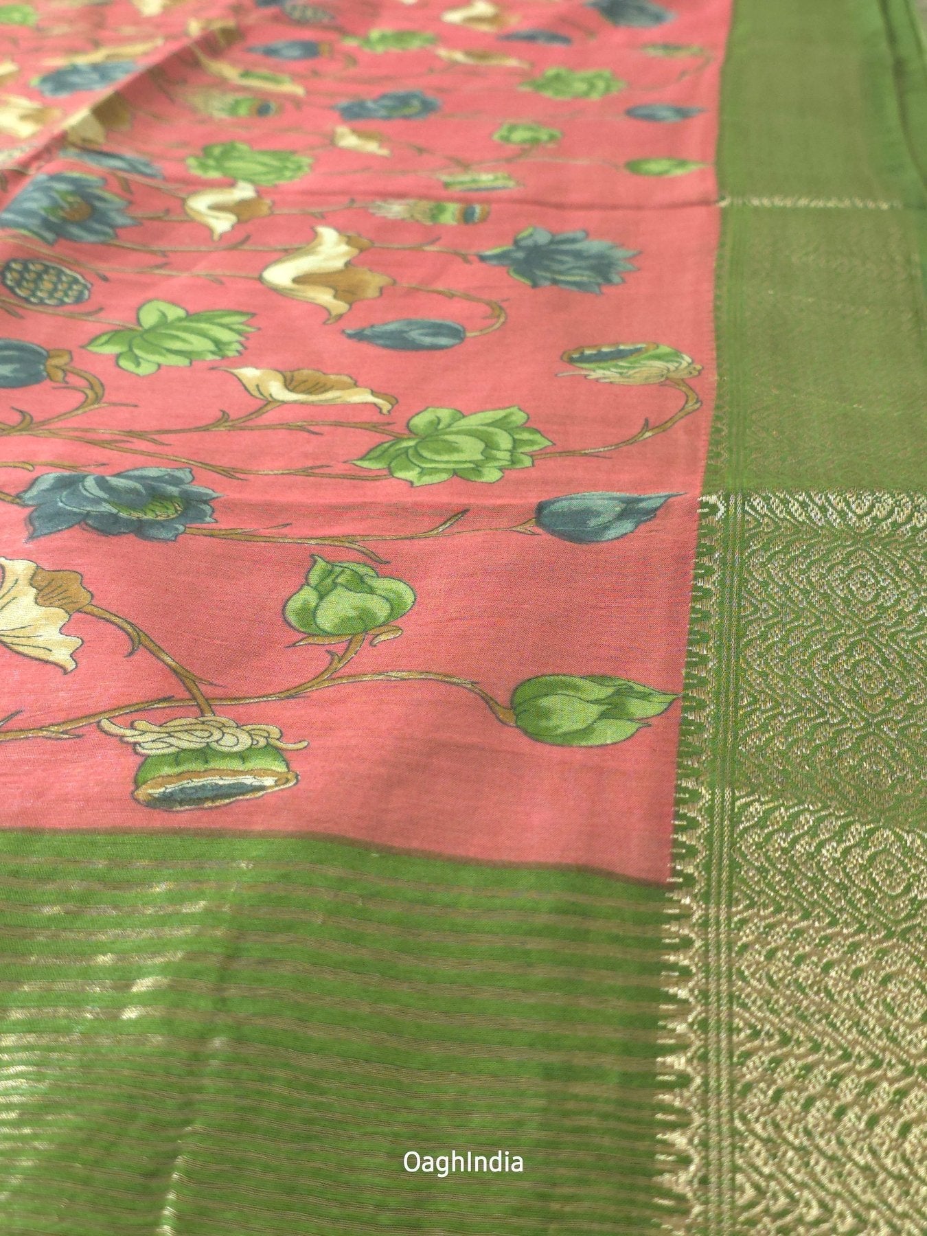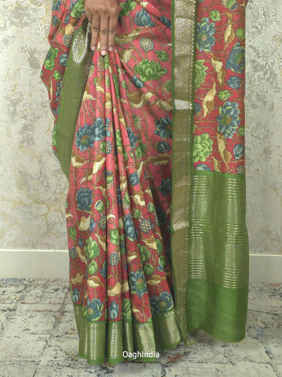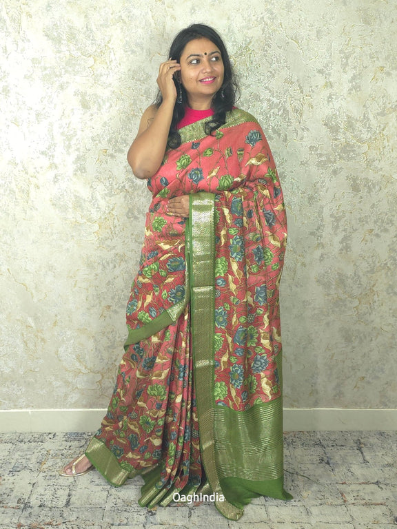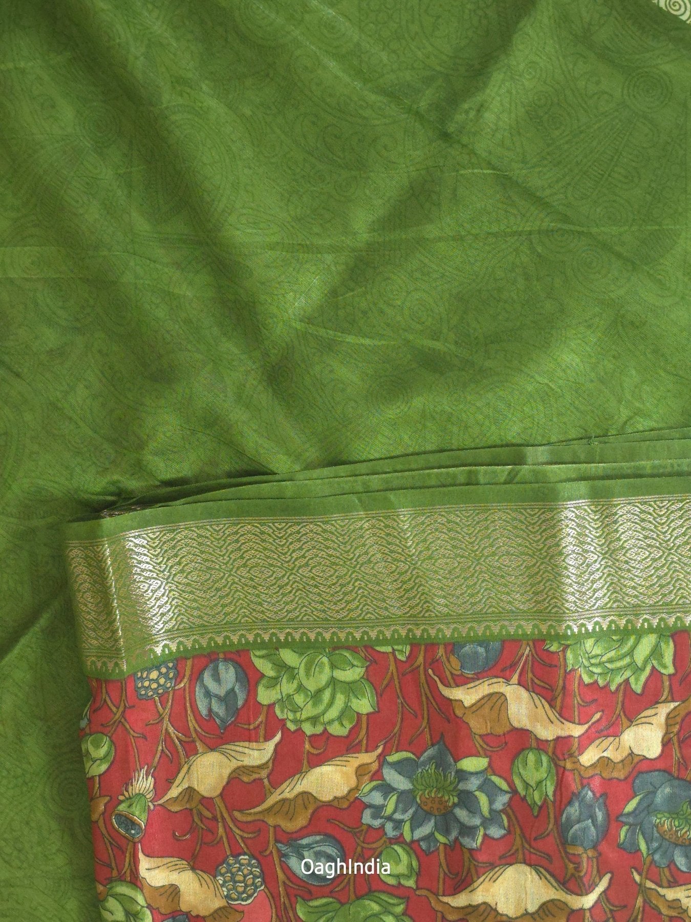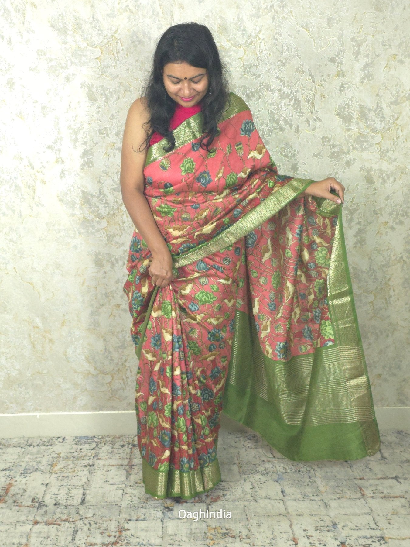 The colors are bright and cheerful, with beautiful Kalamkari Screen printsd designs all over, making it pop! There’s also this shiny zari border and a little sparkle on the pallu that makes it look just festive enough. It’s perfect for when you want to look a little fancy, but still feel comfortable and relaxed.