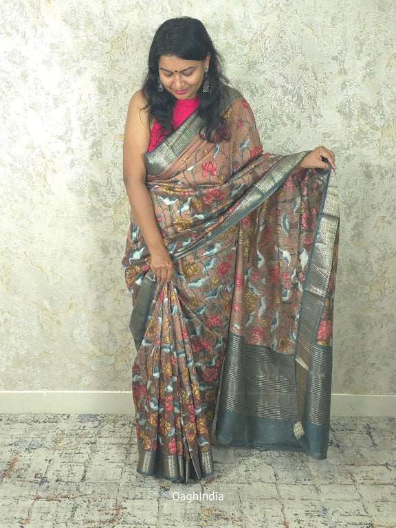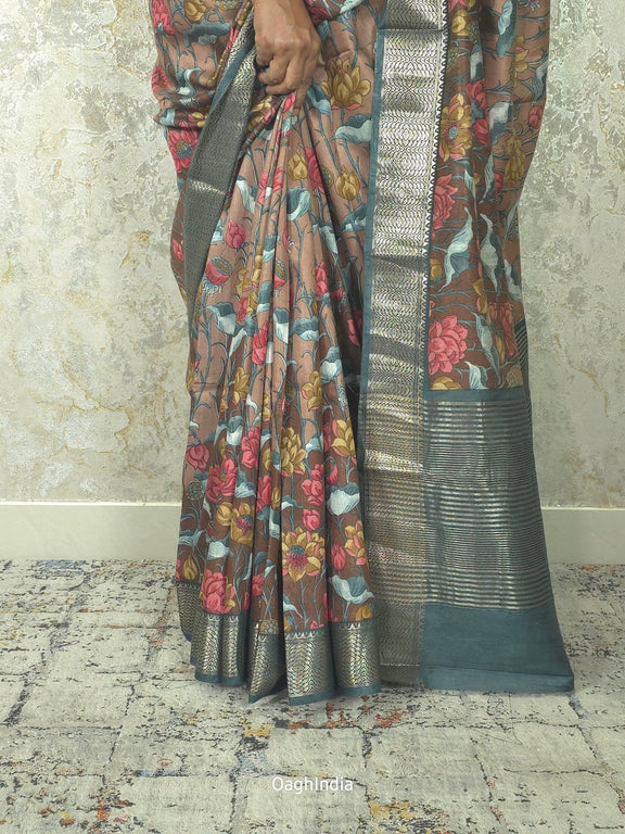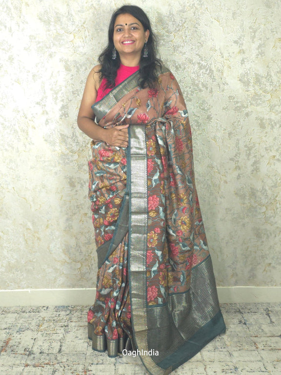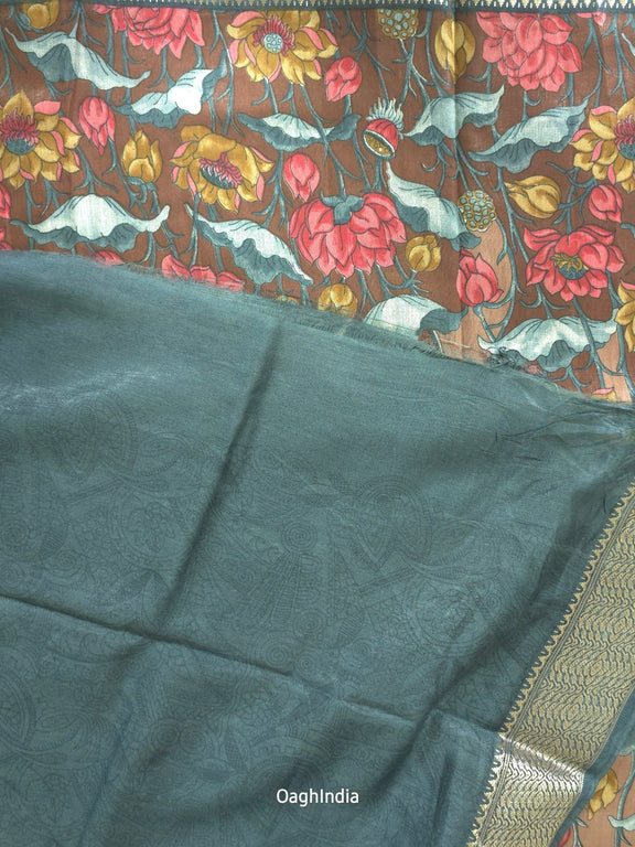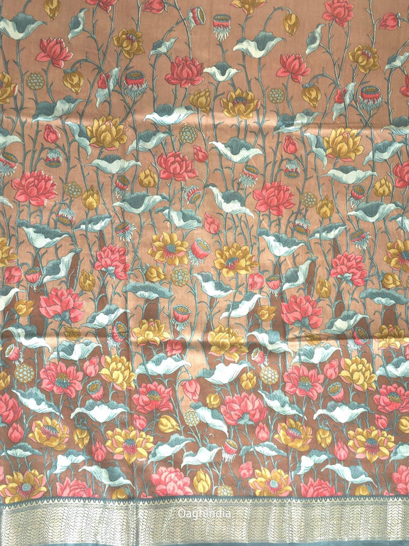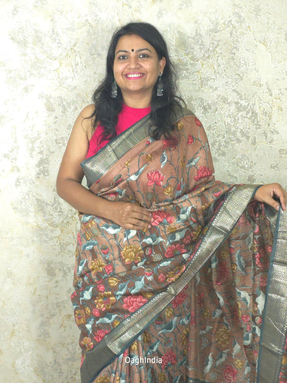 The colors are bright and cheerful, with beautiful Kalamkari Screen printsd designs all over, making it pop! There’s also this shiny zari border and a little sparkle on the pallu that makes it look just festive enough. It’s perfect for when you want to look a little fancy, but still feel comfortable and relaxed.