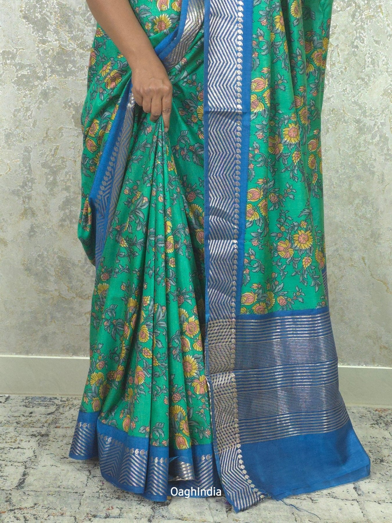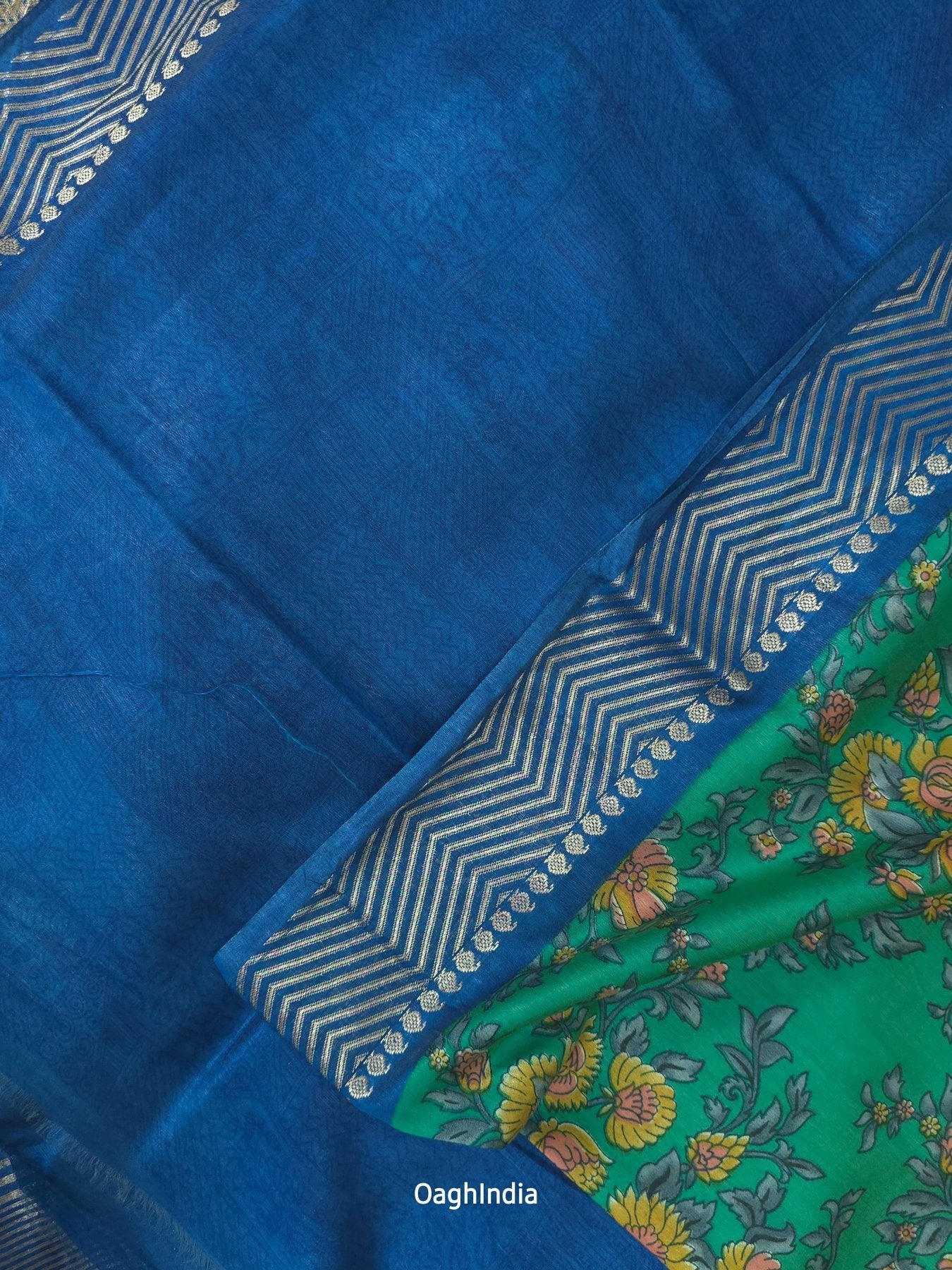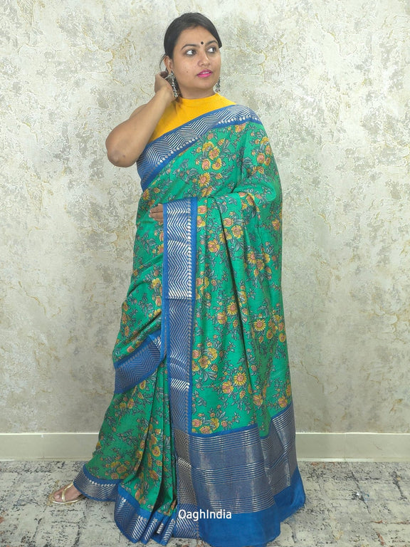 The colors are bright and cheerful, with beautiful Kalamkari Screen printsd designs all over, making it pop! There’s also this shiny zari border and a little sparkle on the pallu that makes it look just festive enough. It’s perfect for when you want to look a little fancy, but still feel comfortable and relaxed.
