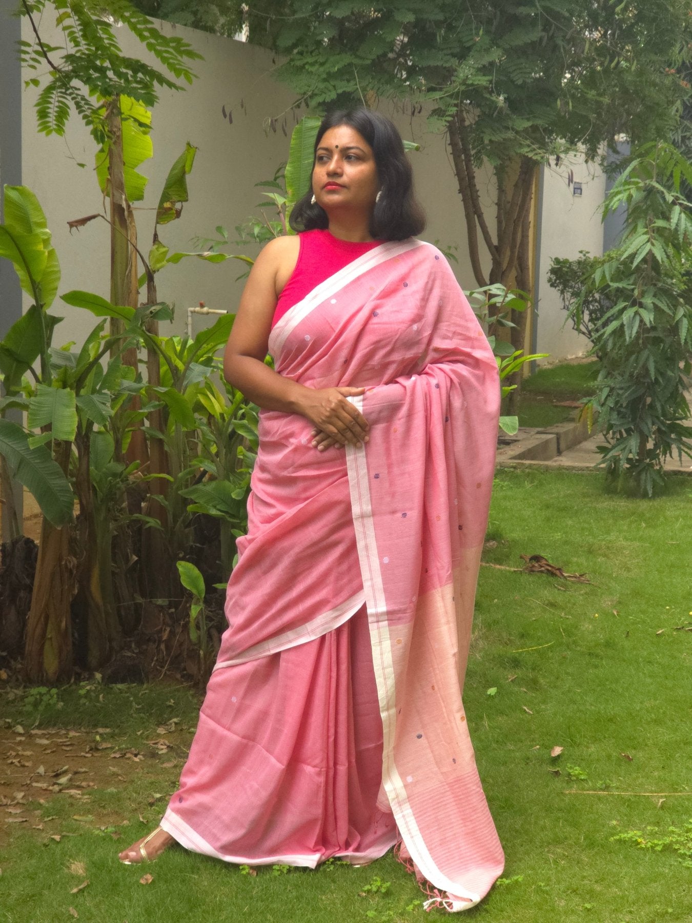 Yazhini is a pure cotton handwoven saree in a soothing pink body, softened with a pastel pink pallu and subtle striped edging. The fabric is feather-light, breathable, and flows with ease, making it a perfect companion for long days. Tiny woven butas scattered across the saree lend a touch of playful elegance to its minimal charm. A timeless cotton saree for everyday wear that transitions effortlessly into festive and cultural occasions.