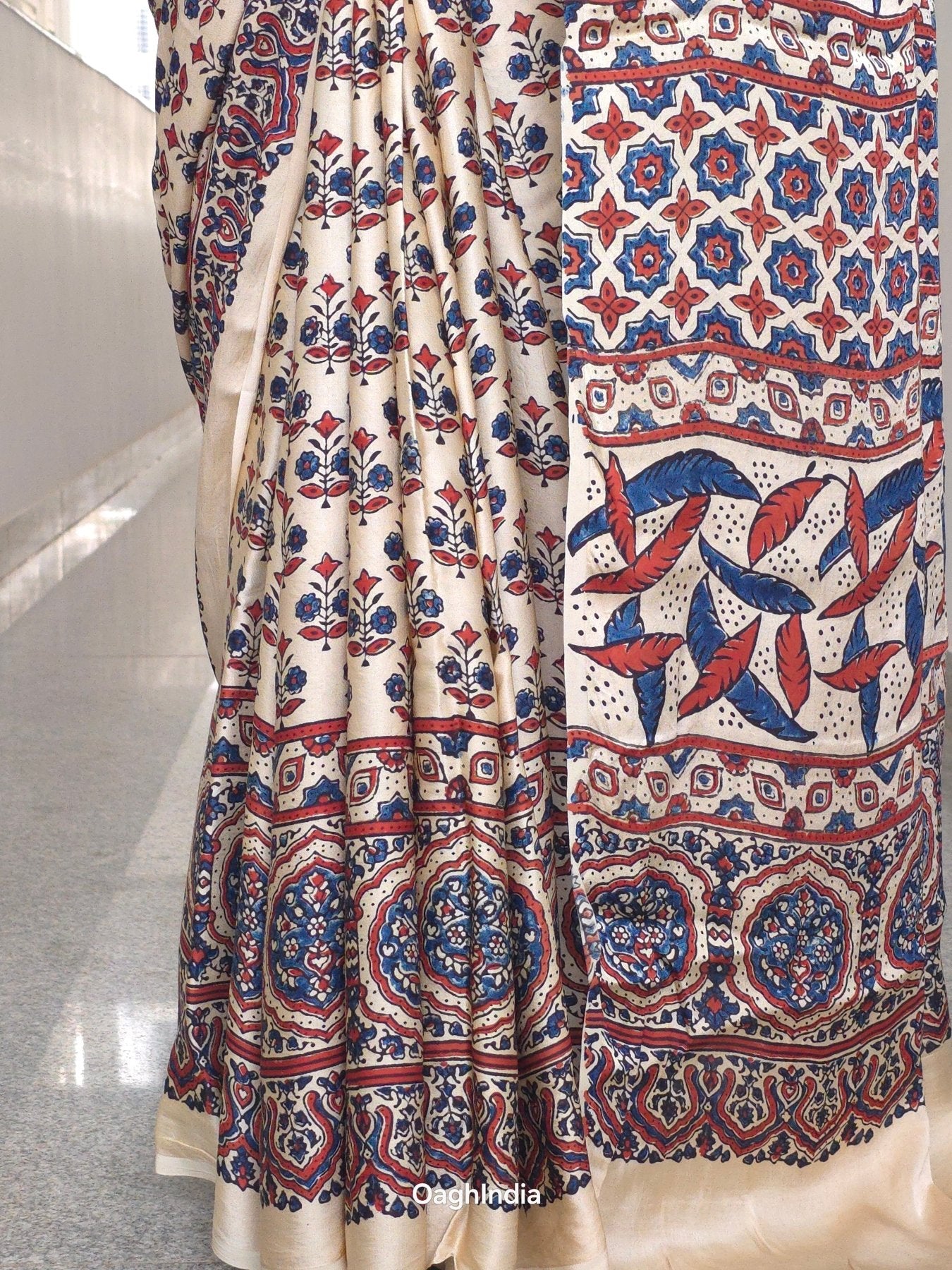 Discover the timeless allure of Ajrakh Modal Sarees, a testament to the rich heritage of Ajrakh handblock printing. Originating from the ancient craft traditions of Gujarat and Rajasthan, Ajrakh artistry is celebrated for its intricate geometric patterns and natural dyes, crafted using traditional techniques passed down through generations.