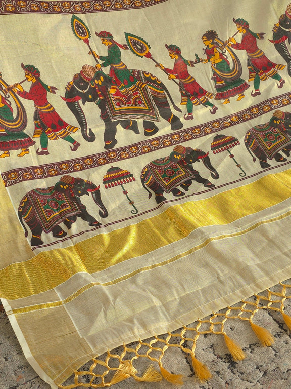 Introducing our beautiful Kerala saree, This saree has a detailed pallu that shows a grand scene of soldiers on elephants, ready for a royal journey. The border features these regal elephants and soldiers too, celebrating Kerala’s royal history. Tiny elephant designs are sprinkled across the fabric, adding extra charm. Made from a soft blend of tissue and cotton, it’s comfy and has a lovely shine.