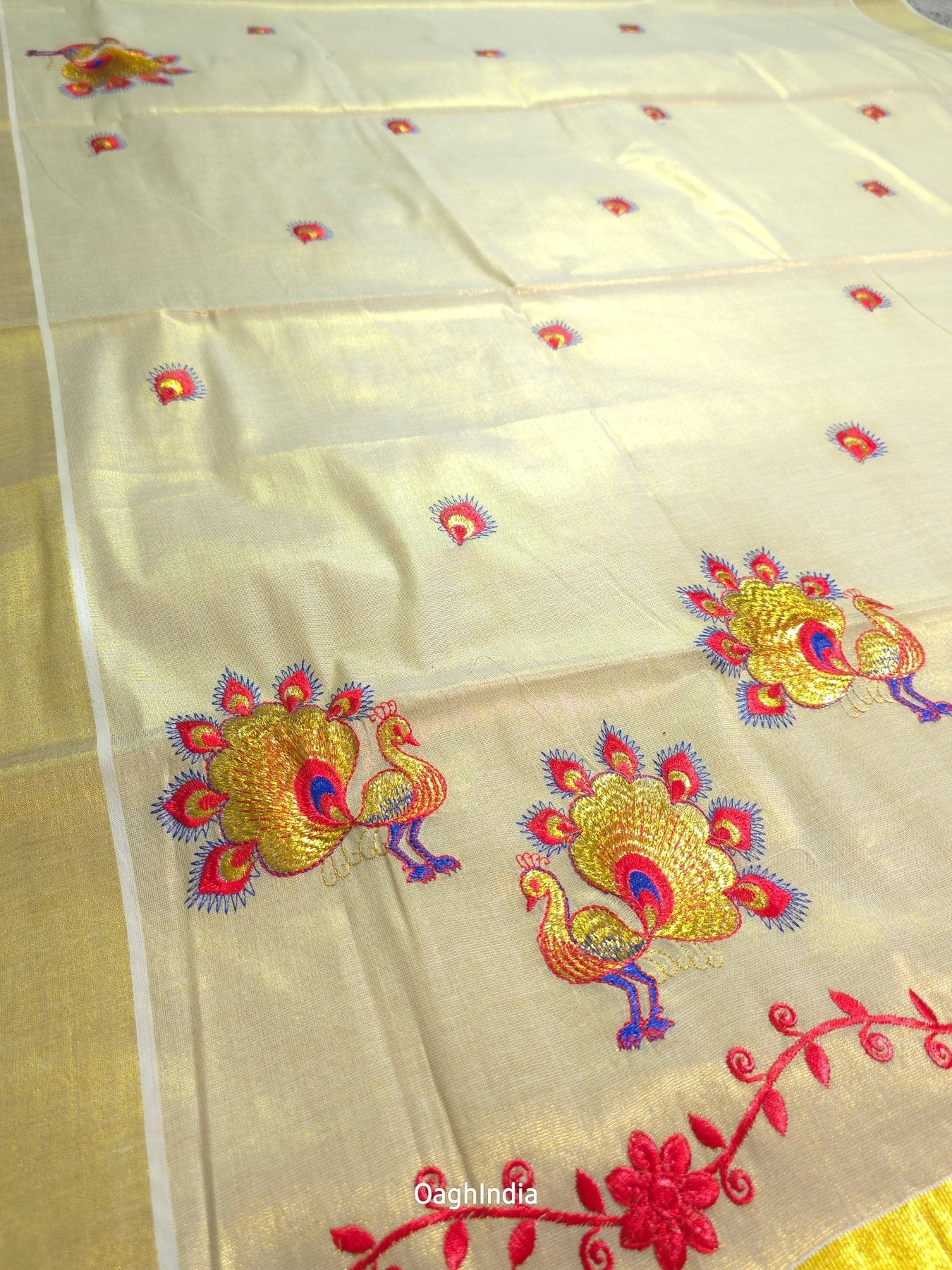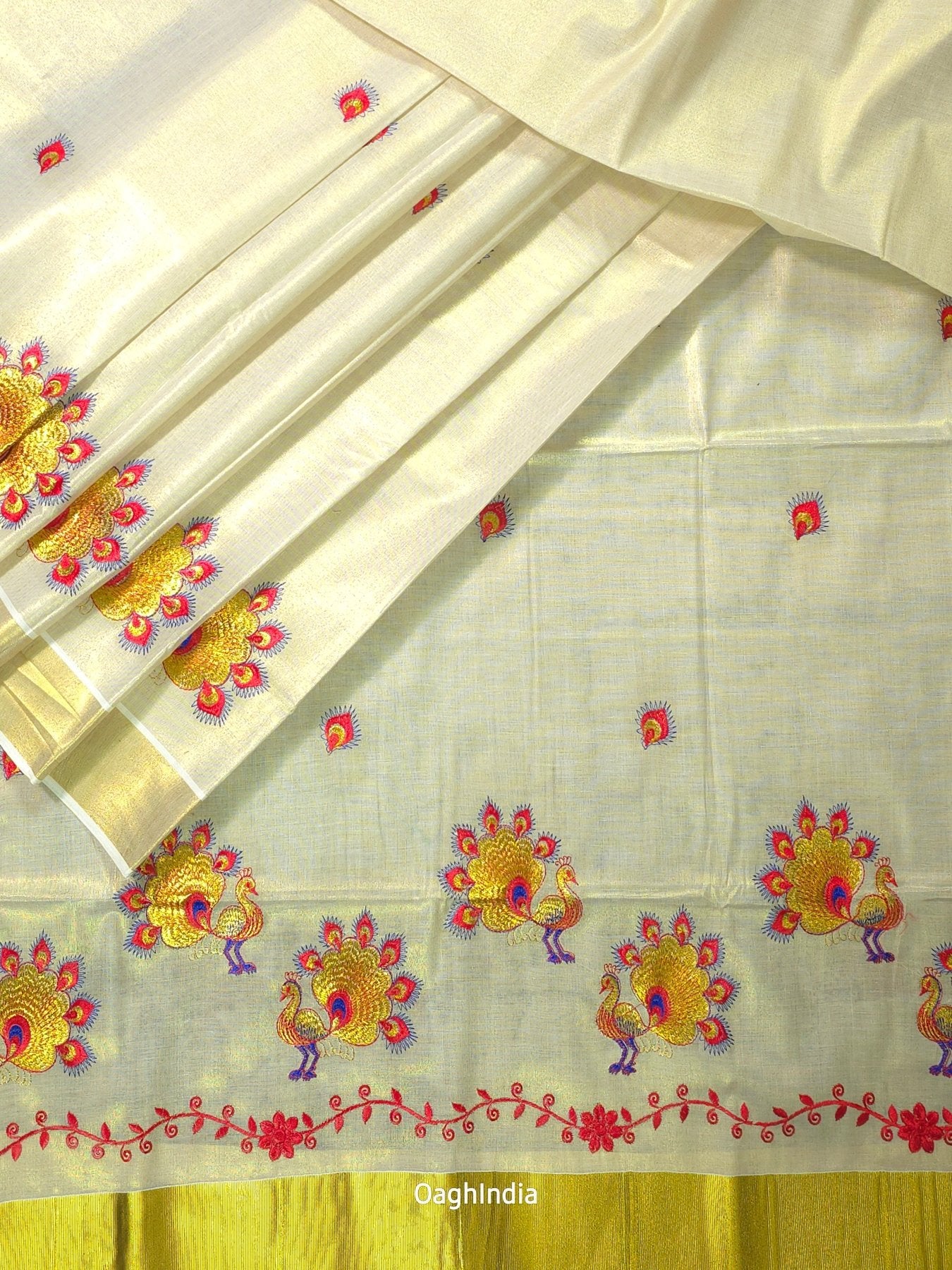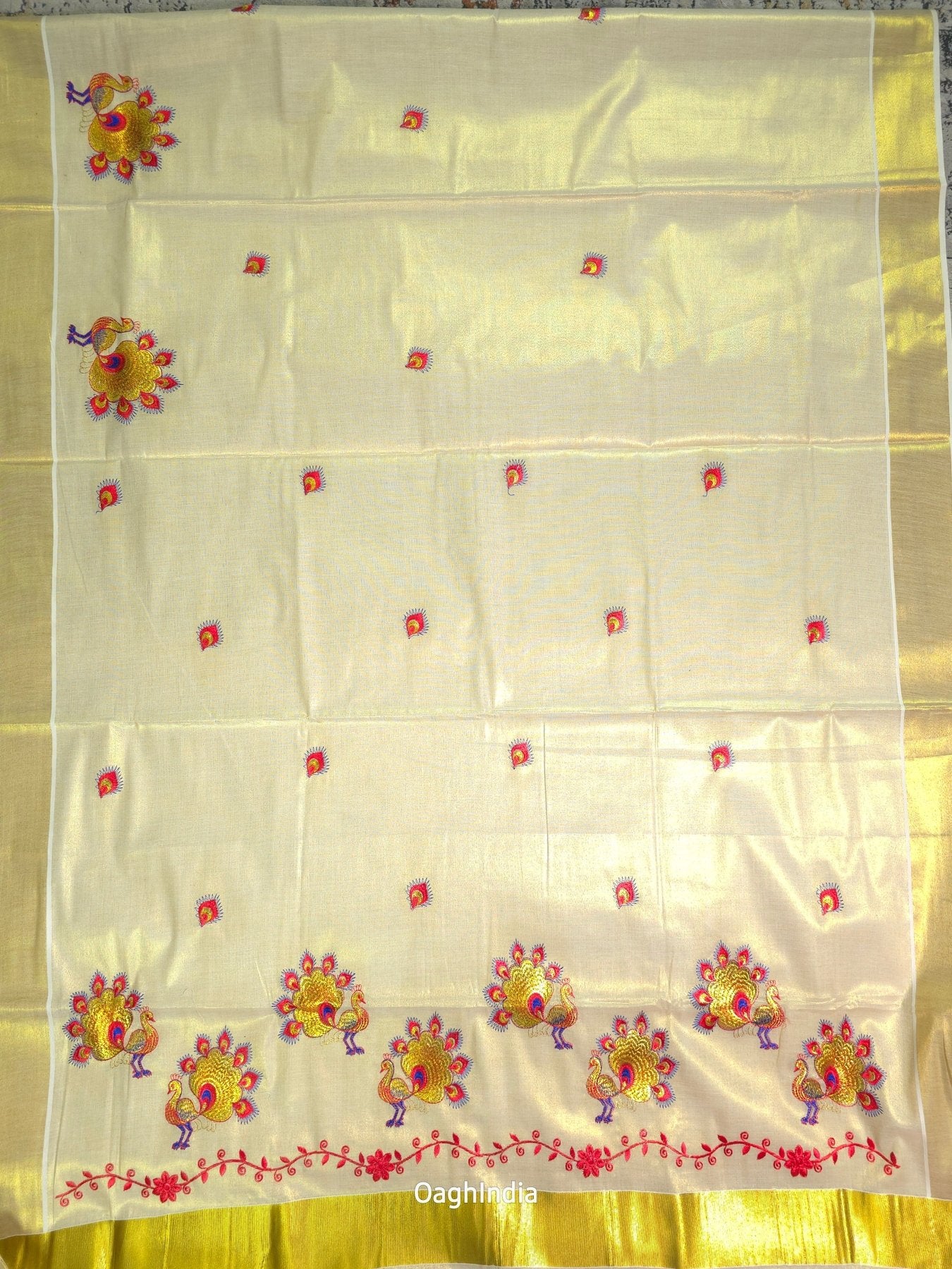 It has a shiny golden border that makes it look timeless, with grand peacock embroidery in golden threads that show off the beauty of these amazing birds. The pallu is a real masterpiece, with colorful peacocks that are detailed and full of life. Made from a soft mix of tissue and cotton, it’s comfy and has a gentle shine.