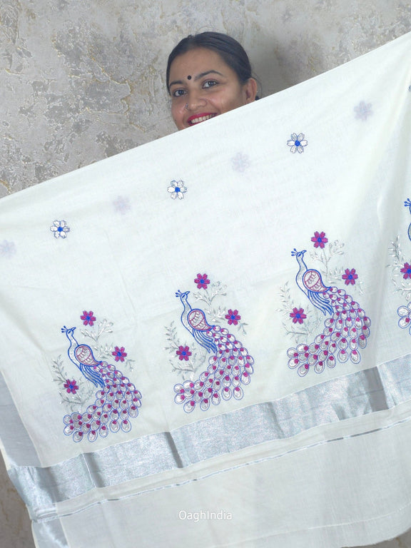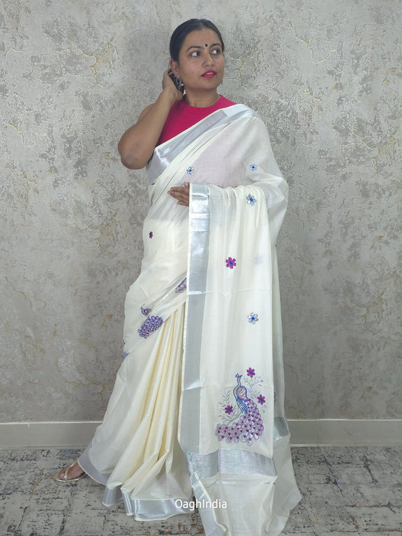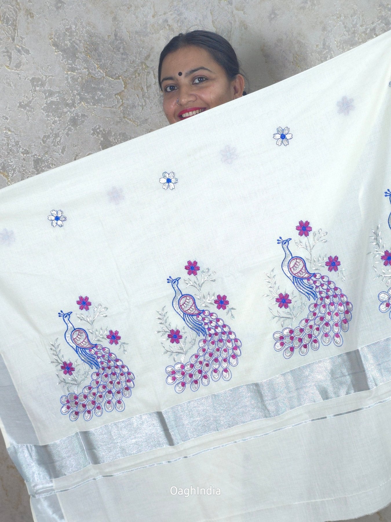 It has a shiny silver border that makes it look timeless, with grand peacock designs that show off the beauty of these amazing birds. The pallu is a real masterpiece, with colorful peacocks that are detailed and full of life. Made from a soft mix of tissue and cotton, it’s comfy and has a gentle shine.