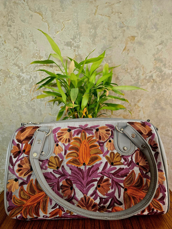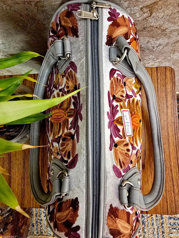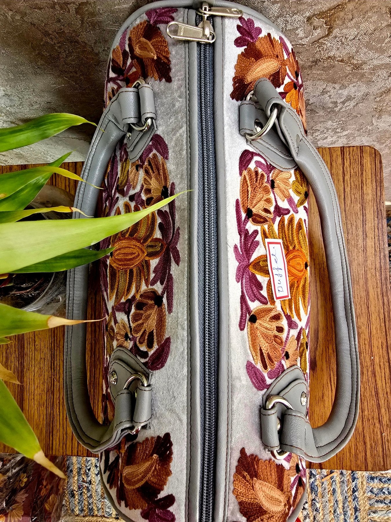 Elevate your everyday style with the Kashmiri Duffel Bag – Silver, a stunning blend of traditional Kashmiri artistry and modern elegance. Made from premium velvet fabric, this silver-toned duffel bag features rich floral motifs in hues of mustard, brown, and plum — making it the perfect statement accessory for women who appreciate cultural craftsmanship with a contemporary twist.