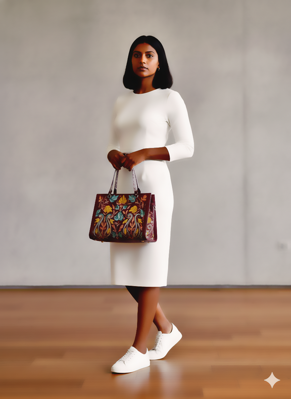 Designed with a sharp, structured silhouette and comfortable dual top handles, it bridges the gap between ethnic charm and modern professional attire. Whether paired with a crisp dress or a classic saree, its bold palette and detailed threadwork make it a true conversation piece.