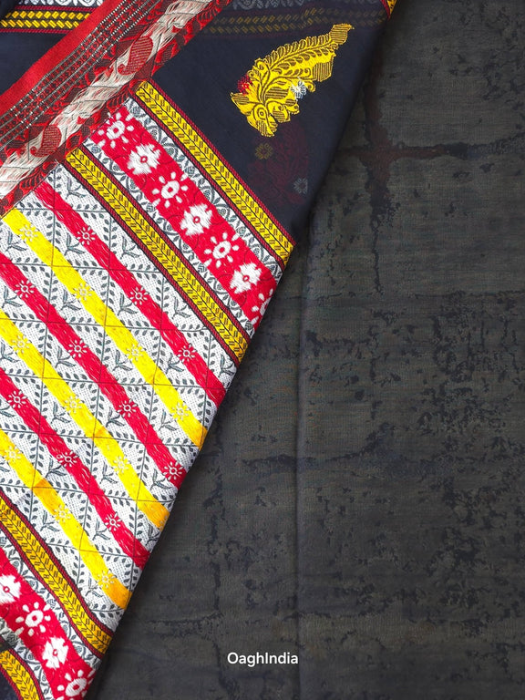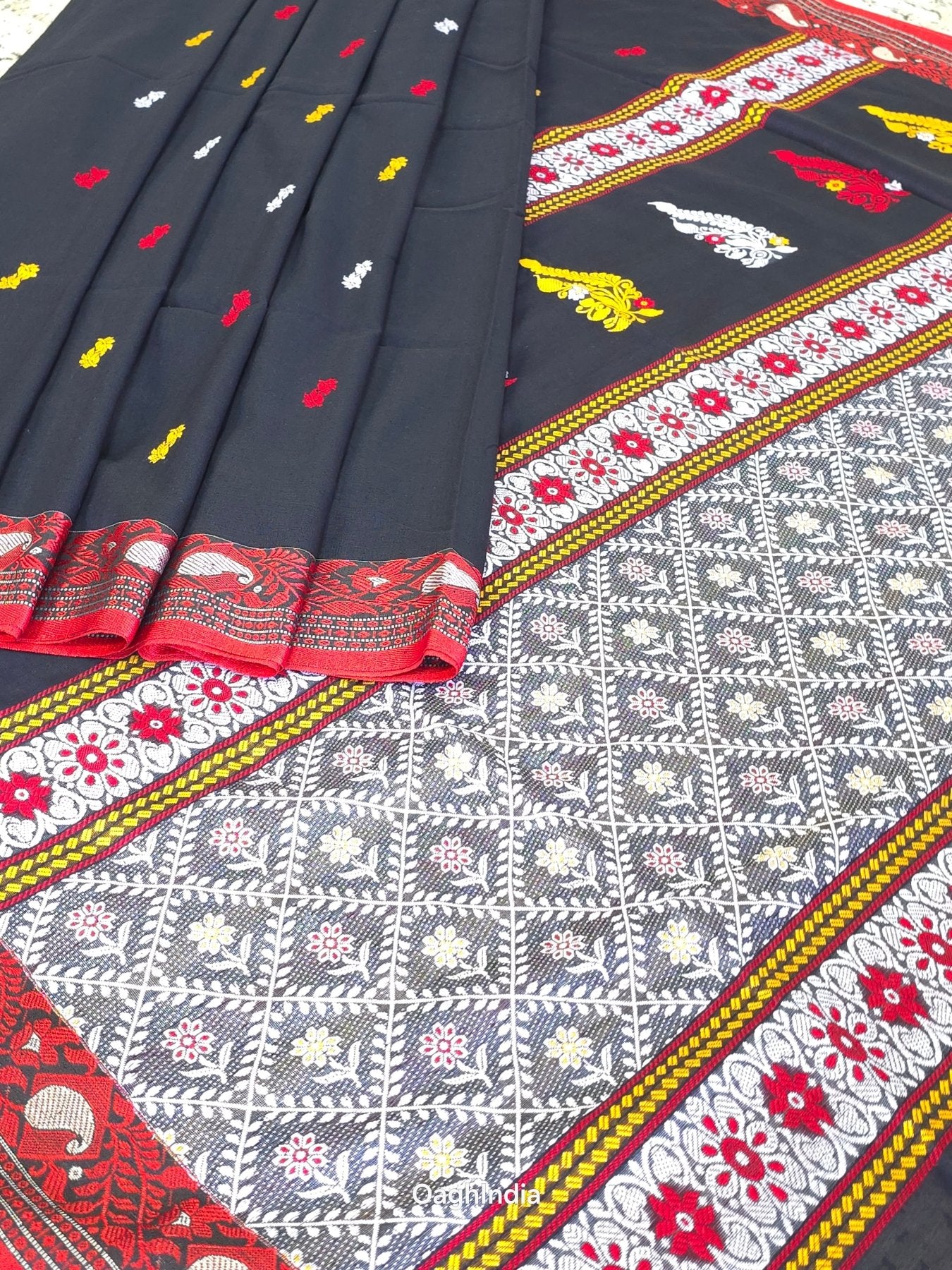 A stunning handwoven mercerized cotton saree in Midnight Black, adorned with elegant red and yellow buta and intricate red thread work on the pallu and border. This buttery soft saree, crafted with 100 hours of skilled artistry, is perfect for radiating grace and sophistication.
