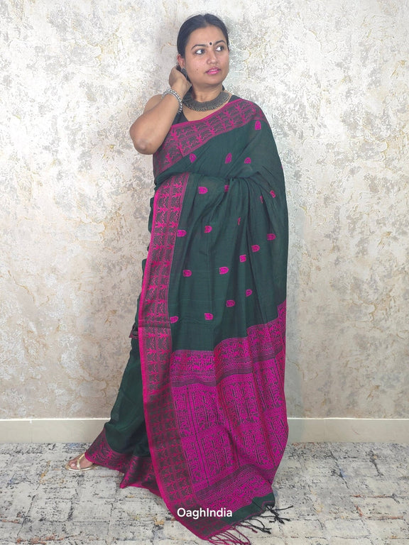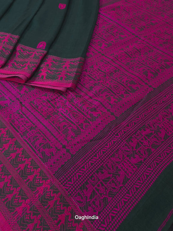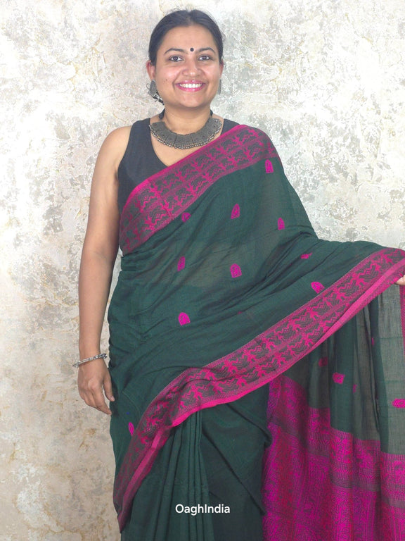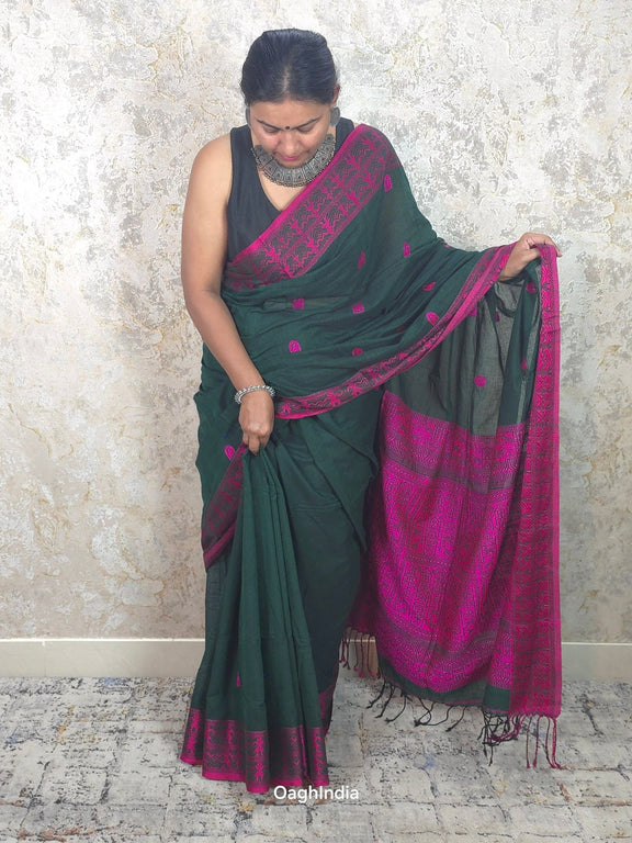 Imagine owning a saree that's like a piece of art 🎨, made by hand over 2-3 days with so much care ❤️. That's what our cotton Baluchuri sarees are! Made from the finest mercerised cotton, they’re super soft and easy to wear 🌸. These sarees come from Phulia, a place famous for its beautiful cotton sarees 🌍.