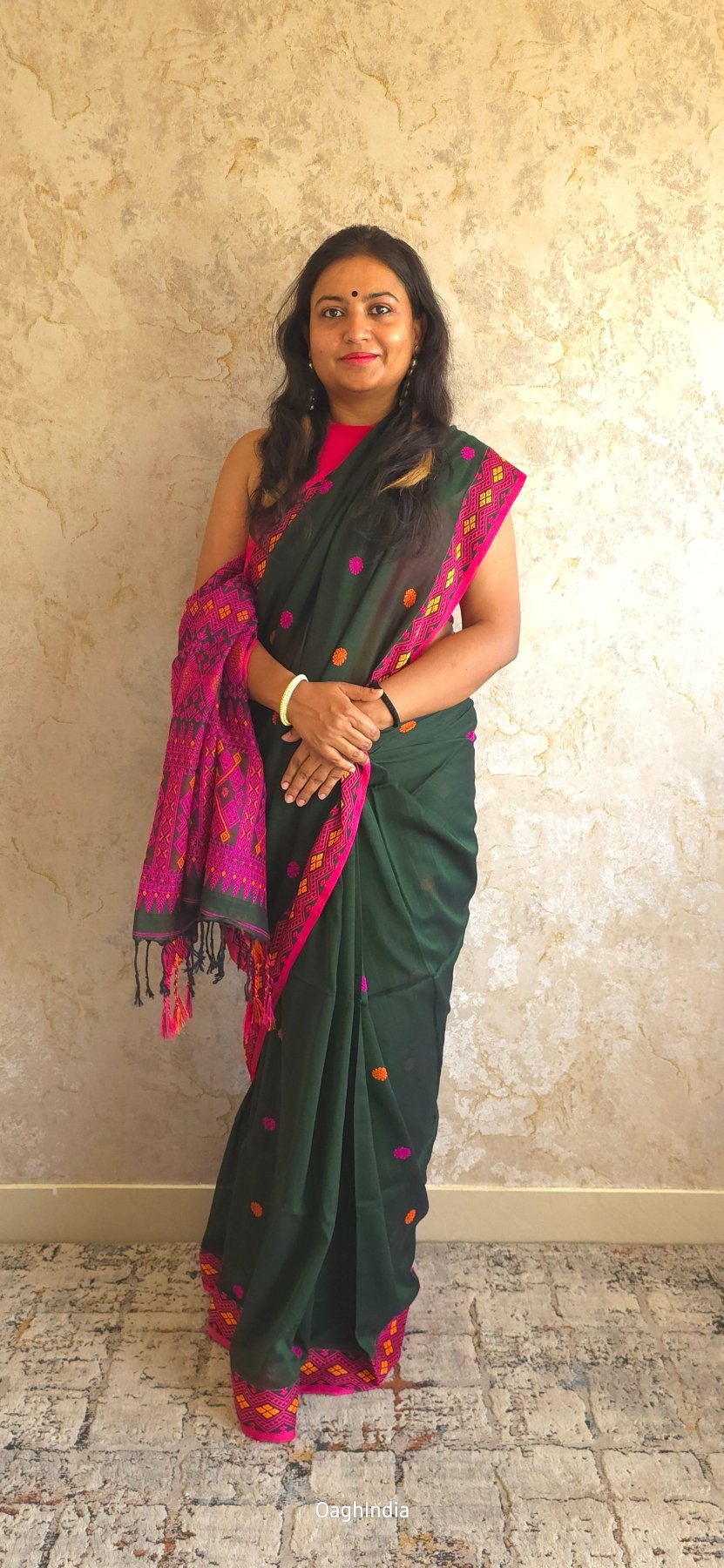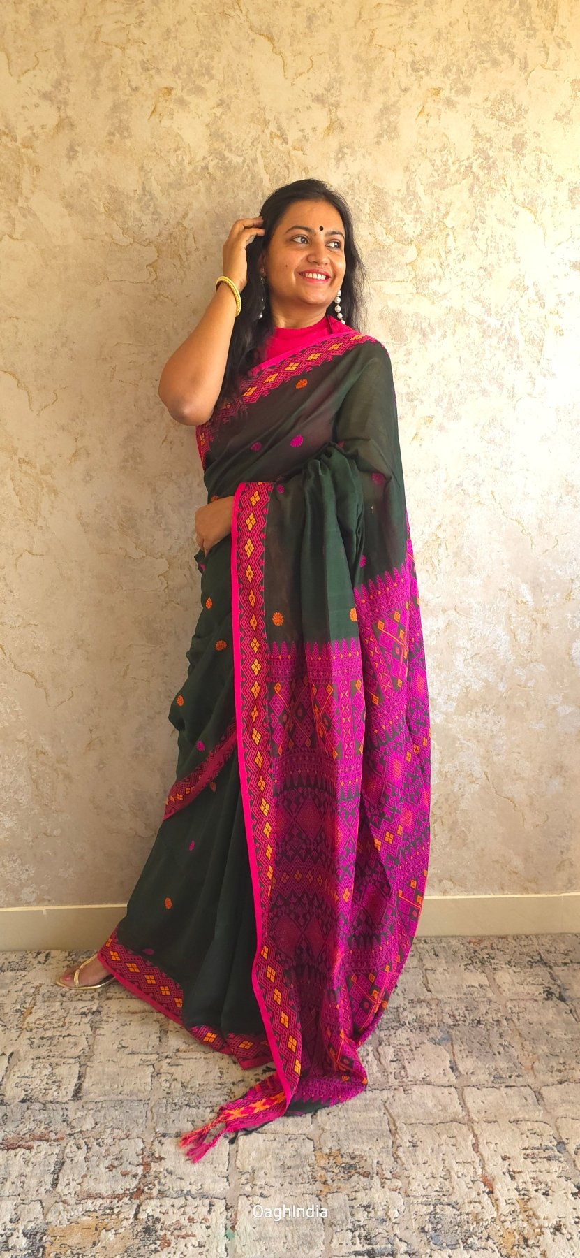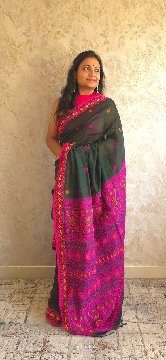 Mercerised cotton offers a luxurious feel and graceful drape, ensuring comfort and sophistication. Each saree is entirely handmade, reflecting exceptional craftsmanship and meticulous attention to detail. Perfect for festive occasions and cultural celebrations, this saree seamlessly blends tradition and contemporary style, making it a cherished addition to your wardrobe. Embrace the rich heritage and artisanal excellence of Assamese handloom with this exquisite piece.