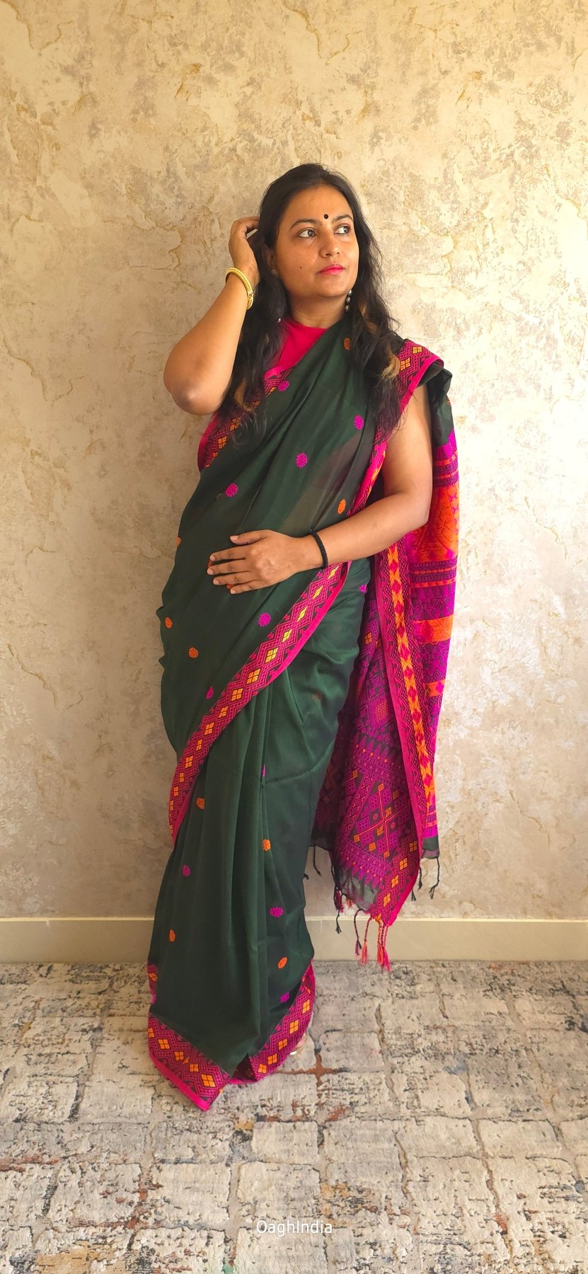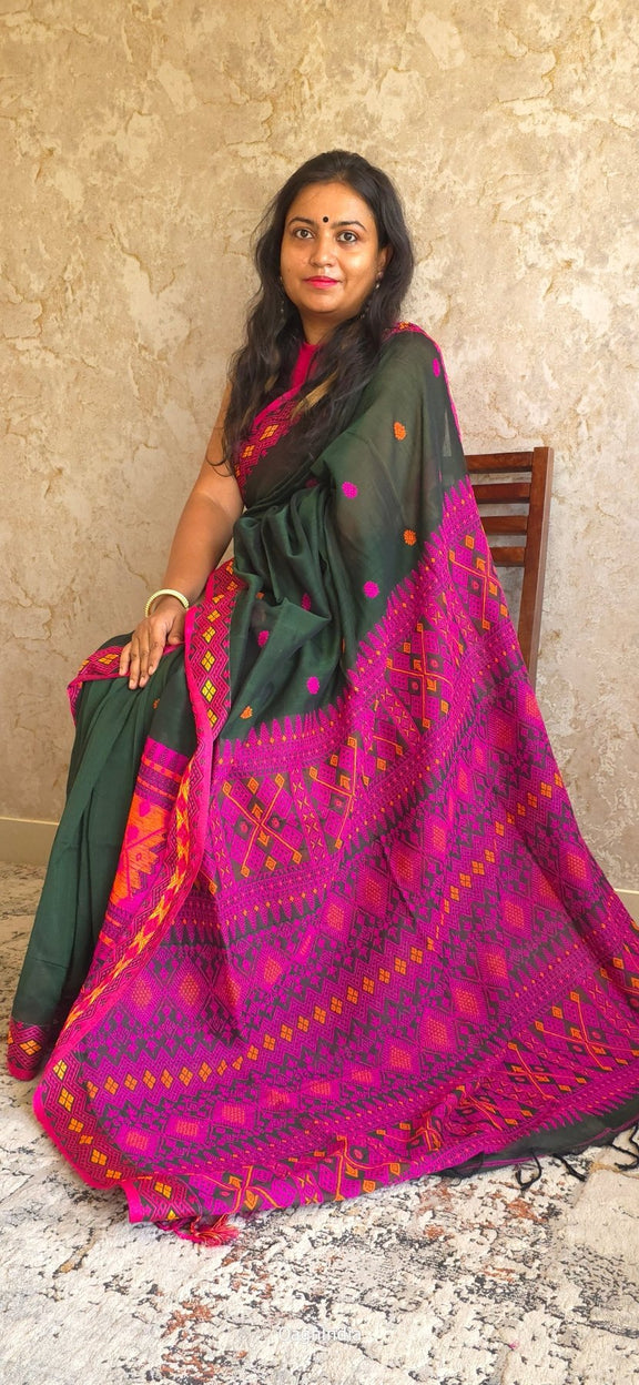 Experience the timeless elegance of our Pure Assamese Handloom Saree, inspired by the traditional Mekhla Chador and crafted from premium mercerised cotton. This saree features a pristine white base, adorned with elegant green and blue accents, creating a striking yet harmonious design. The grand, handmade Mekhla-inspired design on the pallu showcases the vibrant colors and intricate patterns synonymous with Assamese heritage.
