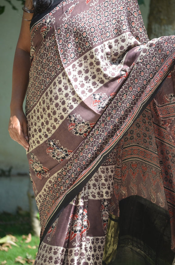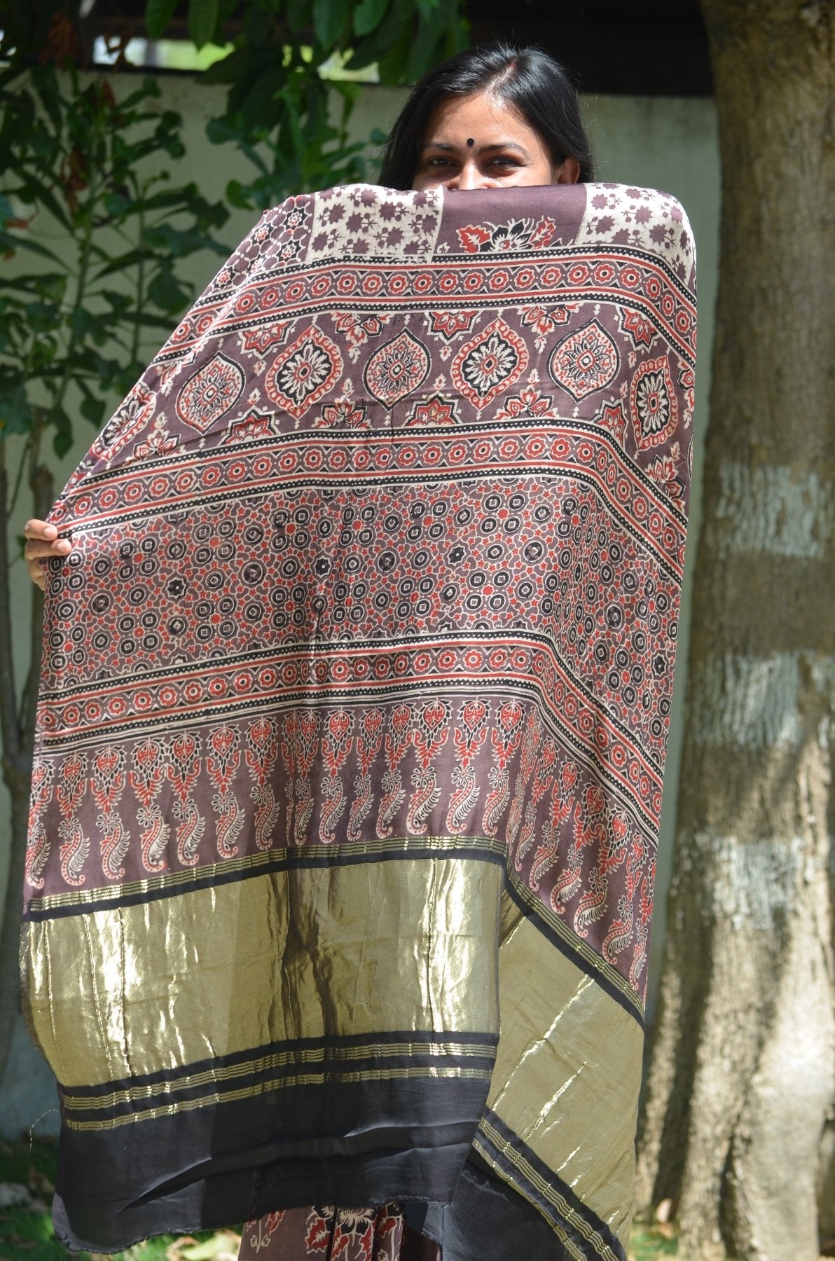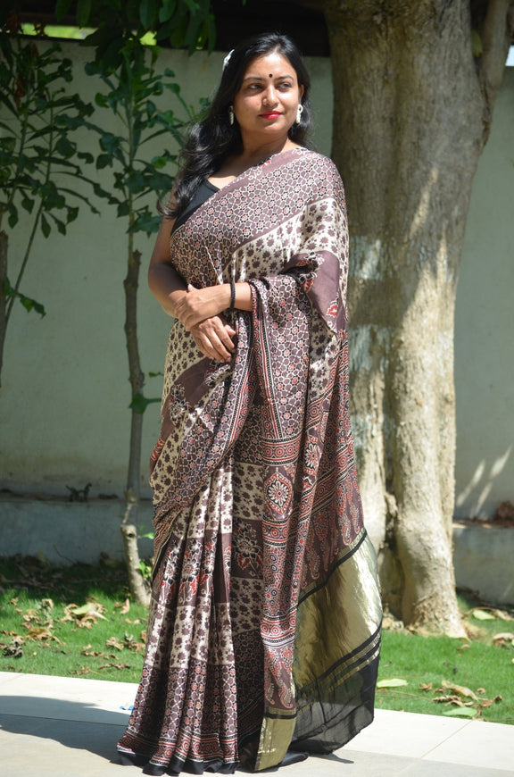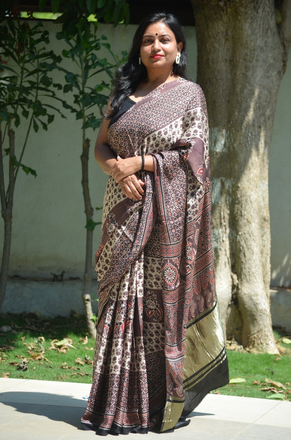 Discover the timeless allure of Ajrakh Modal Sarees, a testament to the rich heritage of Ajrakh handblock printing. Originating from the ancient craft traditions of Gujarat and Rajasthan, Ajrakh artistry is celebrated for its intricate geometric patterns and natural dyes, crafted using traditional techniques passed down through generations.