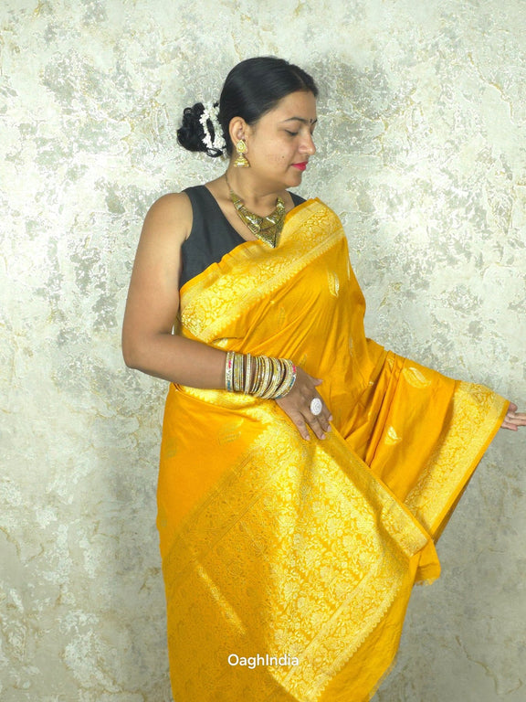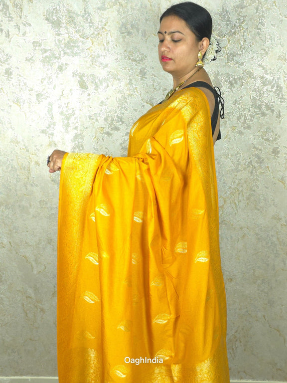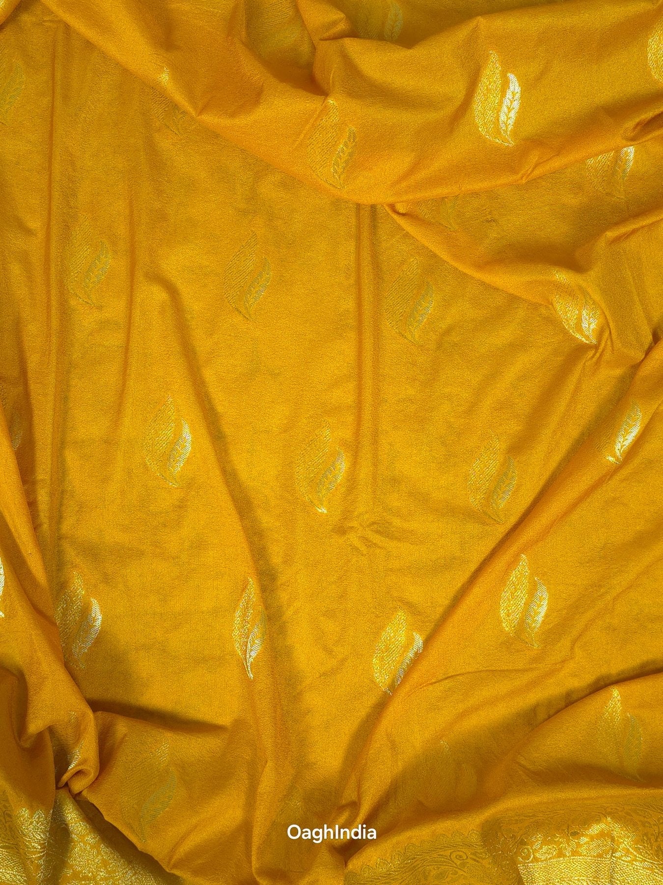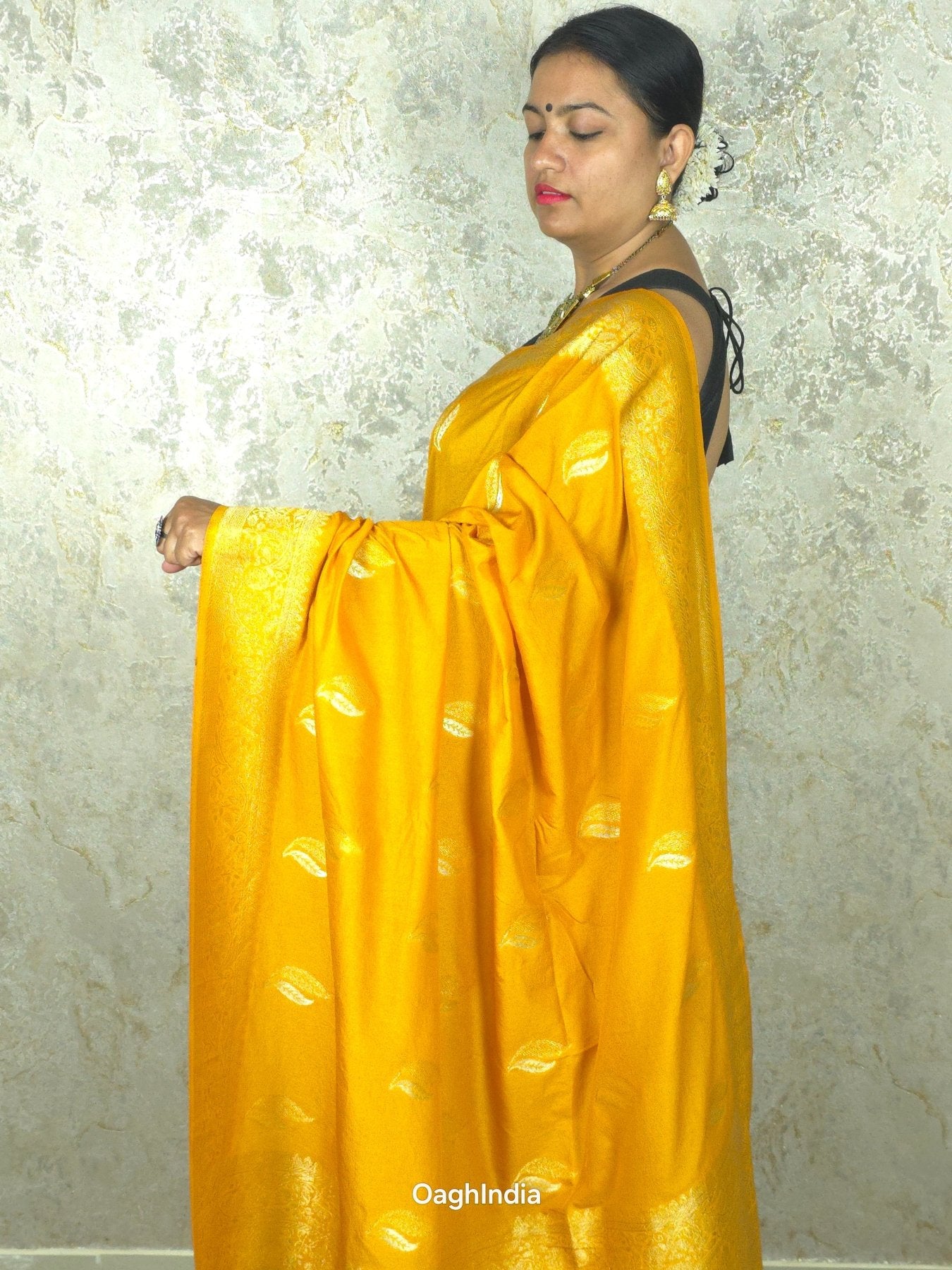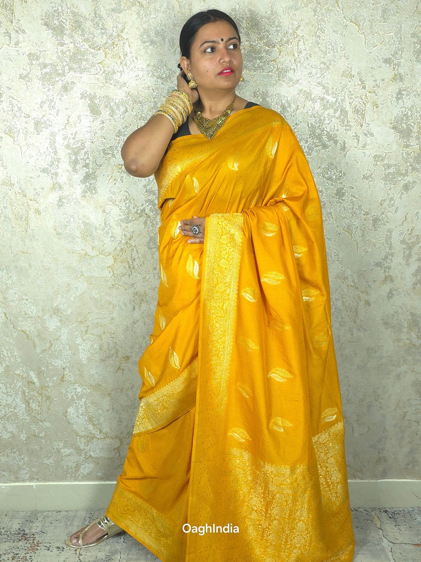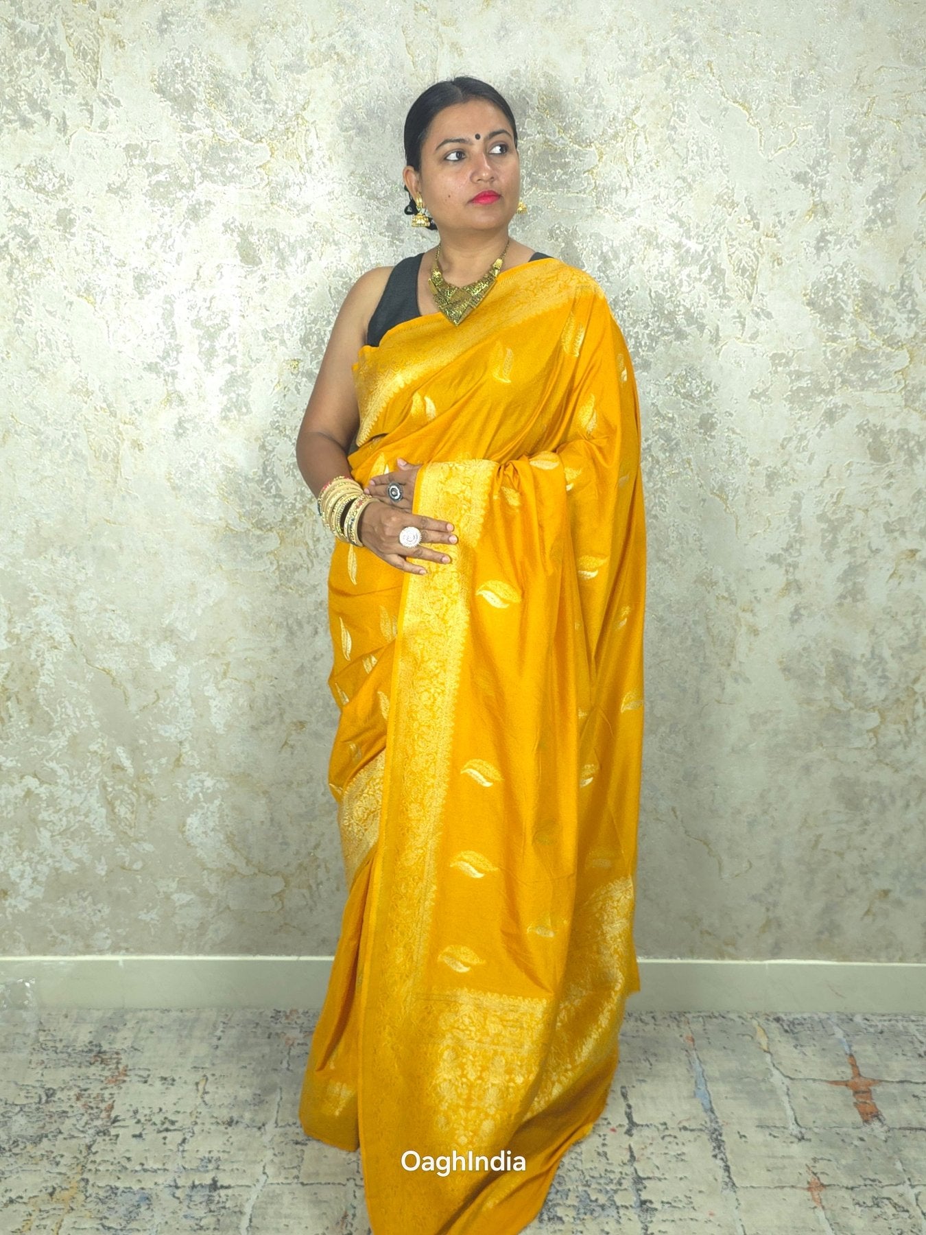 This delightful mustard yellow crepe georgette Banarasi saree is beautifully embellished with intricate leaf work, adding a fresh and vibrant touch. 🍃✨ The soft, flowing fabric drapes elegantly, making it perfect for any occasion. The warm mustard hue is both cheerful and sophisticated, ensuring you stand out with grace.