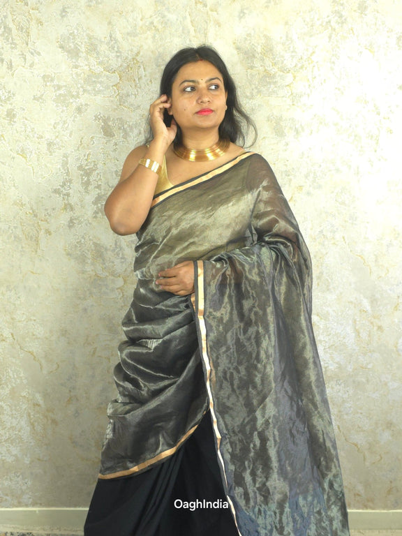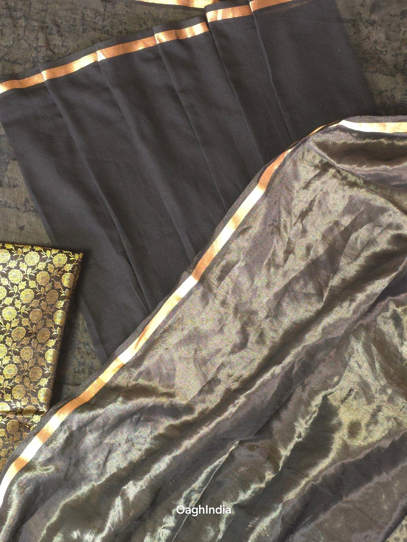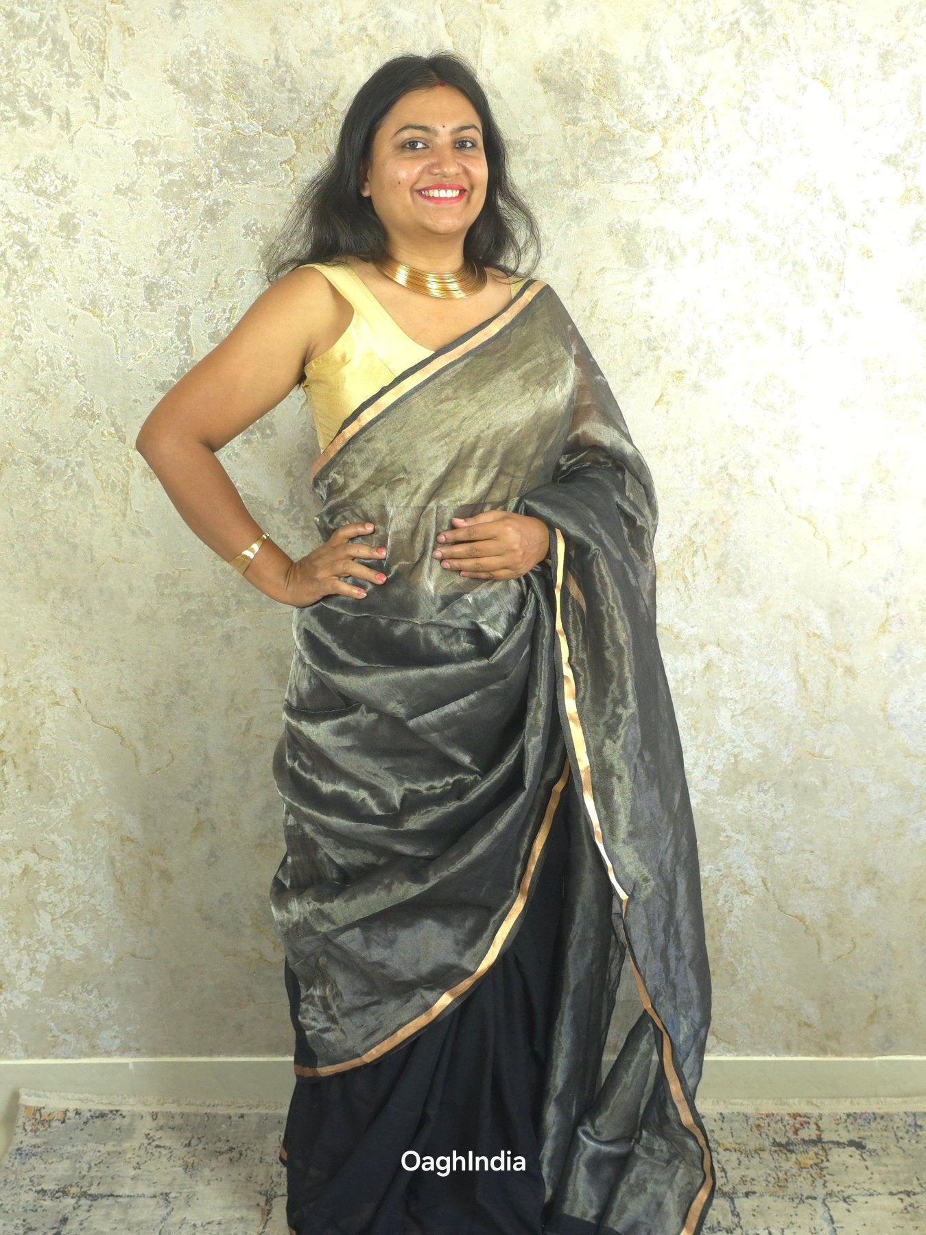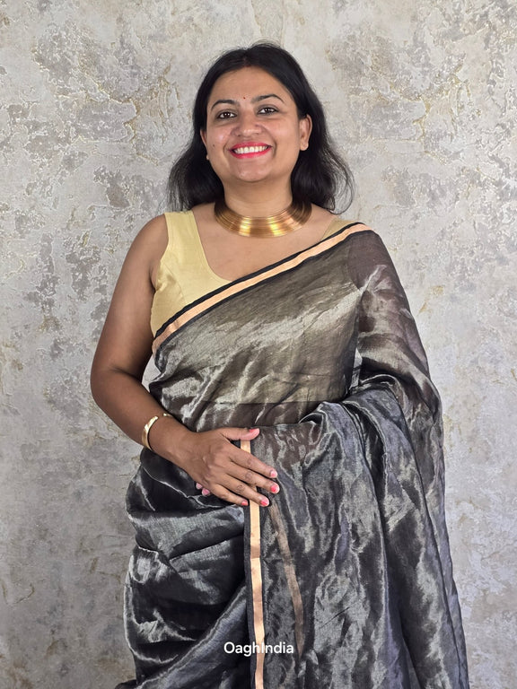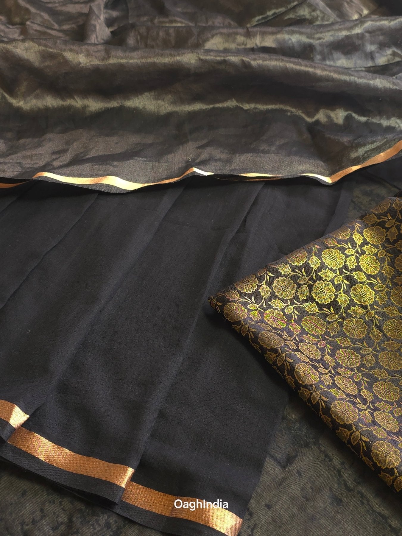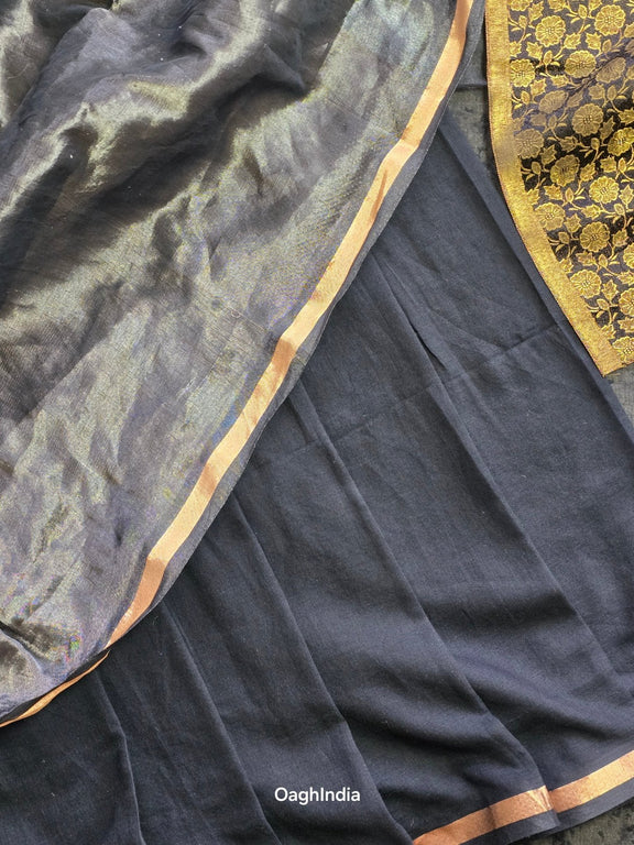 Mystic Grey is where timeless grace meets modern ease. Crafted with soft black mul cotton on the body, this saree drapes like a dream, gently contouring your silhouette for a flattering, slimming effect. The rich grey tissue pallu, finished with a lustrous golden border, adds just the right amount of shimmer. Perfect for evenings when you want to make a statement with effortless sophistication.
