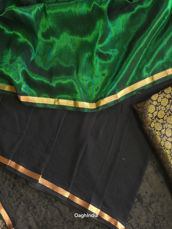 Noir is where timeless grace meets modern ease. Crafted with soft black mul cotton on the body, this saree drapes like a dream, gently contouring your silhouette for a flattering, slimming effect. The rich green tissue pallu, finished with a lustrous golden border, adds just the right amount of shimmer. Perfect for evenings when you want to make a statement with effortless sophistication.