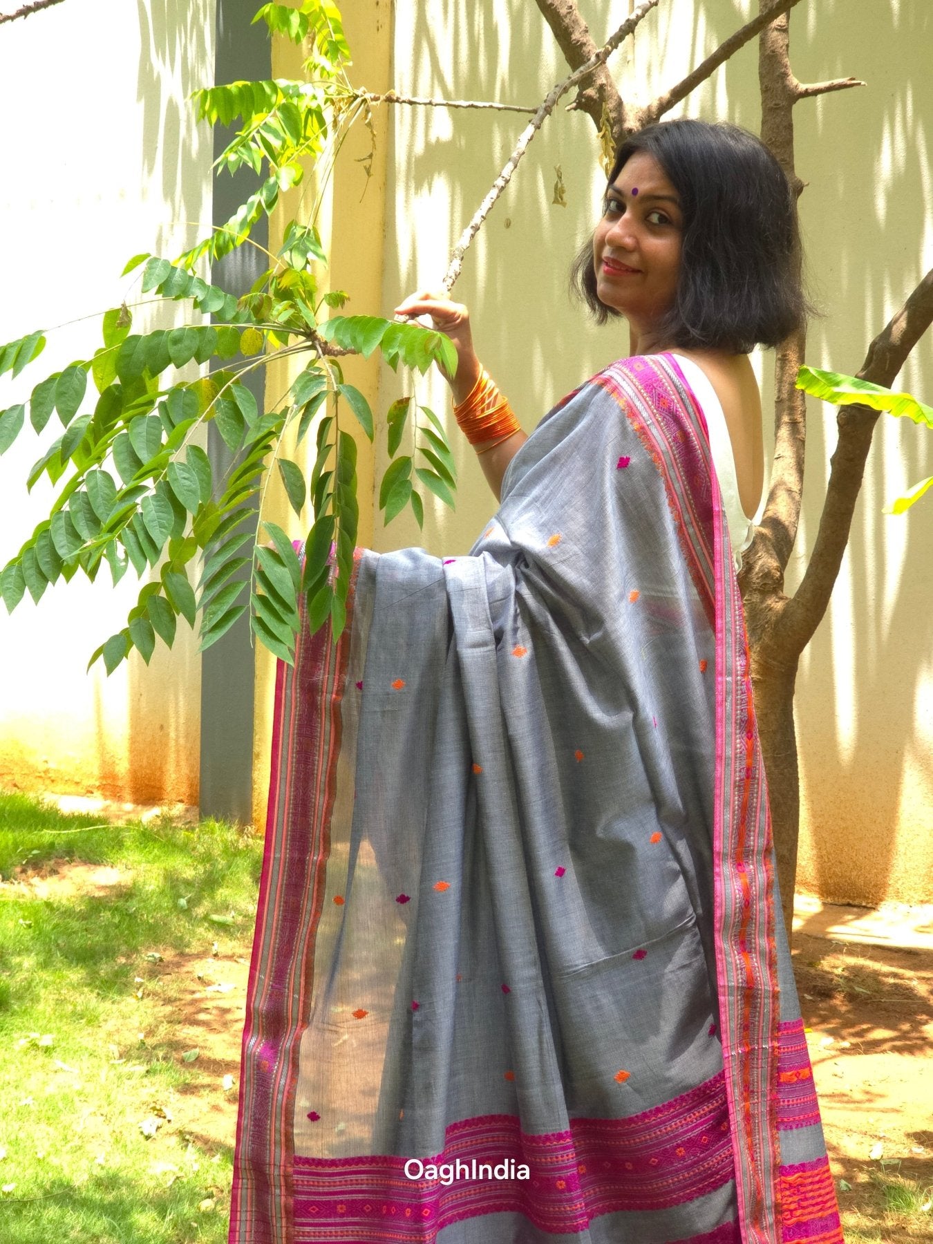 Rooted in simplicity, elevated by detail — Paansh is a celebration of understated elegance. Woven in soft grey cotton, this saree is dotted with playful magenta and orange butis across the body, lending it a vibrant touch without overwhelming the senses. The borders are finely lined with pink and magenta threads, leading to a rich and intricate pallu that bursts into bold fuchsia and silver accents — a delightful surprise that adds depth and drama.