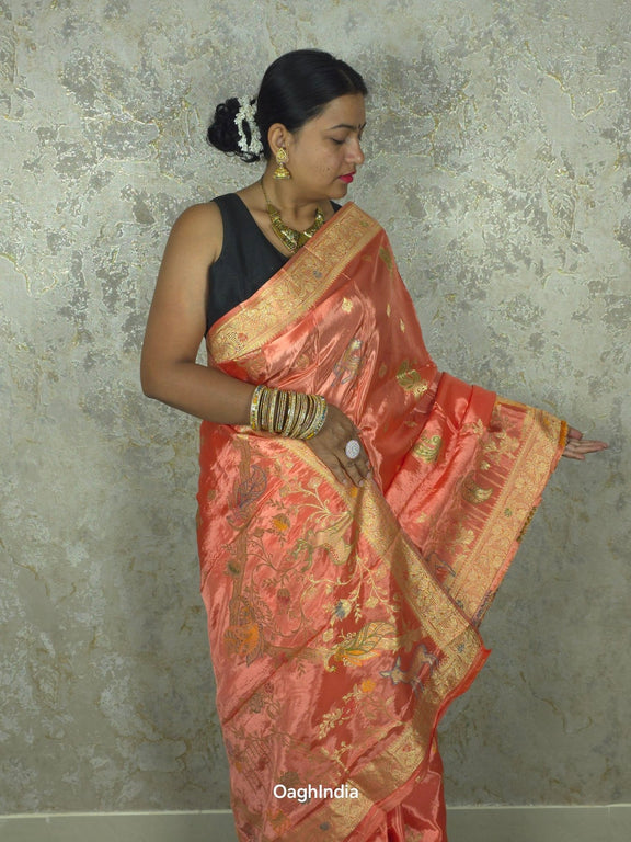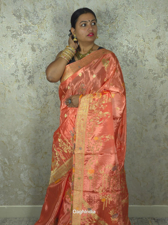 This stunning peach pink Mashru tissue Banarasi saree is adorned with heavy embroidery of nature, bringing a vibrant and lively touch to your look. 🌸🌿✨ The delicate tissue fabric adds a soft and flowy feel, making it perfect for festive occasions. Each intricate detail showcases exquisite craftsmanship, making this saree a true work of art.