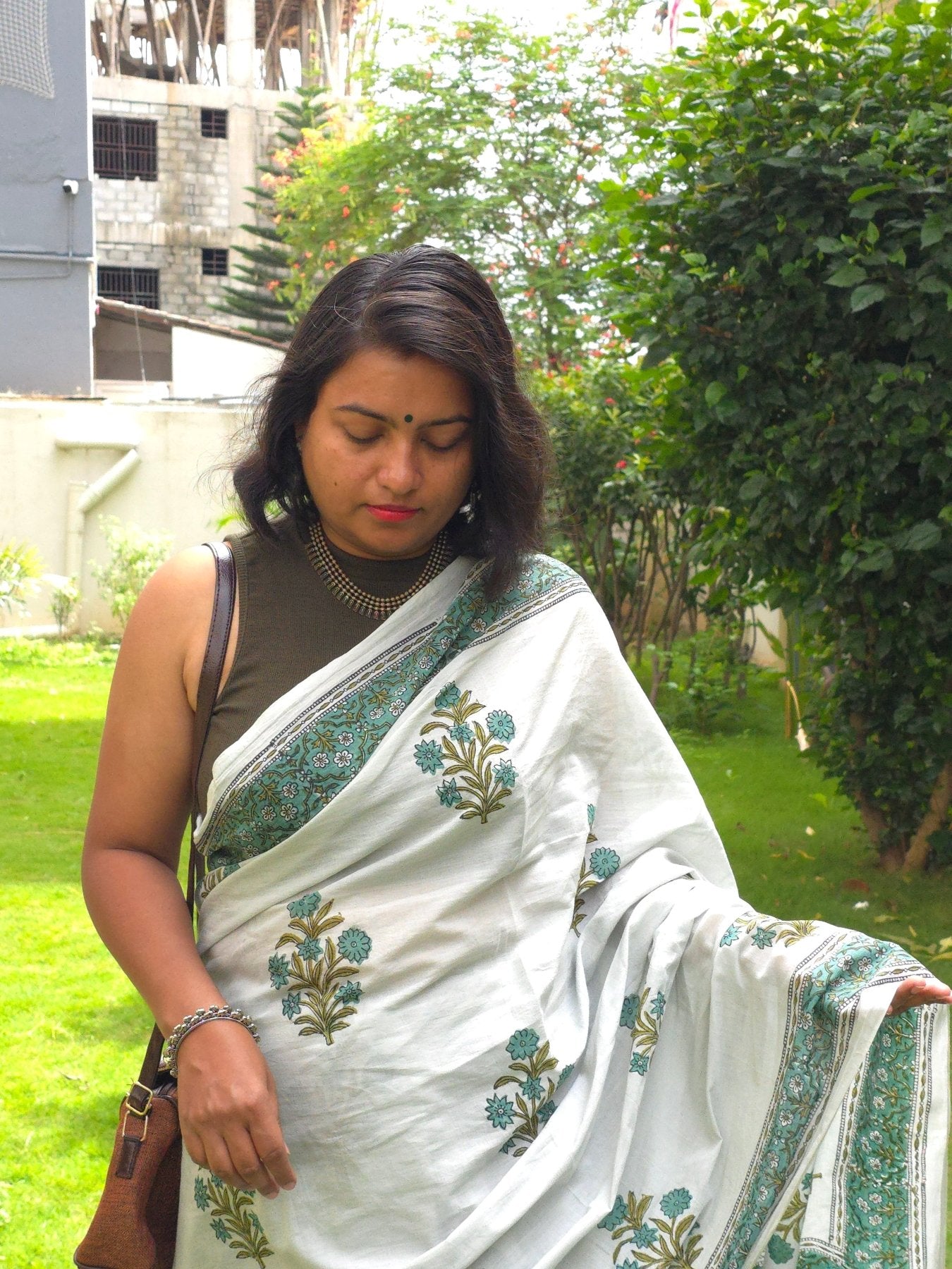 Perfect for serene mornings, light festive occasions, or mindful gatherings, this saree is as breathable and lightweight as it is timeless.