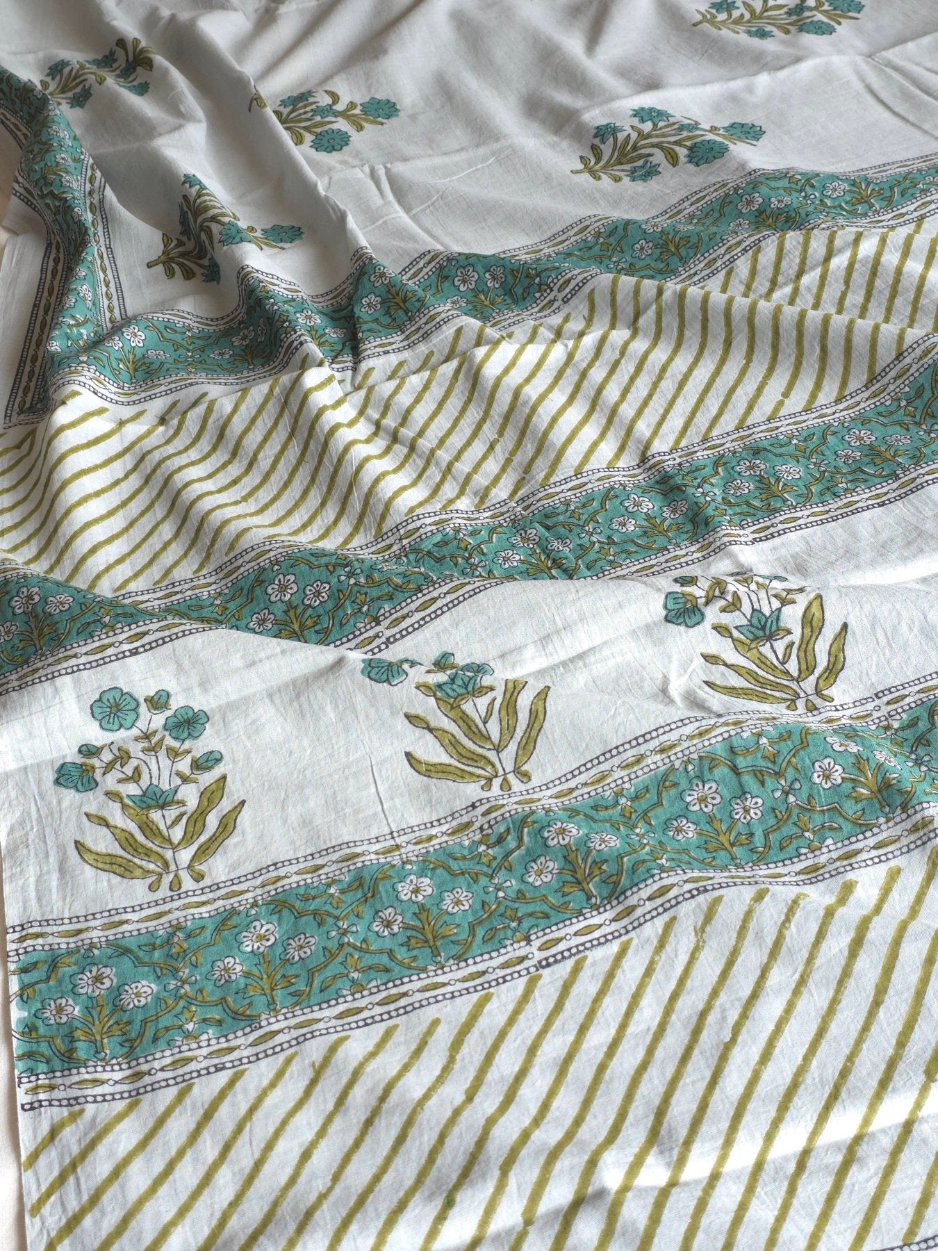 Evoke freshness and quiet elegance with our Pistachio Green Handblock Print Mul Cotton Saree. Crafted from ultra-soft mul cotton, this saree features delicate handblock floral motifs in deep green and teal, set against a soothing pistachio green base. The striped pattern and ornamental floral borders on the pallu add layers of subtle beauty, making this piece effortlessly graceful.