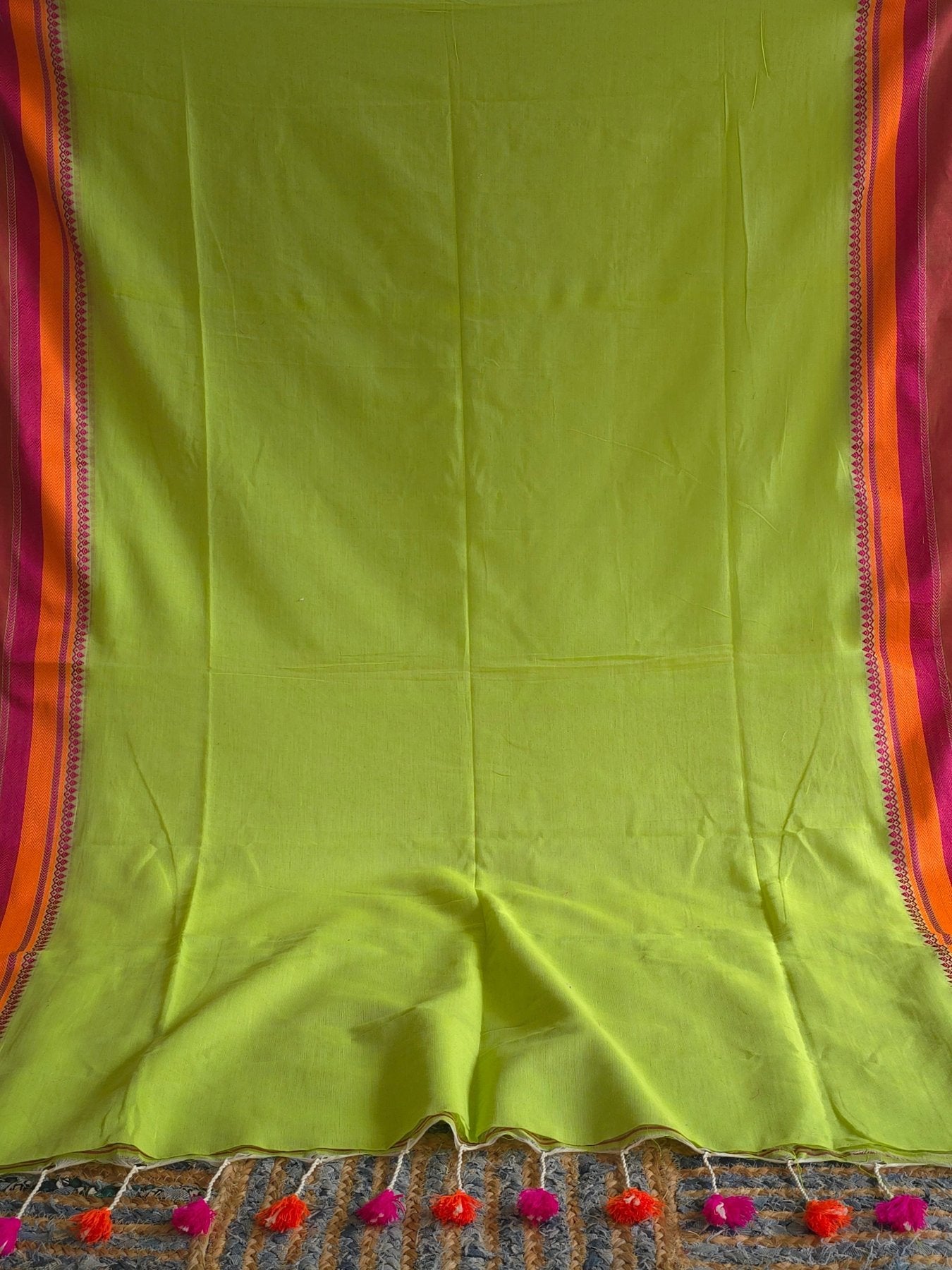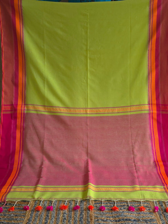 Crafted from pure cotton, these sarees are as comfortable as they are beautiful! With a soft, easy drape, you'll feel at ease all day long. The plain body gives a minimalistic charm, while the intricately woven borders and contrasting hues on the body and pallu add an eye-catching pop of elegance.