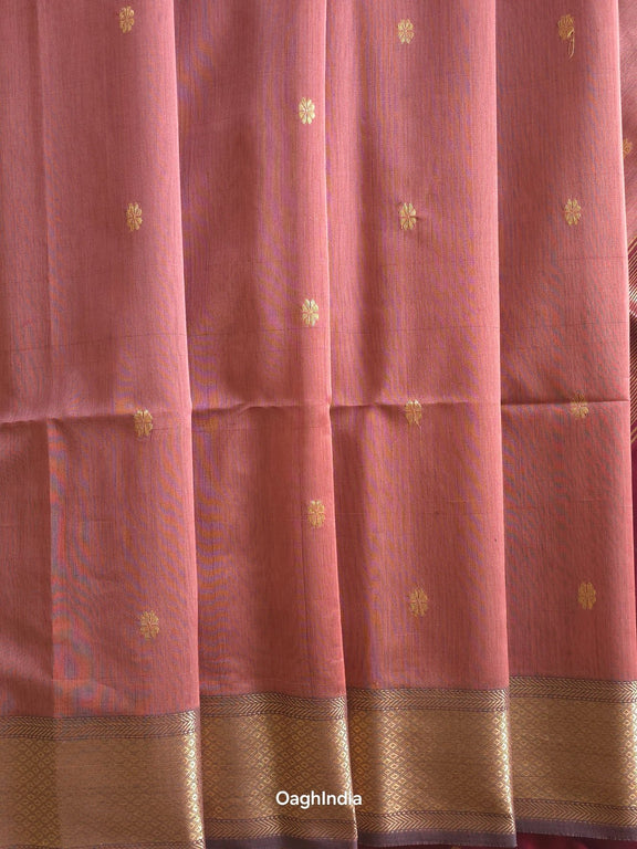 Every inch of the saree is handwoven with love and care, and the delicate zari butis (golden dots) add a royal touch.✨ The shine of the fabric is so beautiful that it almost feels like wearing a piece of the sun. ☀️ This saree isn’t just any saree—it’s a special gift made by the hardworking weavers of Maheshwar, using the most luxurious materials.
