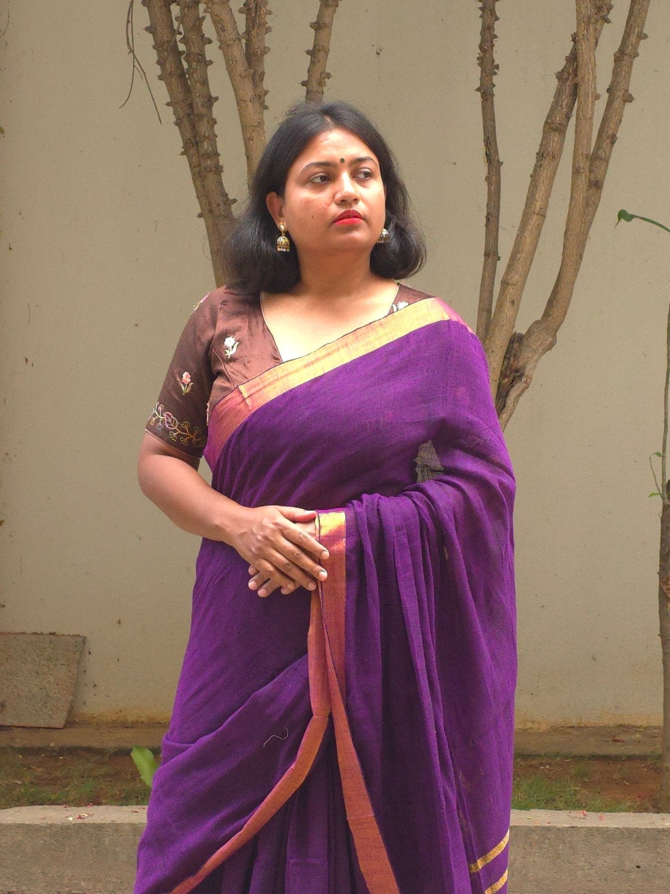 Available in a solid color, the luxurious body of the saree drapes beautifully, exuding an aura of grace and refinement. The copper border adds a touch of sophistication, while minimal work on the pallu enhances the saree's subtle charm. Perfect for the modern woman who values elegance and tradition, this saree is a versatile piece suitable for any occasion.