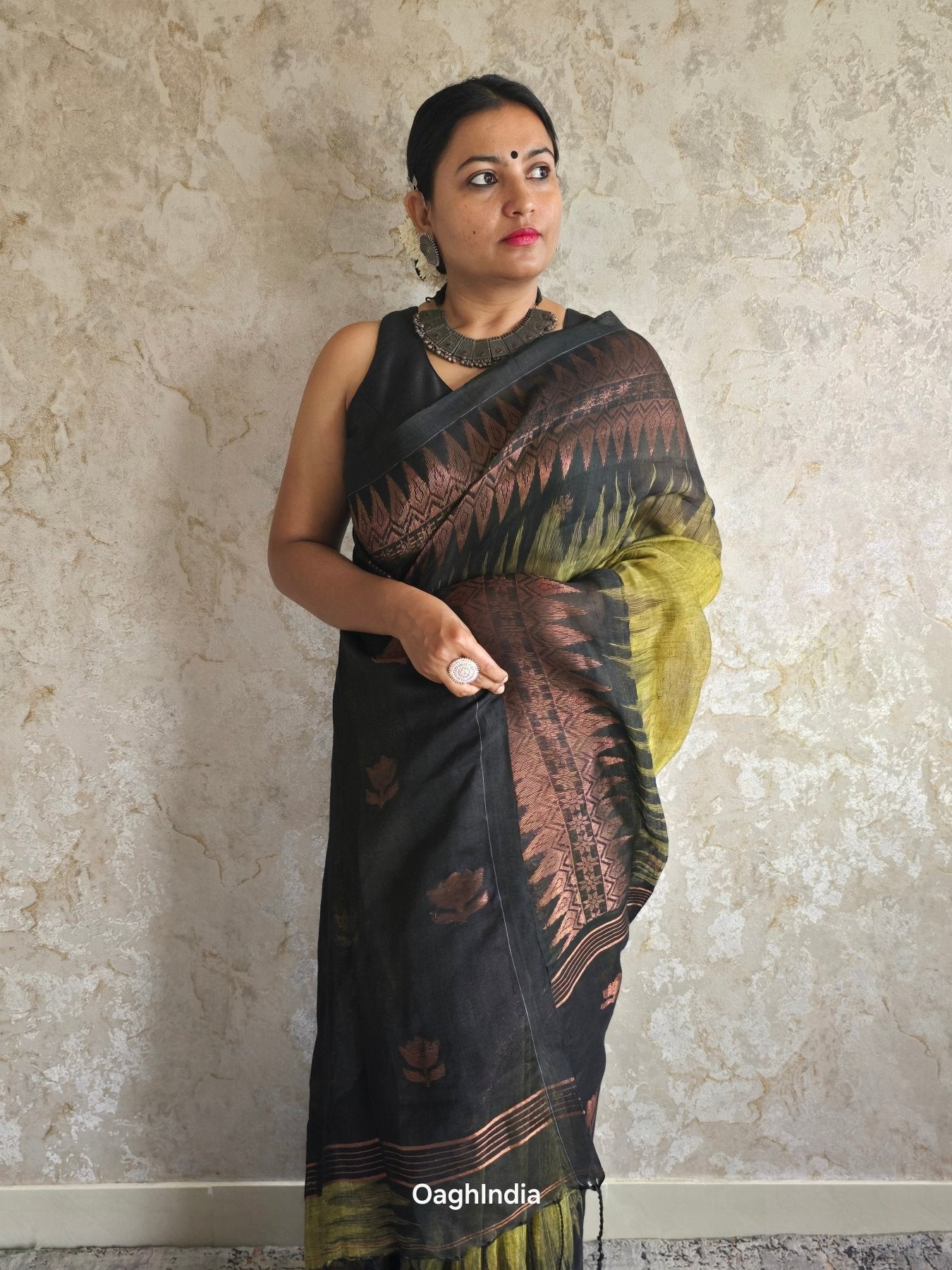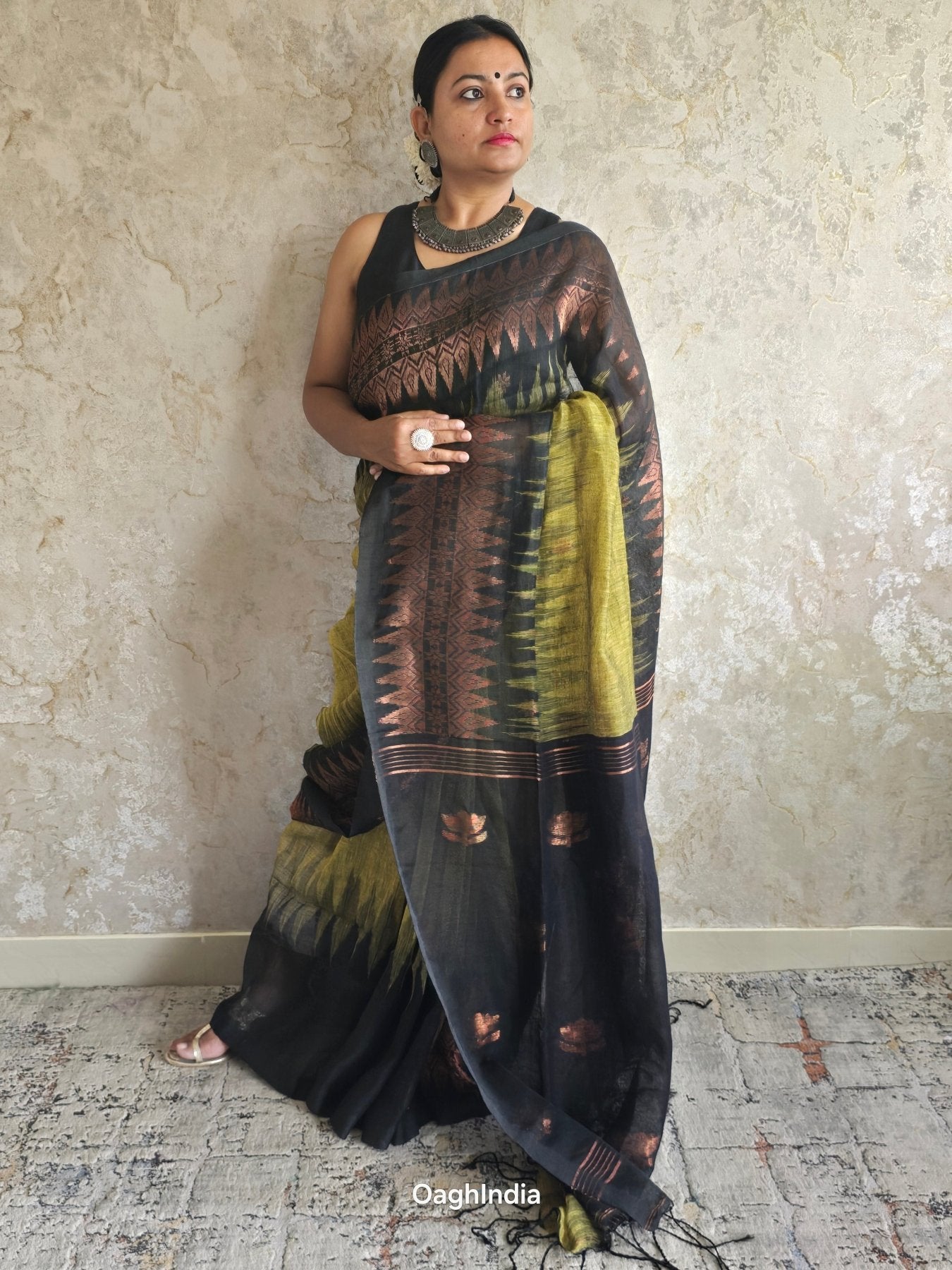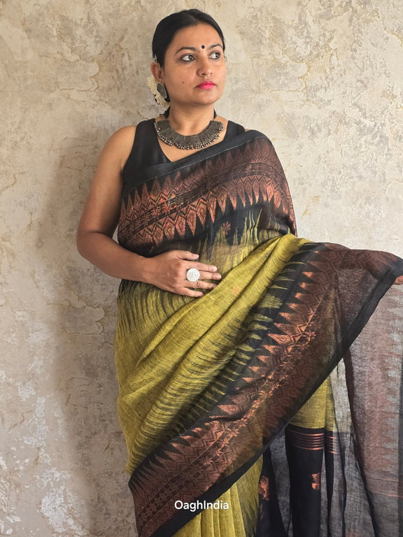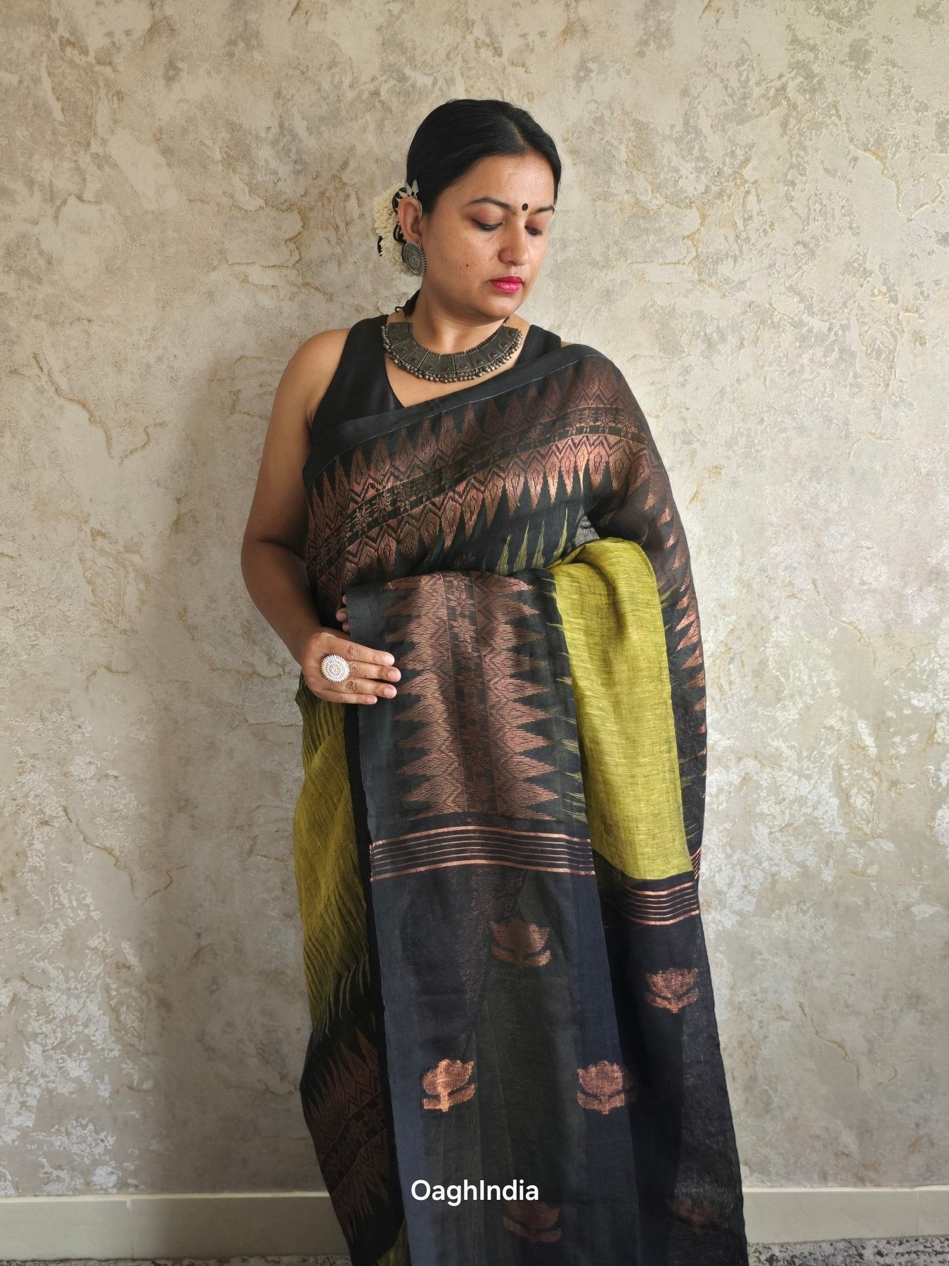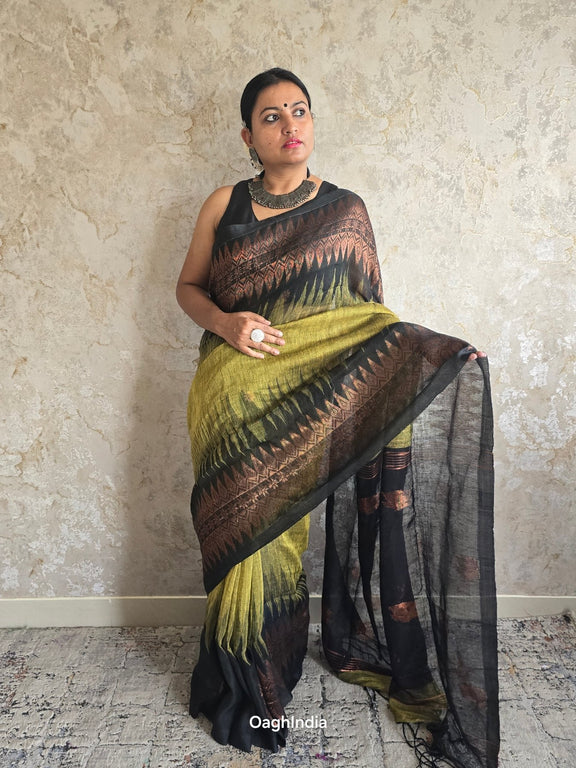 Experience the elegance of our Pure Linen Saree, adorned with the traditional Vidharbha Karvat Kinar (temple border) and intricate copper zari buti. This exquisite saree harmoniously blends the timeless appeal of linen with the rich heritage of Indian craftsmanship. Featuring stunning Ikkat work on the border, it adds a touch of sophistication and artistry.