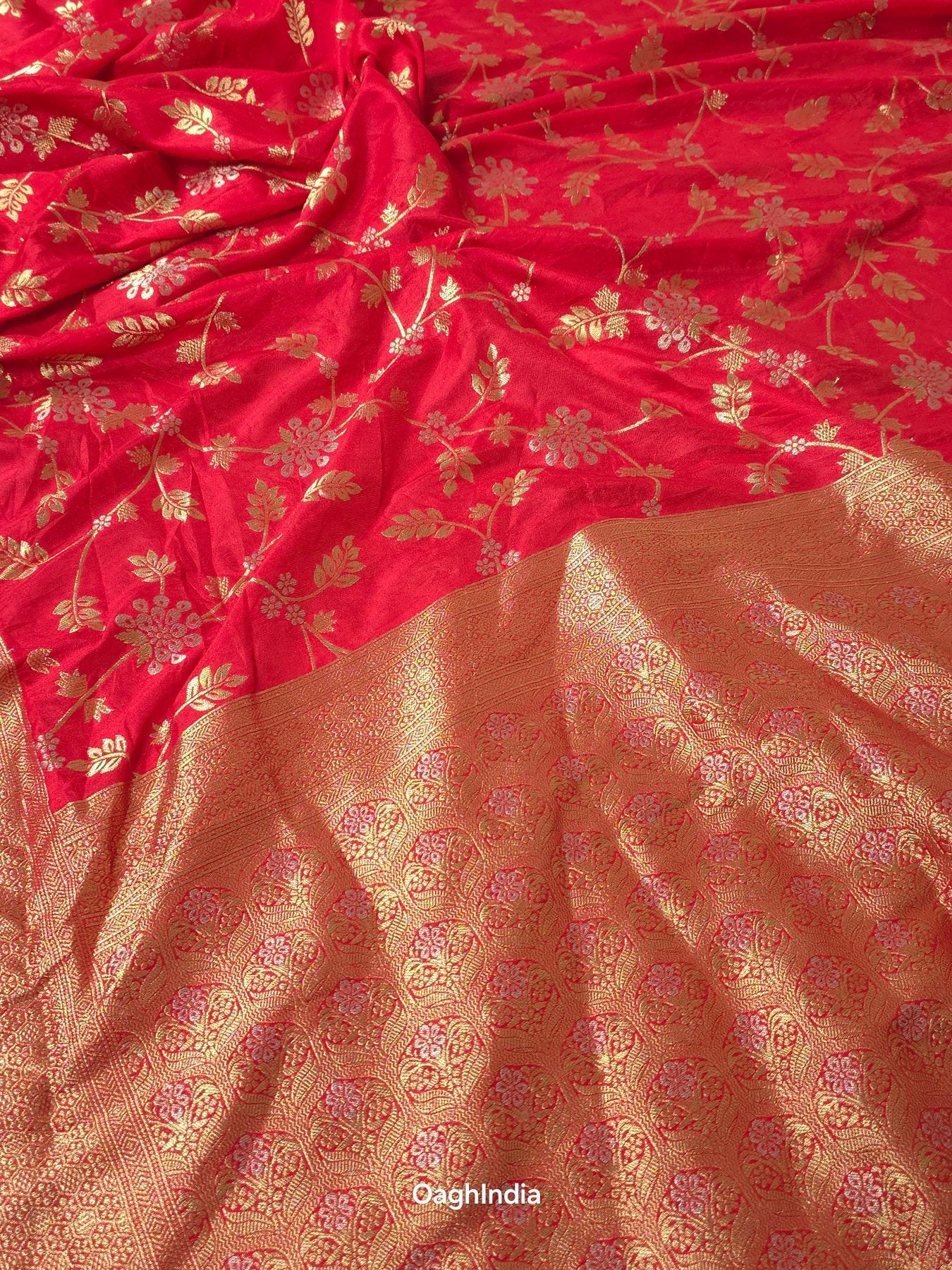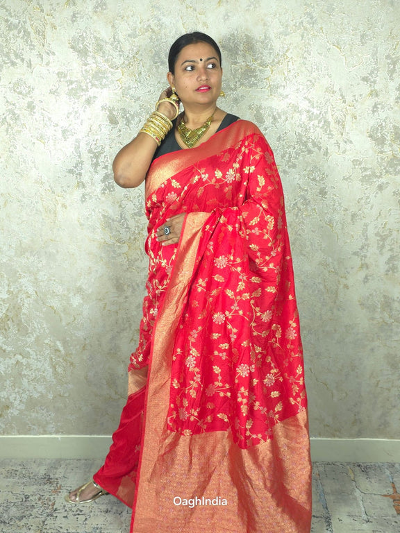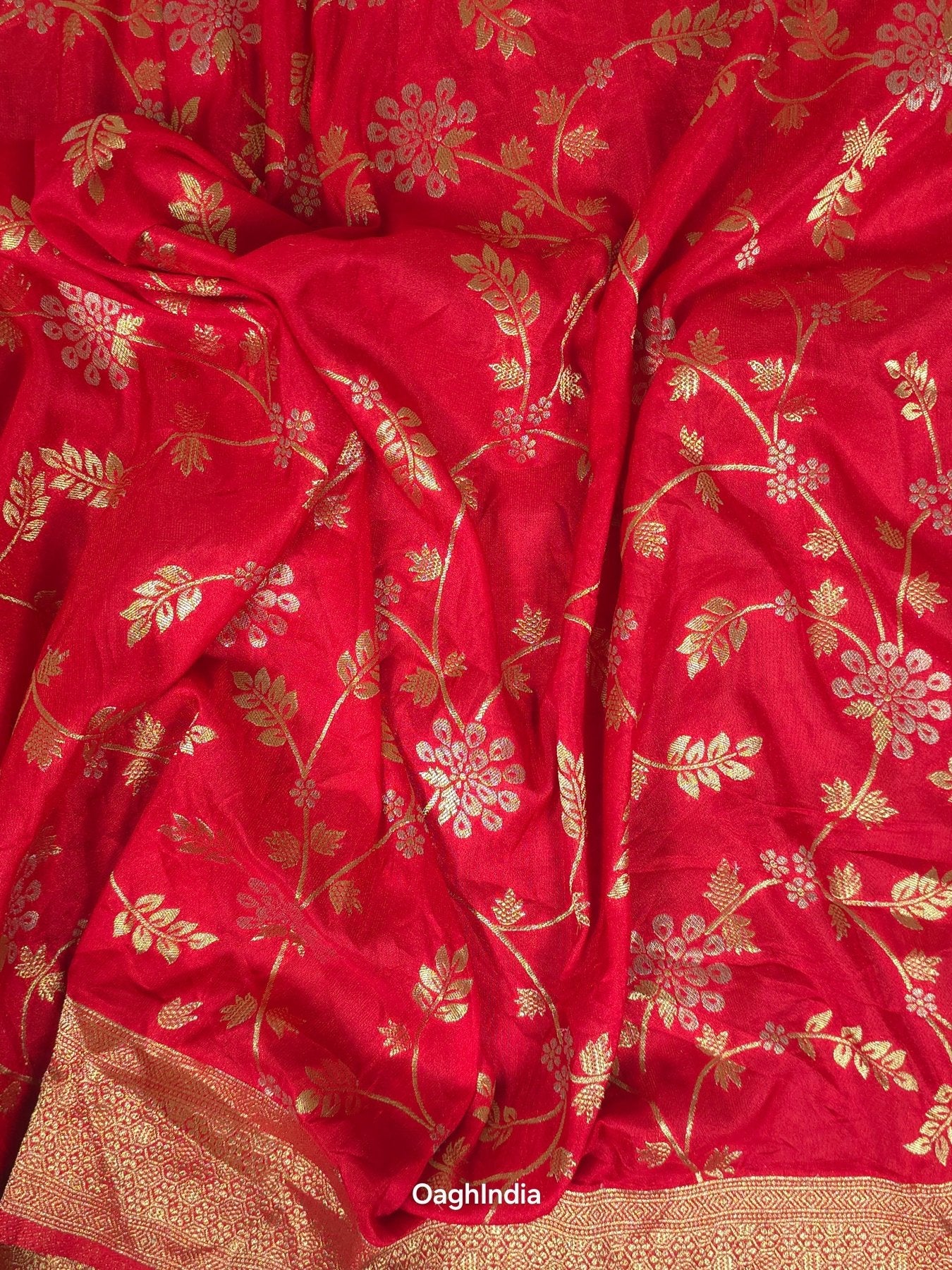 This exquisite red Chinon Banarasi saree features intricate jaal work on the body, creating a rich and elegant look. 🌹✨ The pallu boasts matching grand designs, adding a luxurious touch to this already stunning piece. Perfect for festive celebrations, this saree beautifully blends tradition with timeless elegance.