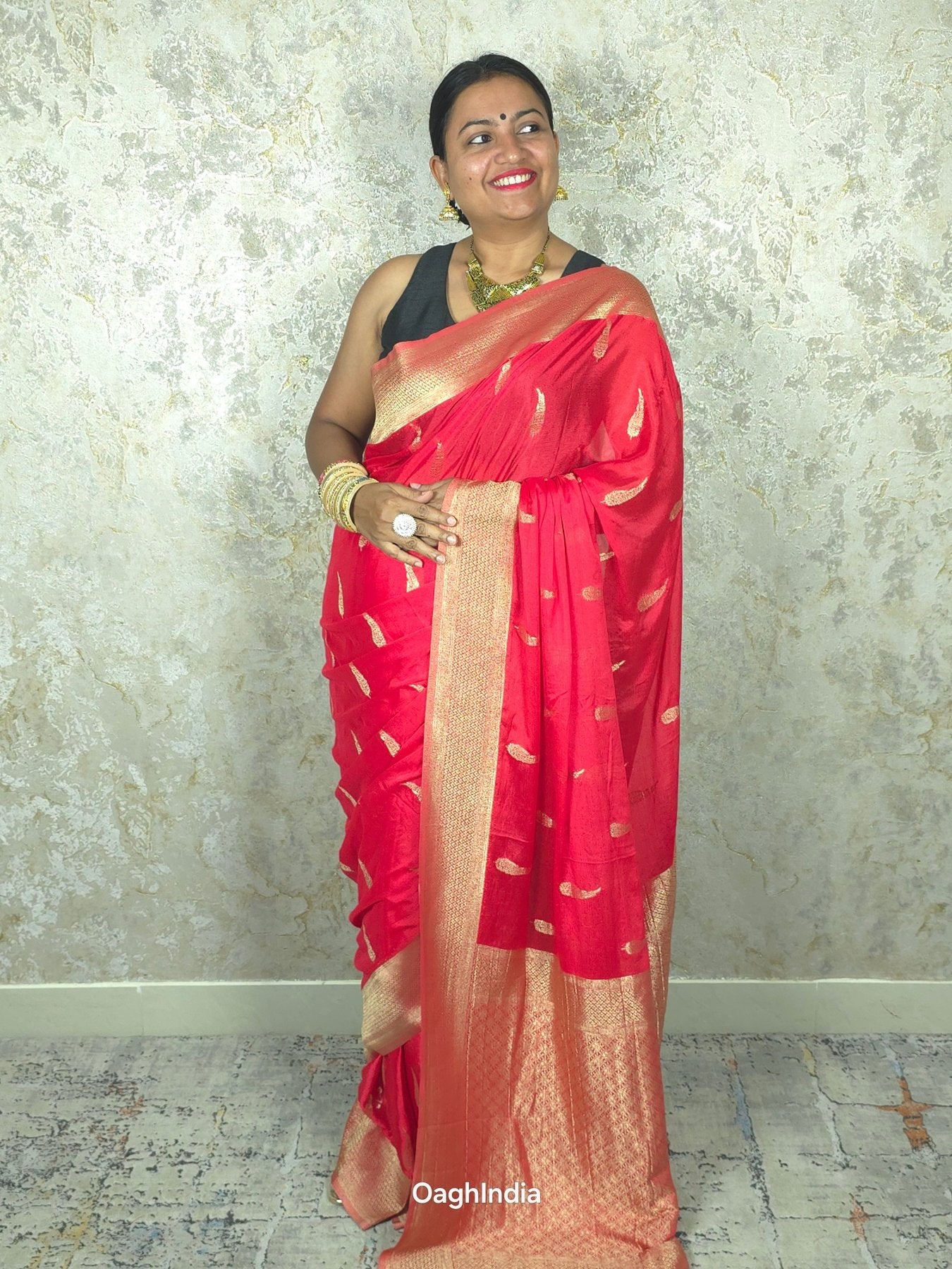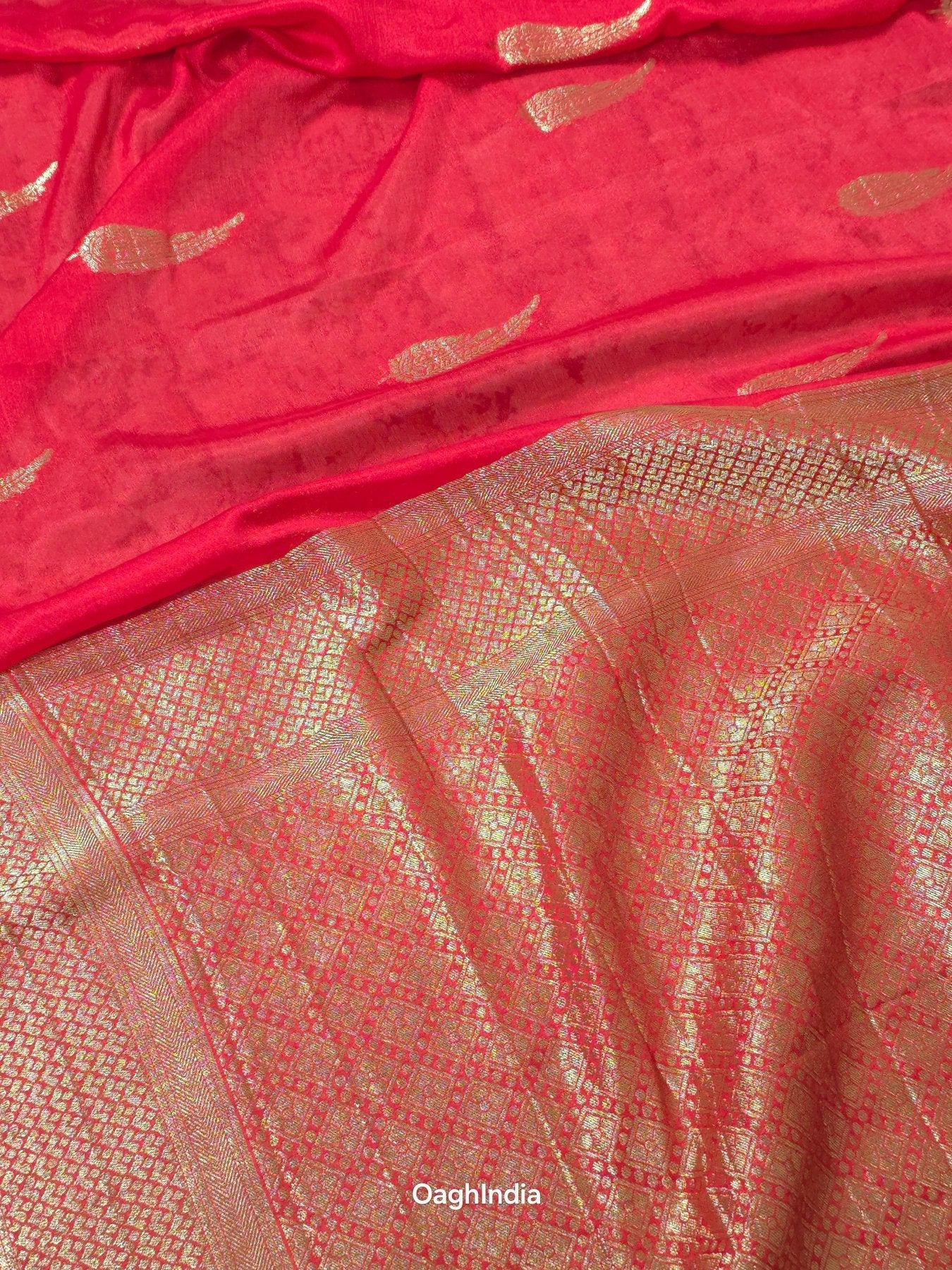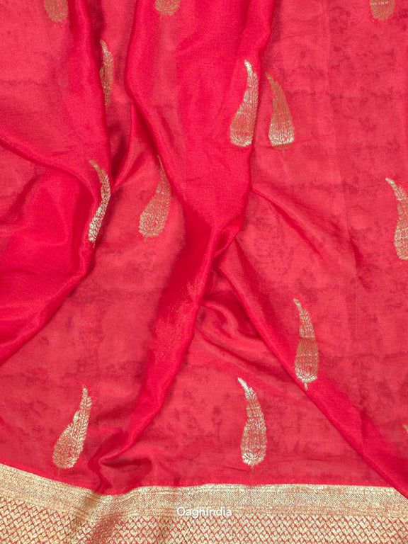 This elegant red crepe Banarasi saree is adorned with beautiful leaf designs on the body, giving it a delicate and graceful touch. 🍃✨ The pallu showcases similar grand work, making it perfect for festive occasions. With its flowy texture and intricate detailing, this saree adds a sophisticated charm to any event.
