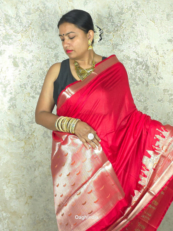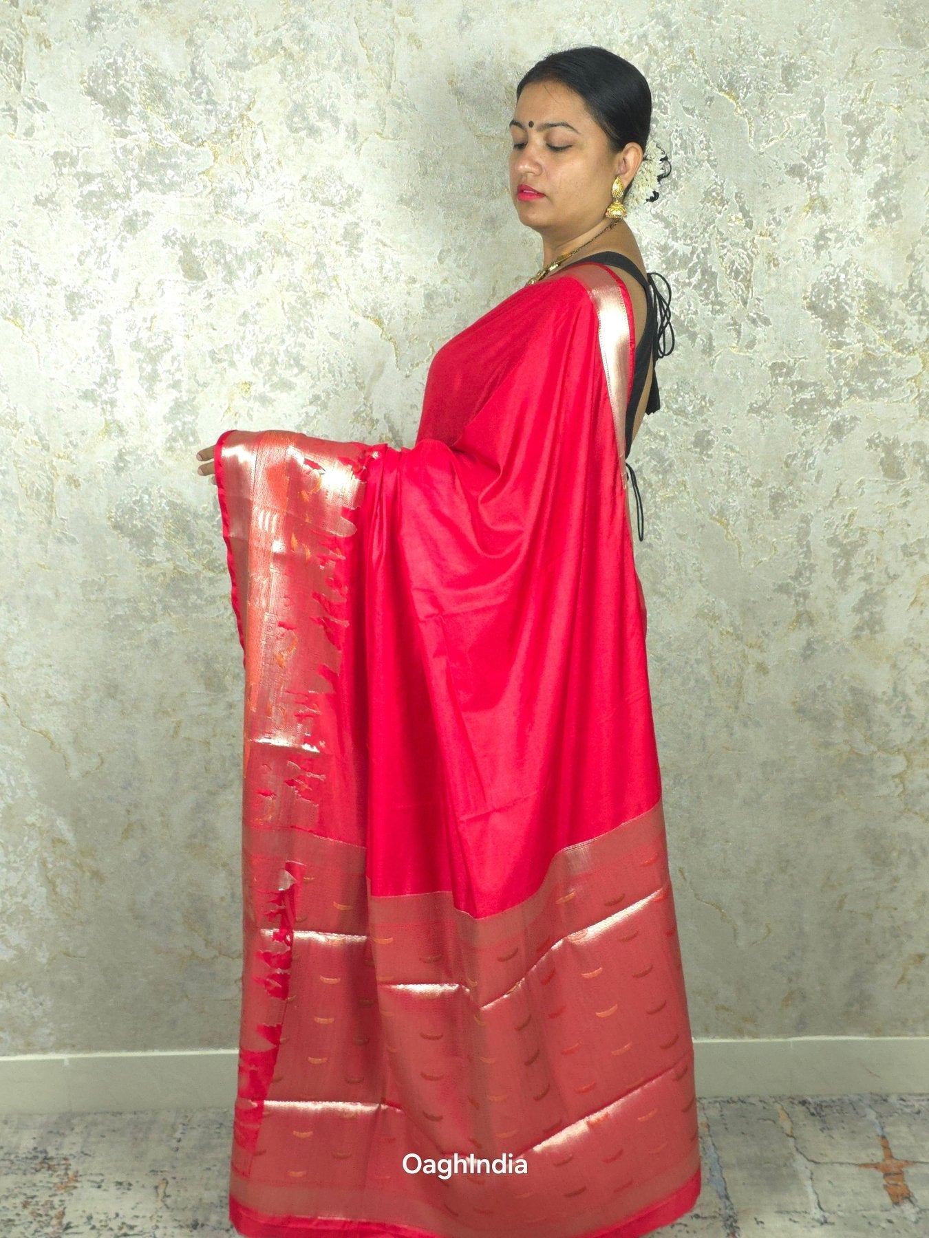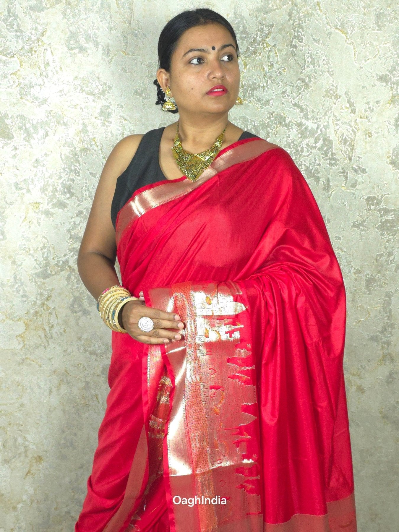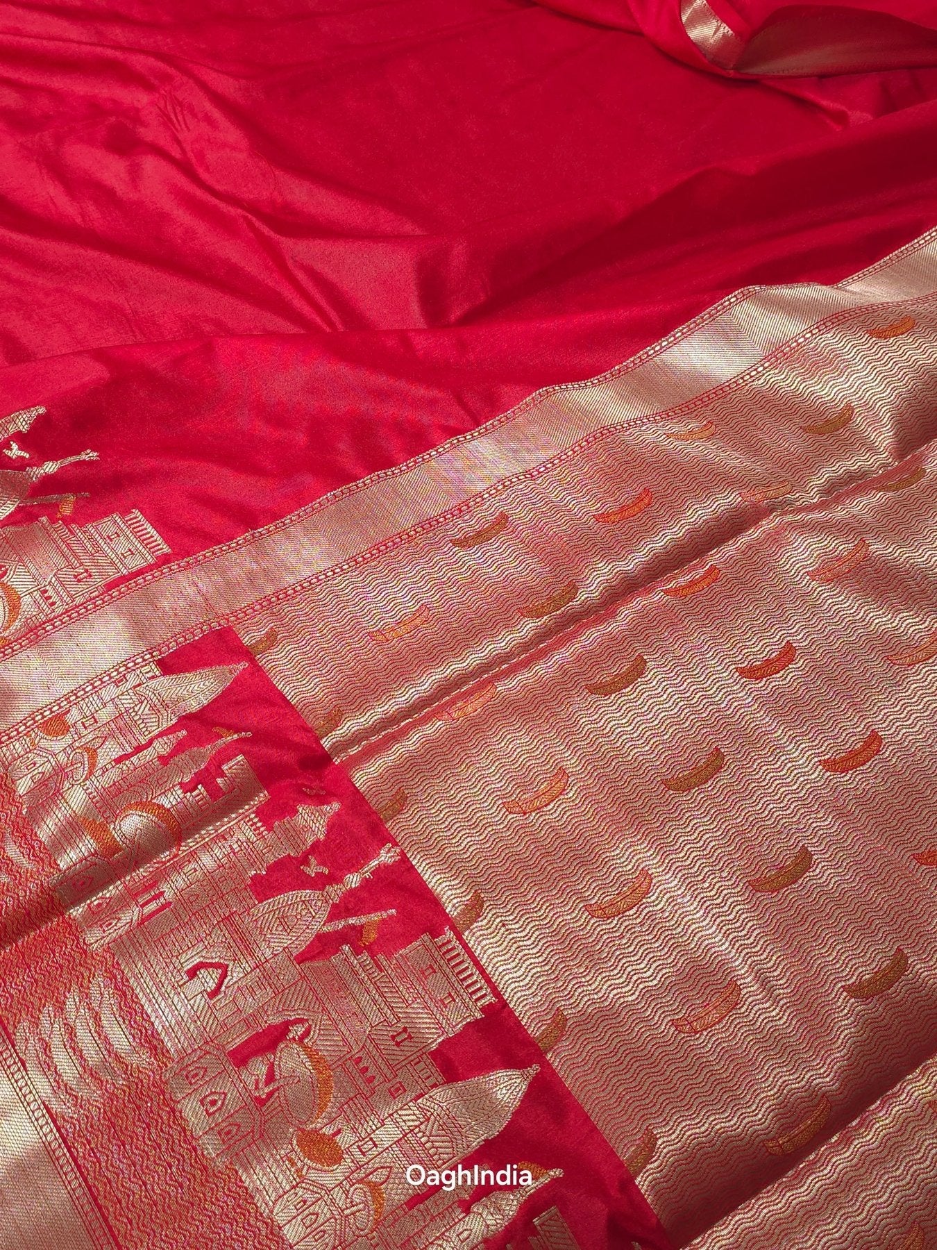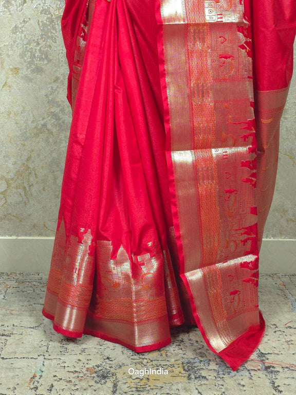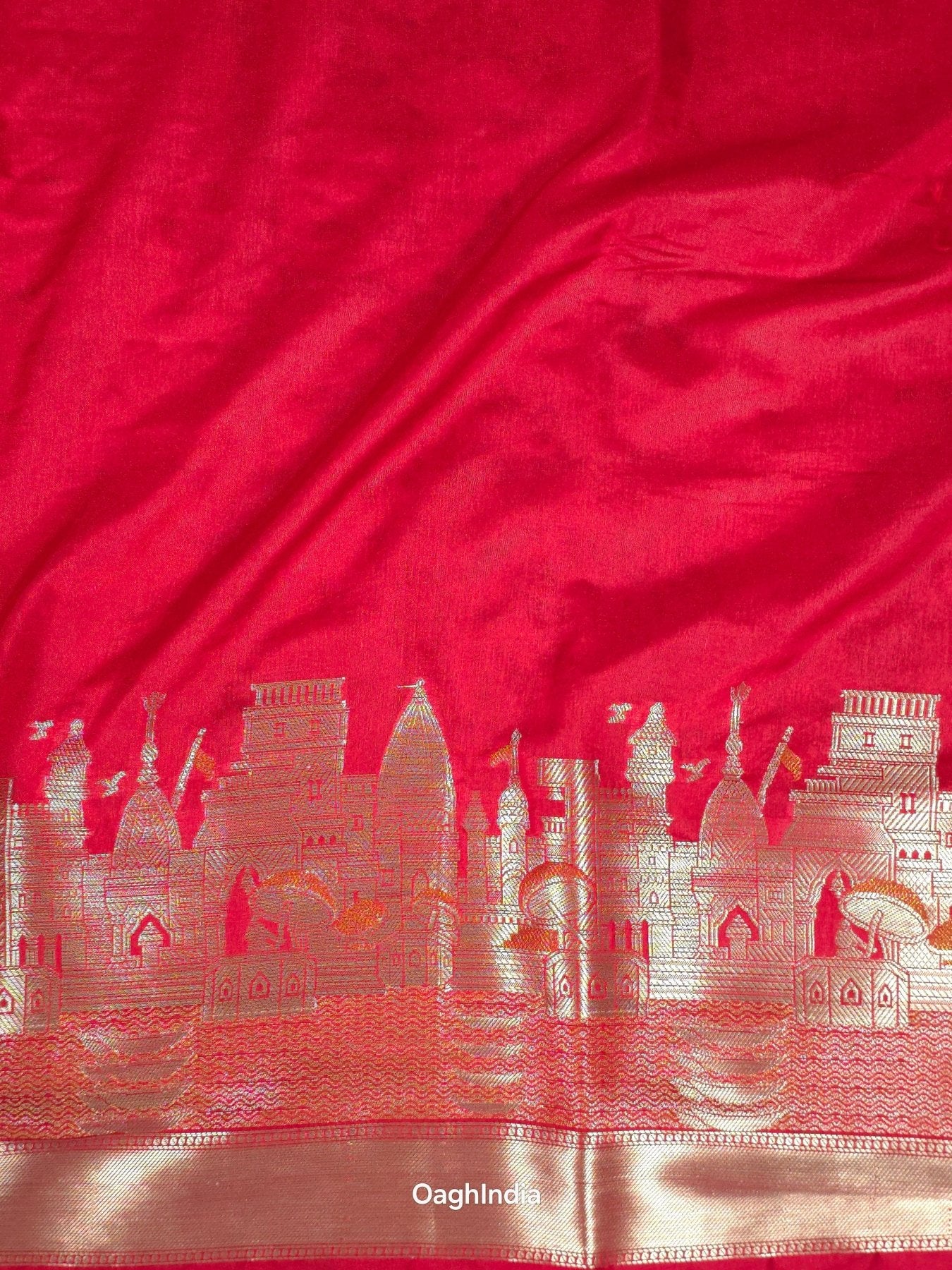 This elegant red Katan Banarasi saree showcases the iconic Banaras ghat design along the border, adding a unique and traditional touch. 🌹✨ The rich red hue paired with the detailed craftsmanship makes it perfect for special occasions. The luxurious fabric and timeless design make this saree a must-have for those who appreciate heritage.