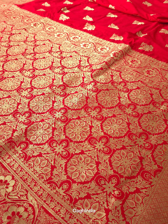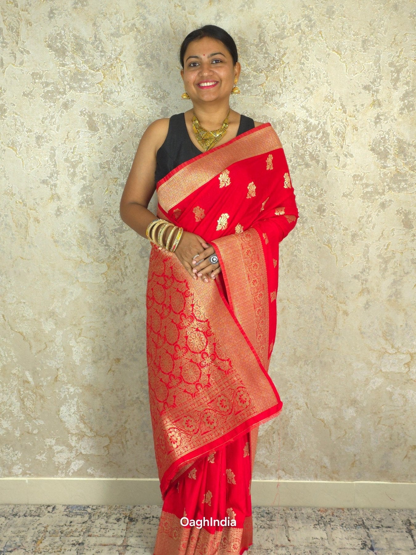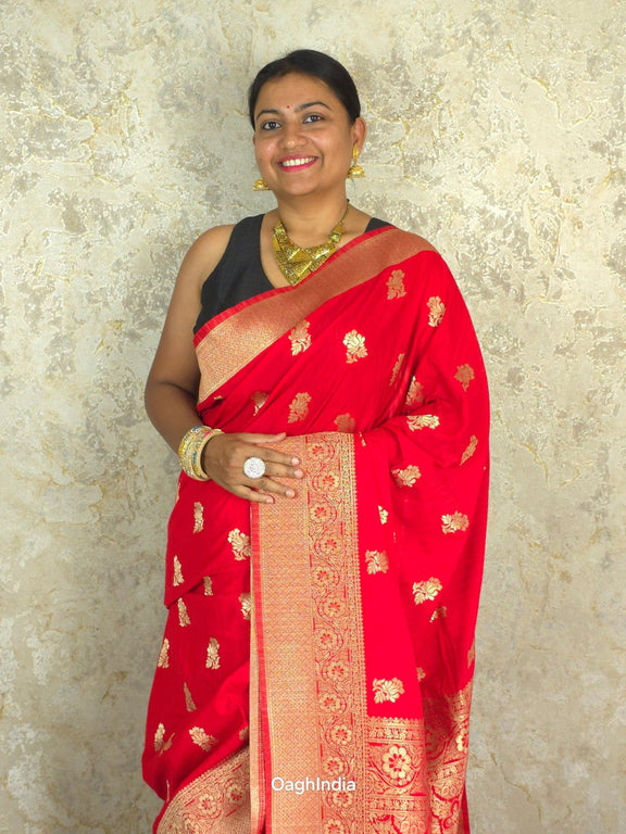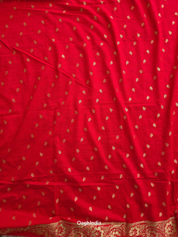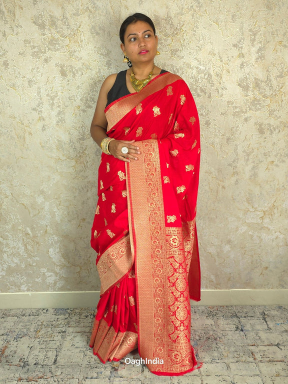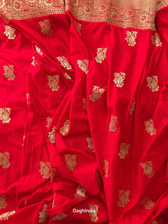 This red Katan silk Banarasi saree is a blend of grace and grandeur. 🌹✨ The saree features a stunning golden pallu that shines with richness, while the delicate golden butis on the body add a royal touch. Perfect for festive occasions, this saree will make you stand out with its timeless charm. 👑