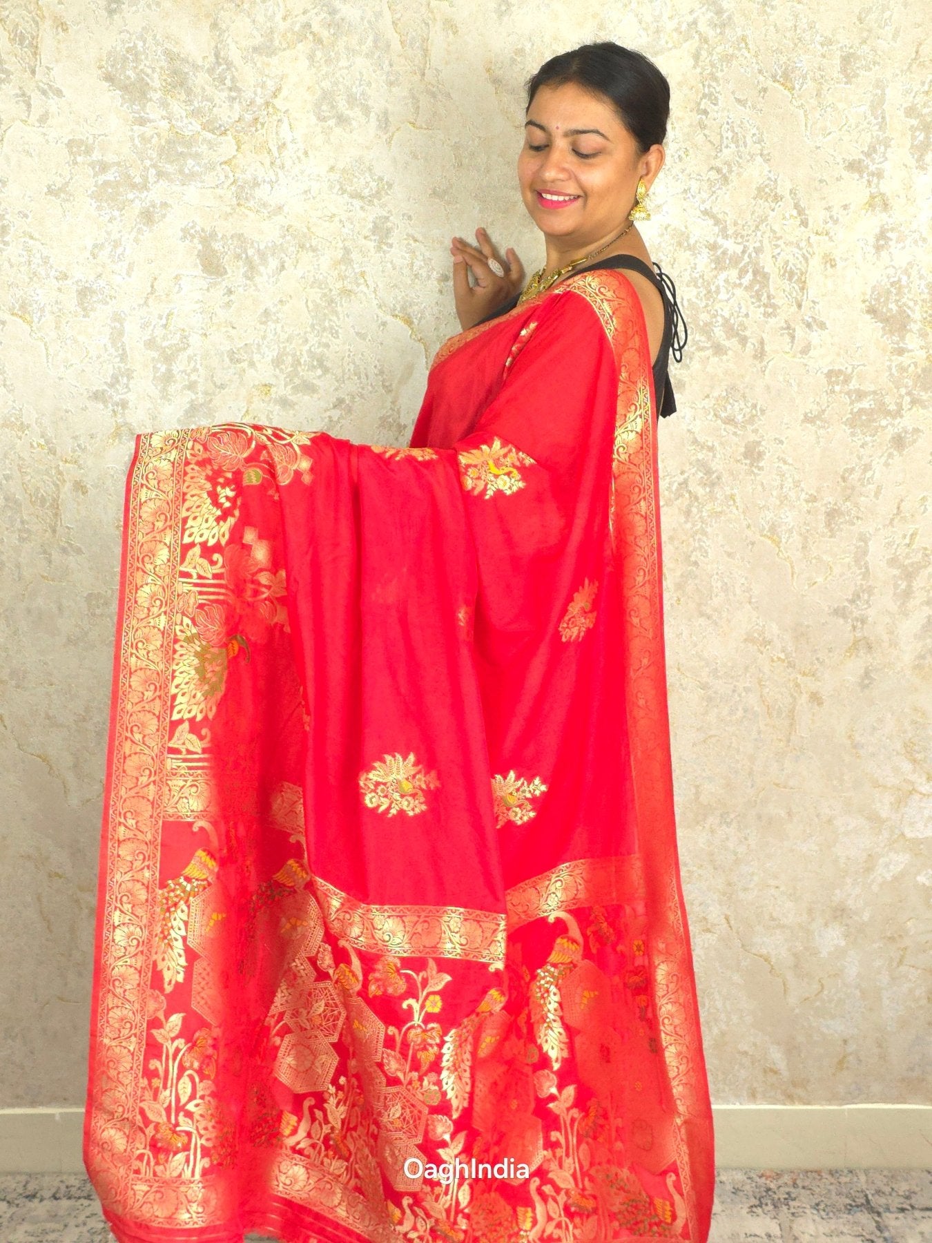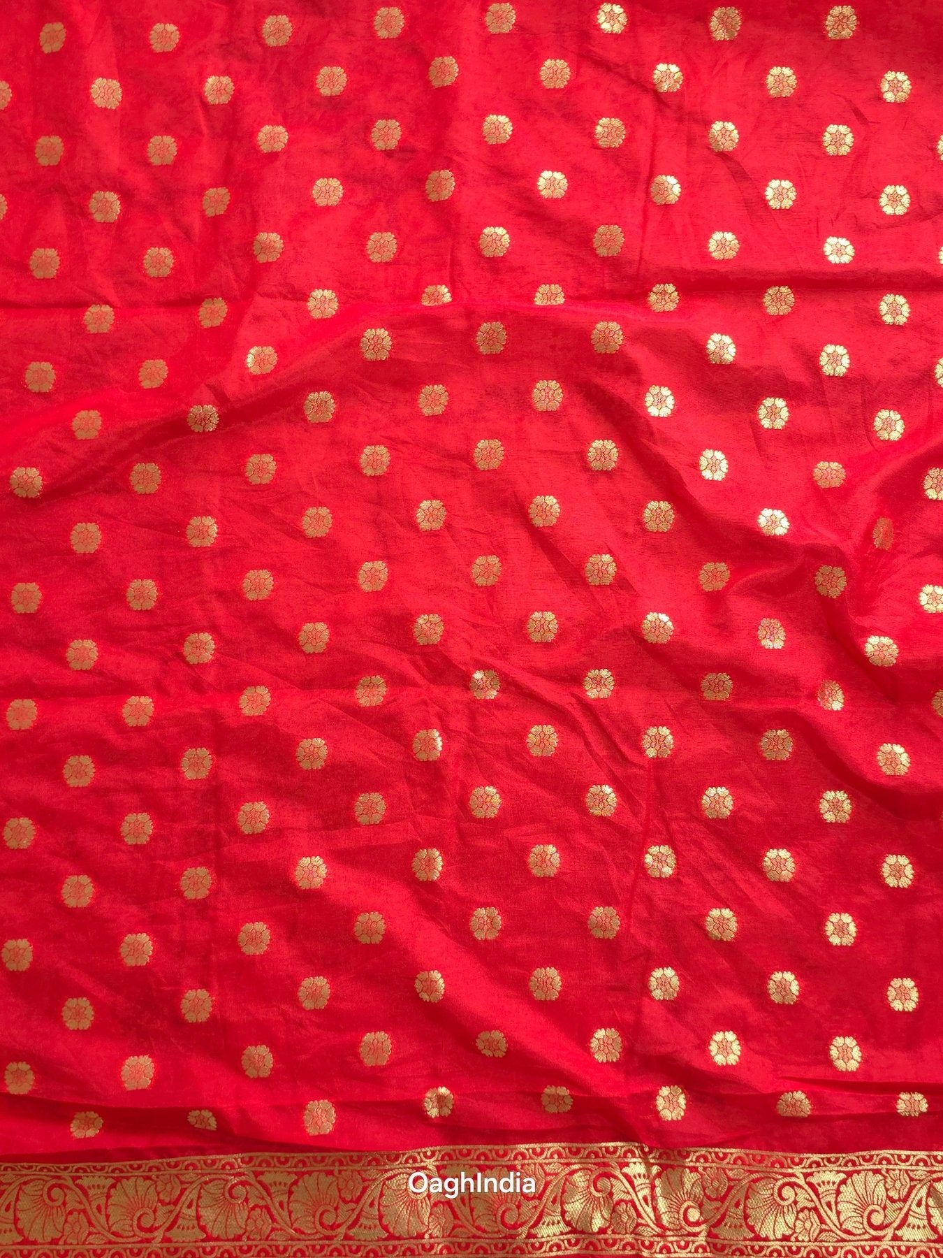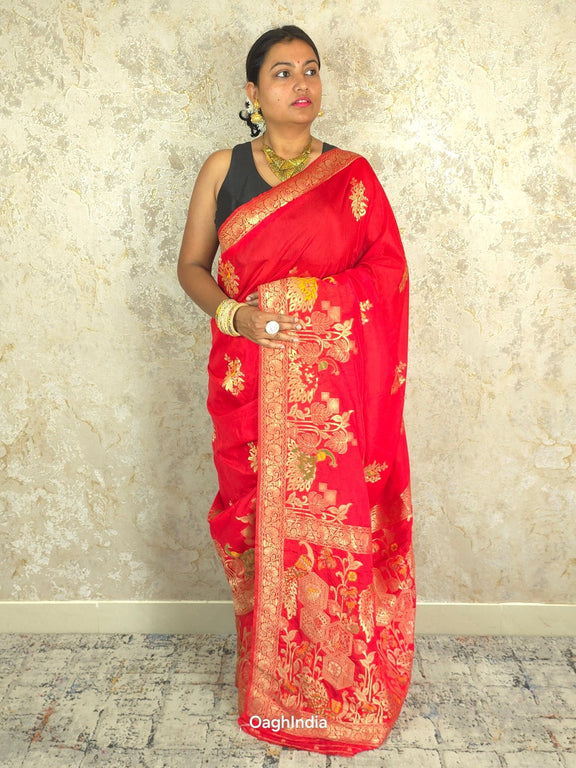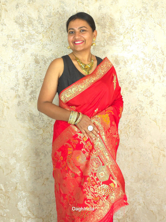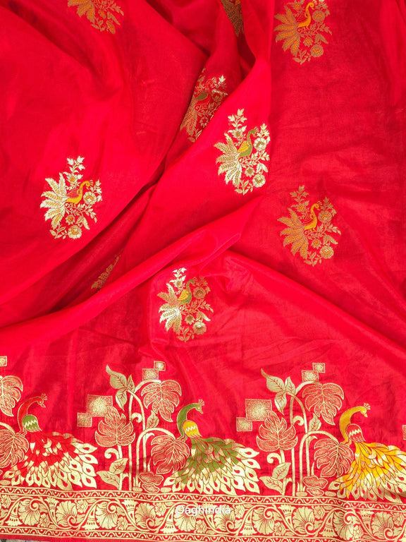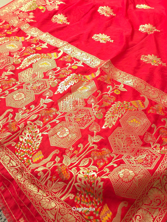 This red Katan silk Banarasi saree is adorned with intricate peacock and flower mina work on the body, making it a true work of art. 🦚🌸✨ The pallu showcases similar grand designs, creating a perfect balance of beauty and elegance. Ideal for festive occasions, this saree is a symbol of rich craftsmanship and timeless style.