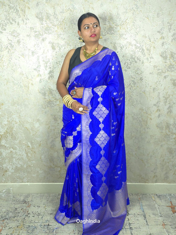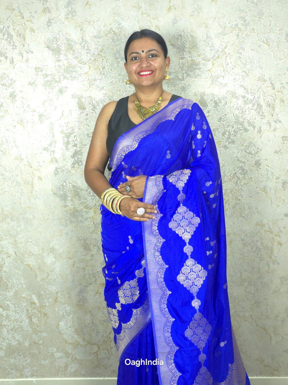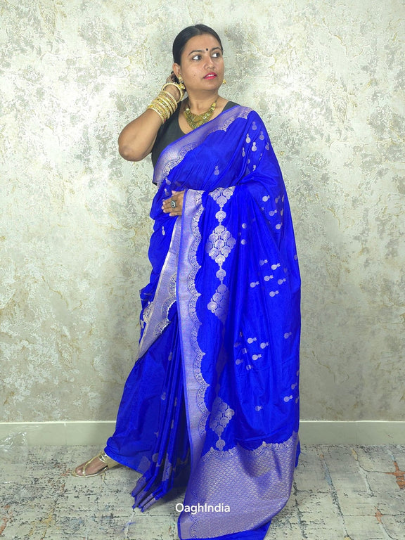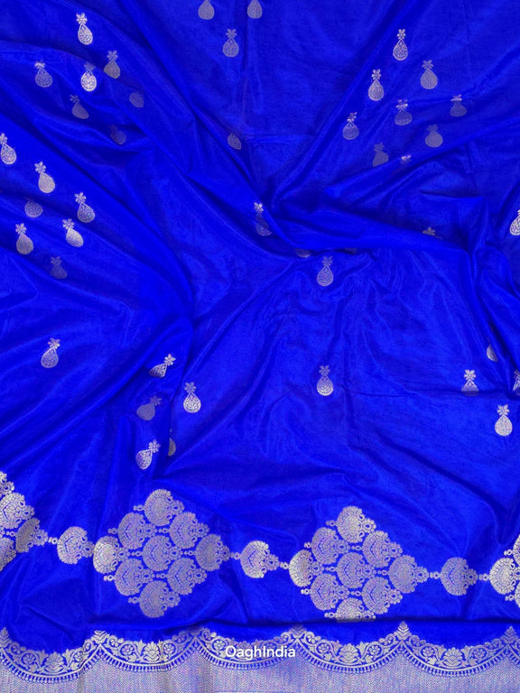 This gorgeous royal blue Mashru Banarasi saree features intricate silver pendent butis, adding a touch of elegance and charm. 💙✨ The rich blue color paired with the shimmering silver details creates a striking contrast, perfect for making a statement at any event. The luxurious fabric drapes beautifully, ensuring you look stunning for any occasion.