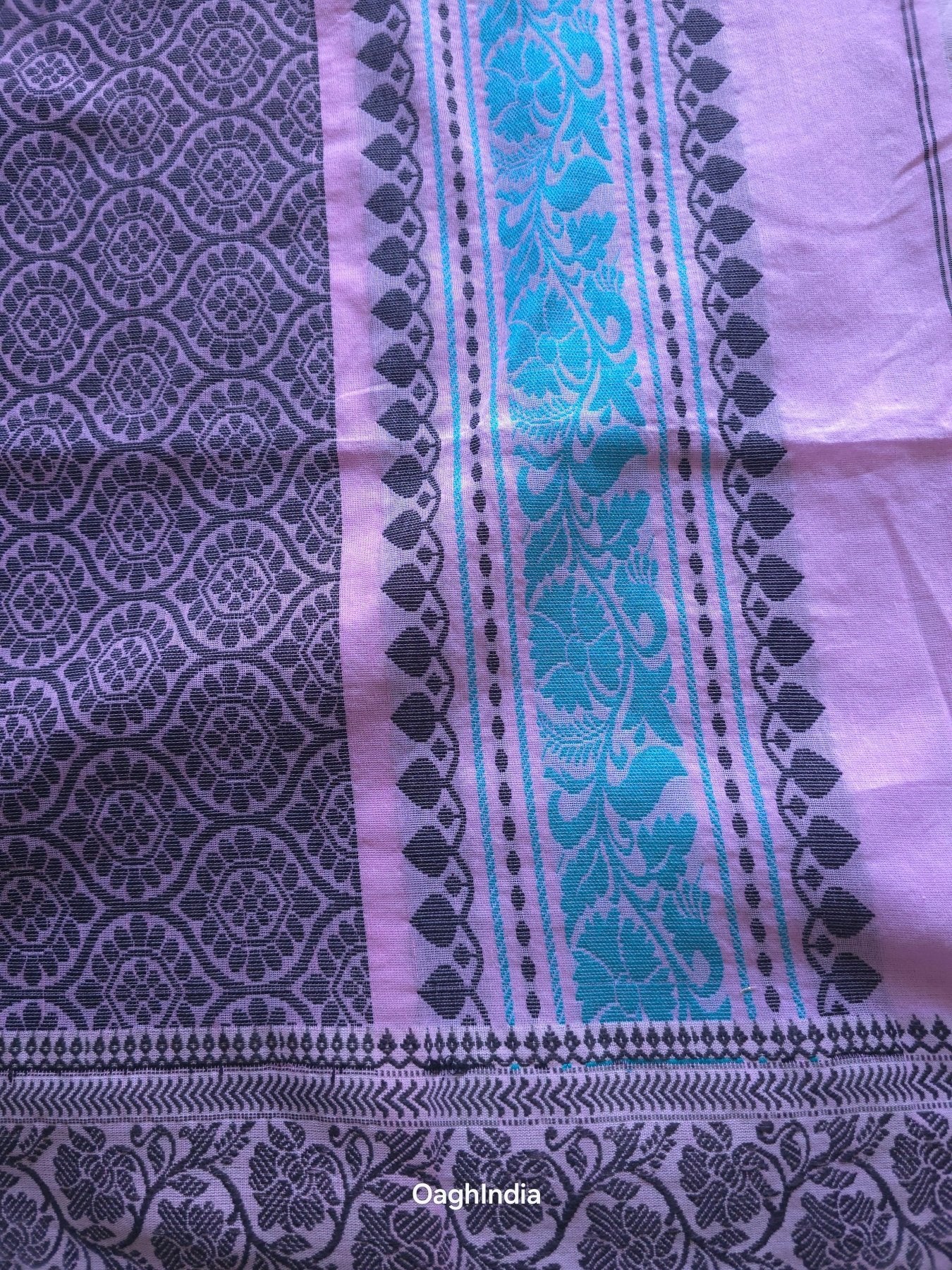 Border & Pallu: Finely detailed patterns in black and turquoise, inspired by traditional weaving styles, lending a statement finish.