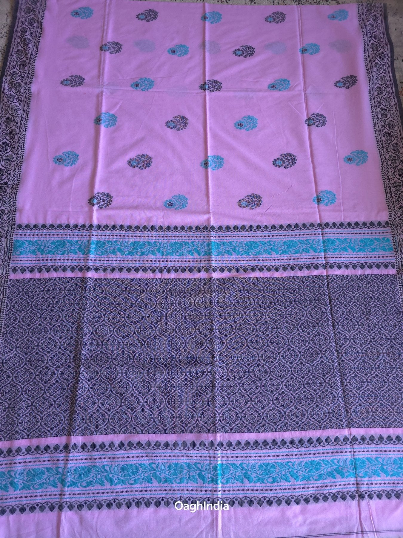 Design: Scattered floral buttas in turquoise blue and deep purple, creating a fresh and vibrant contrast.