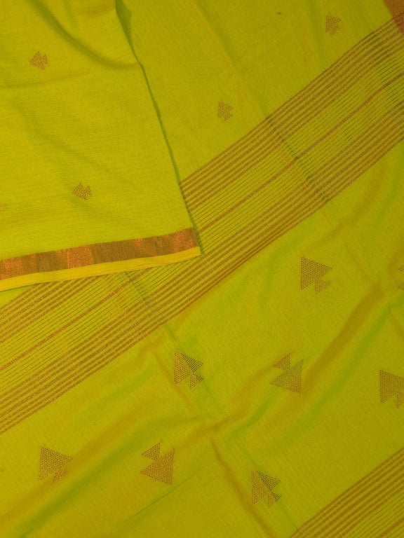 Bright as the first light after rain, Saanjh brings with it joy, warmth, and a touch of tradition. This radiant yellow handwoven cotton saree is adorned with copper zari fish motifs across the body — timeless symbols of prosperity and flow. The borders and pallu are detailed with fine copper zari stripes, catching the light in just the right way without overpowering the simplicity of the weave.