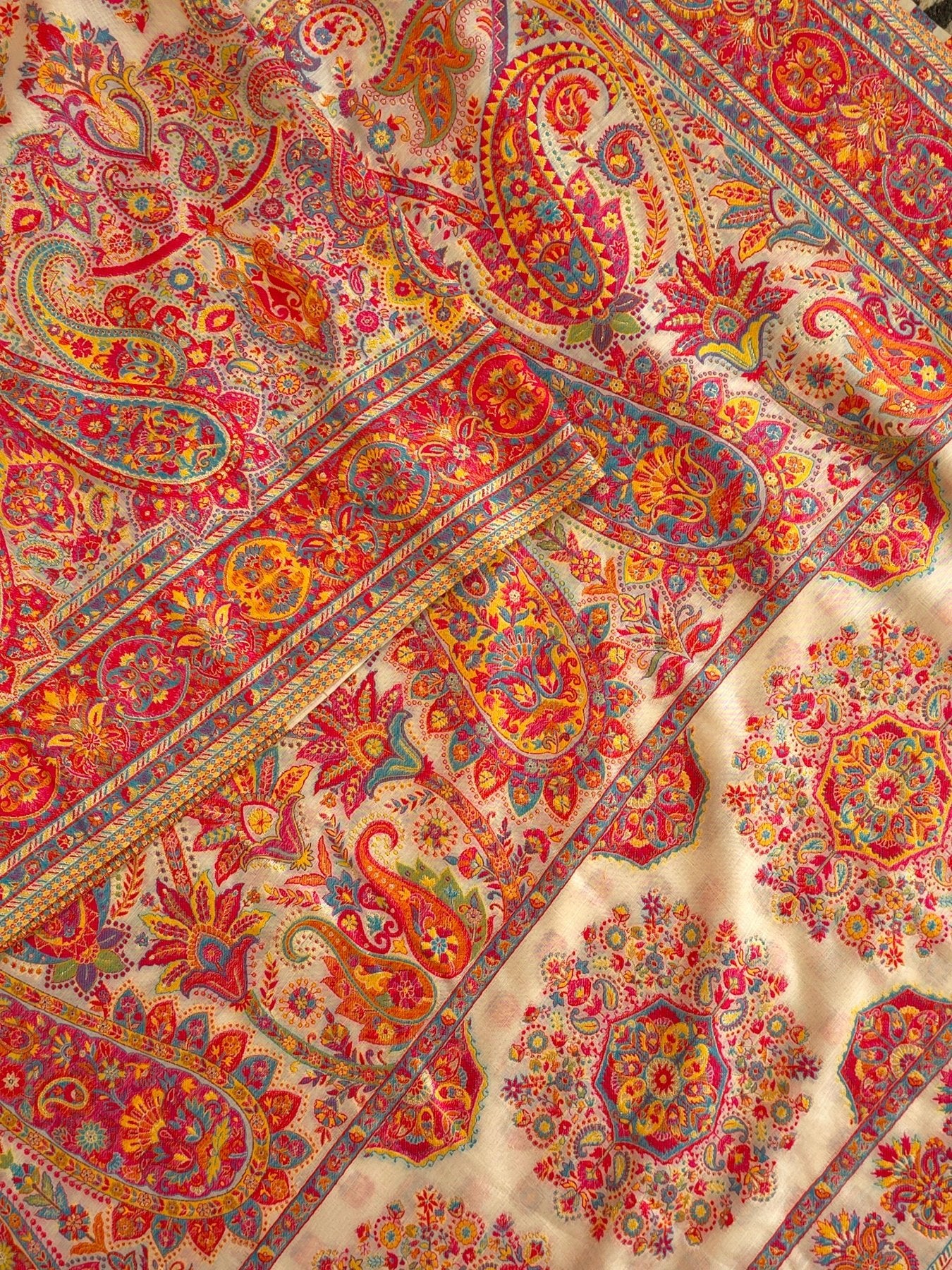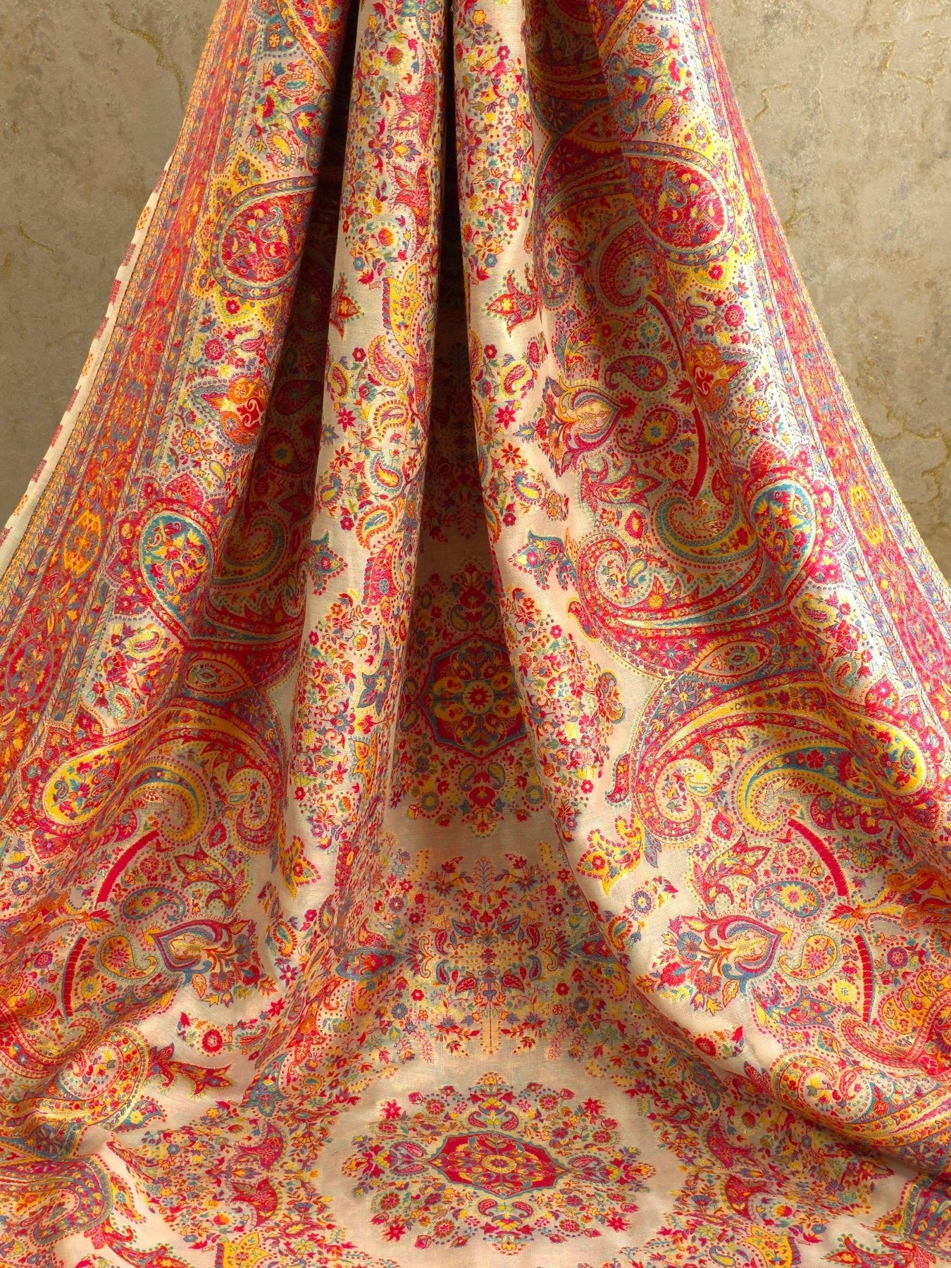 Drape yourself in Shahzadi, a saree worthy of royalty — rich in tradition, poetry. With a pristine ivory base, this Jamawar weave bursts into a breathtaking garden of paisleys, florals, and Mughal-inspired motifs in vibrant hues of pink, saffron, turquoise, and gold.