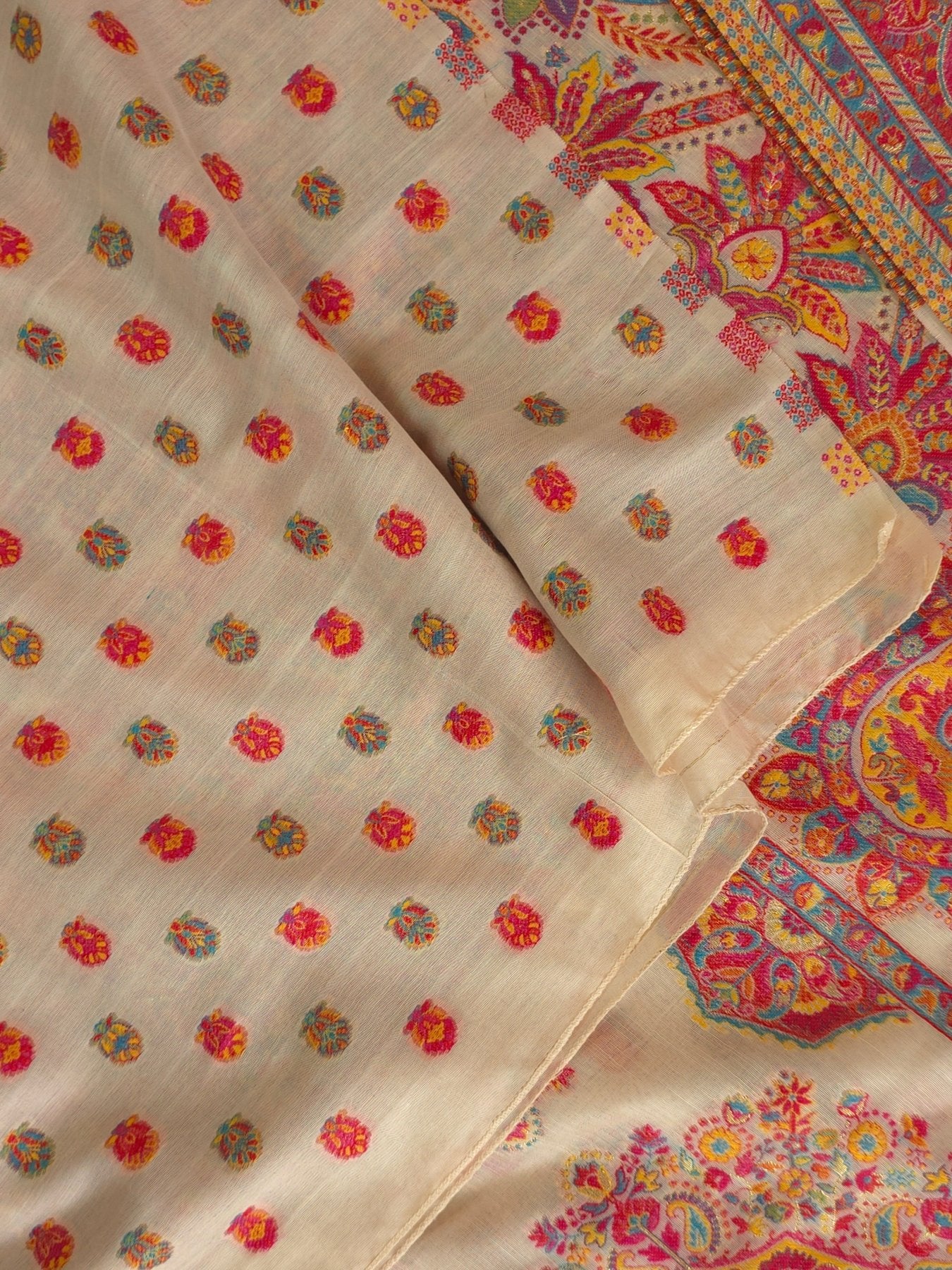 Crafted from a blend of fine Kashmiri silk and cotton, this powerloom Jamawar saree offers a soft, luxurious fall with a dense, brocade-like weave. The texture, finish, and multicolored artistry make it an heirloom for generations.